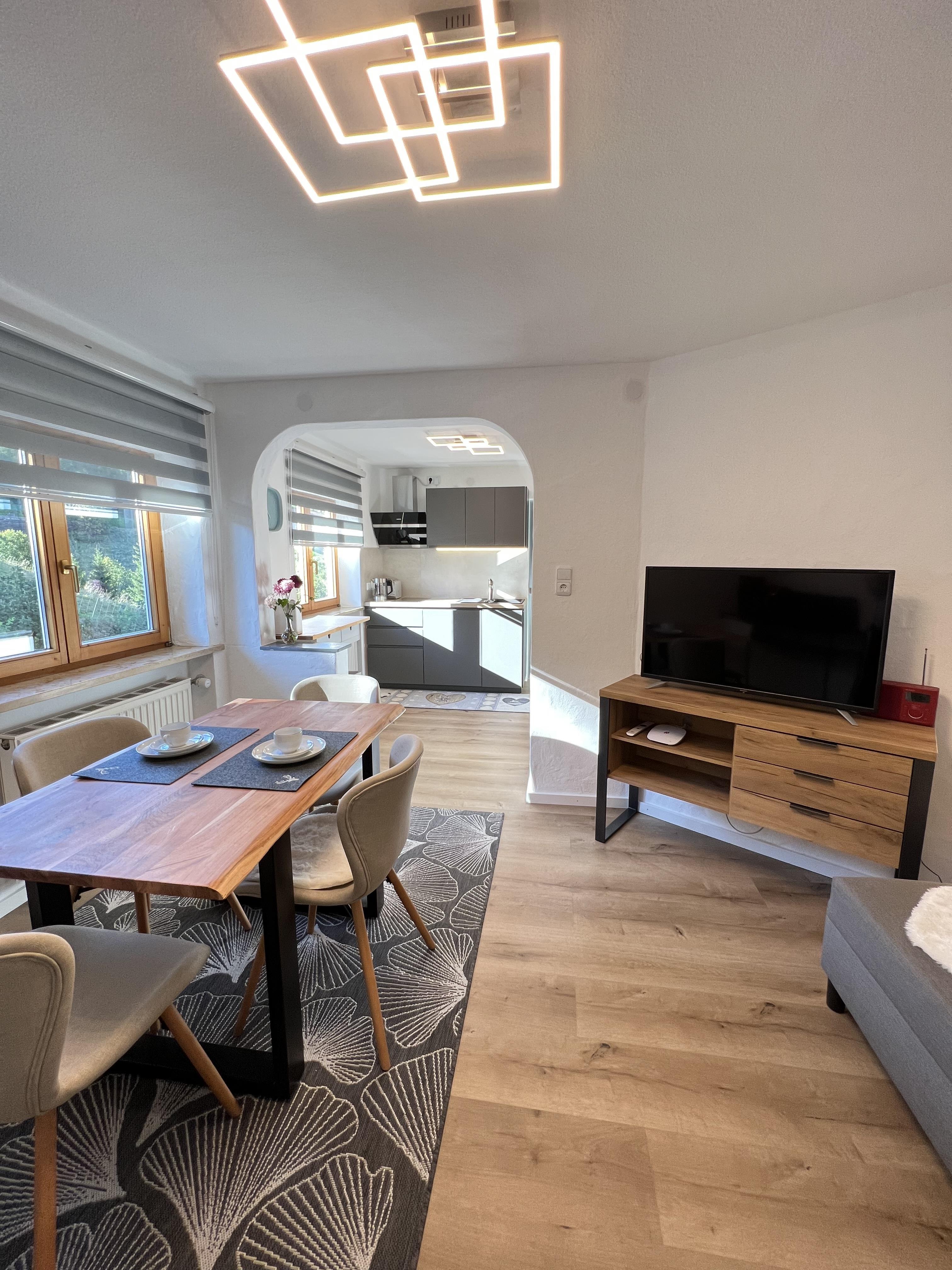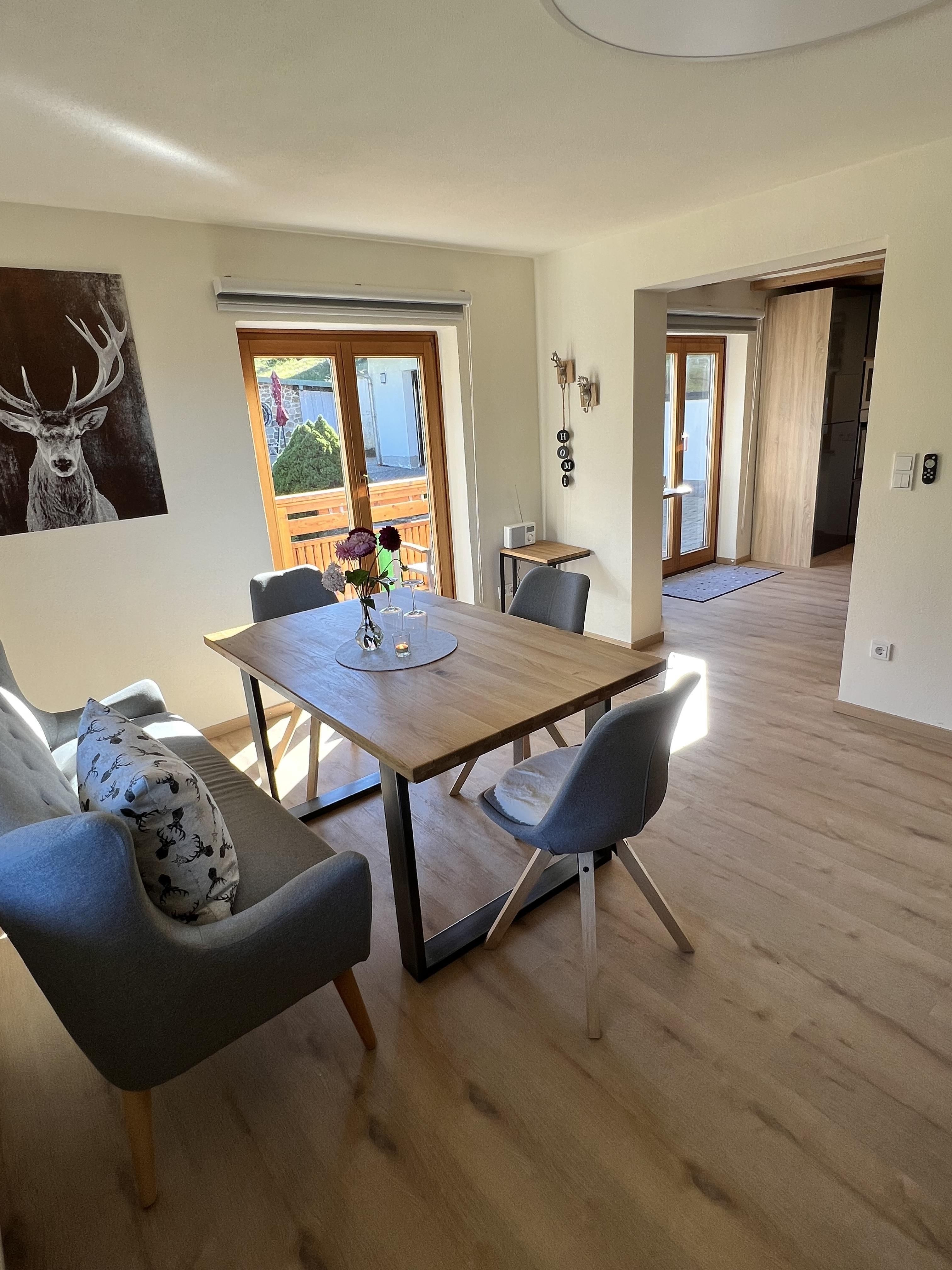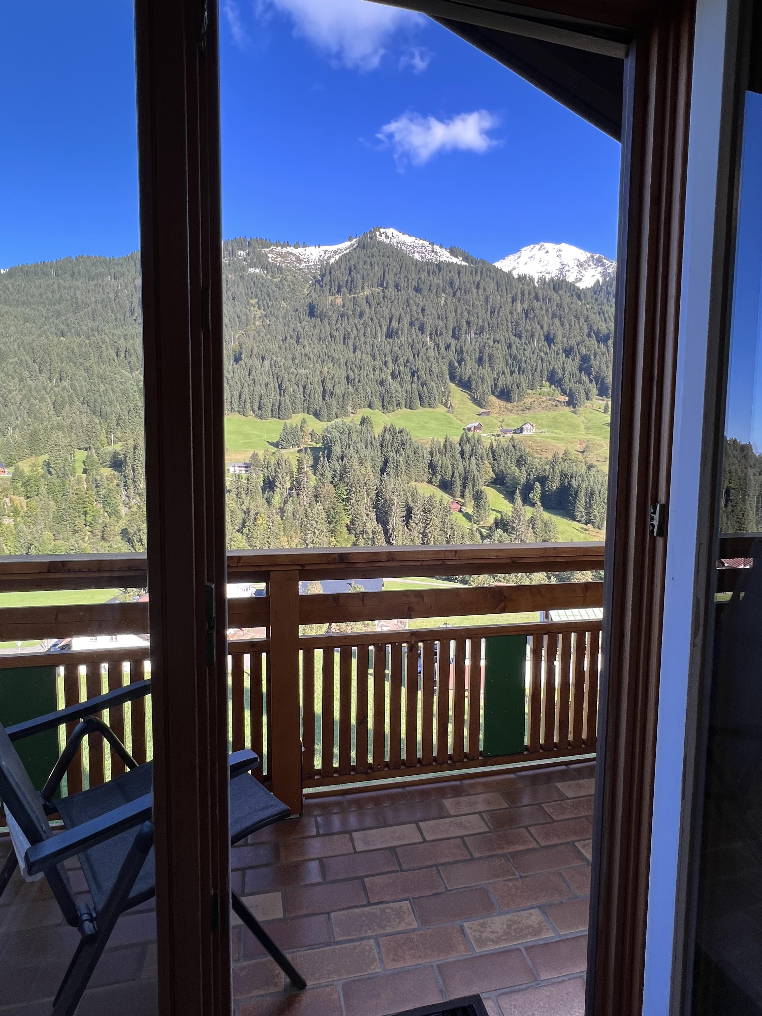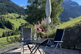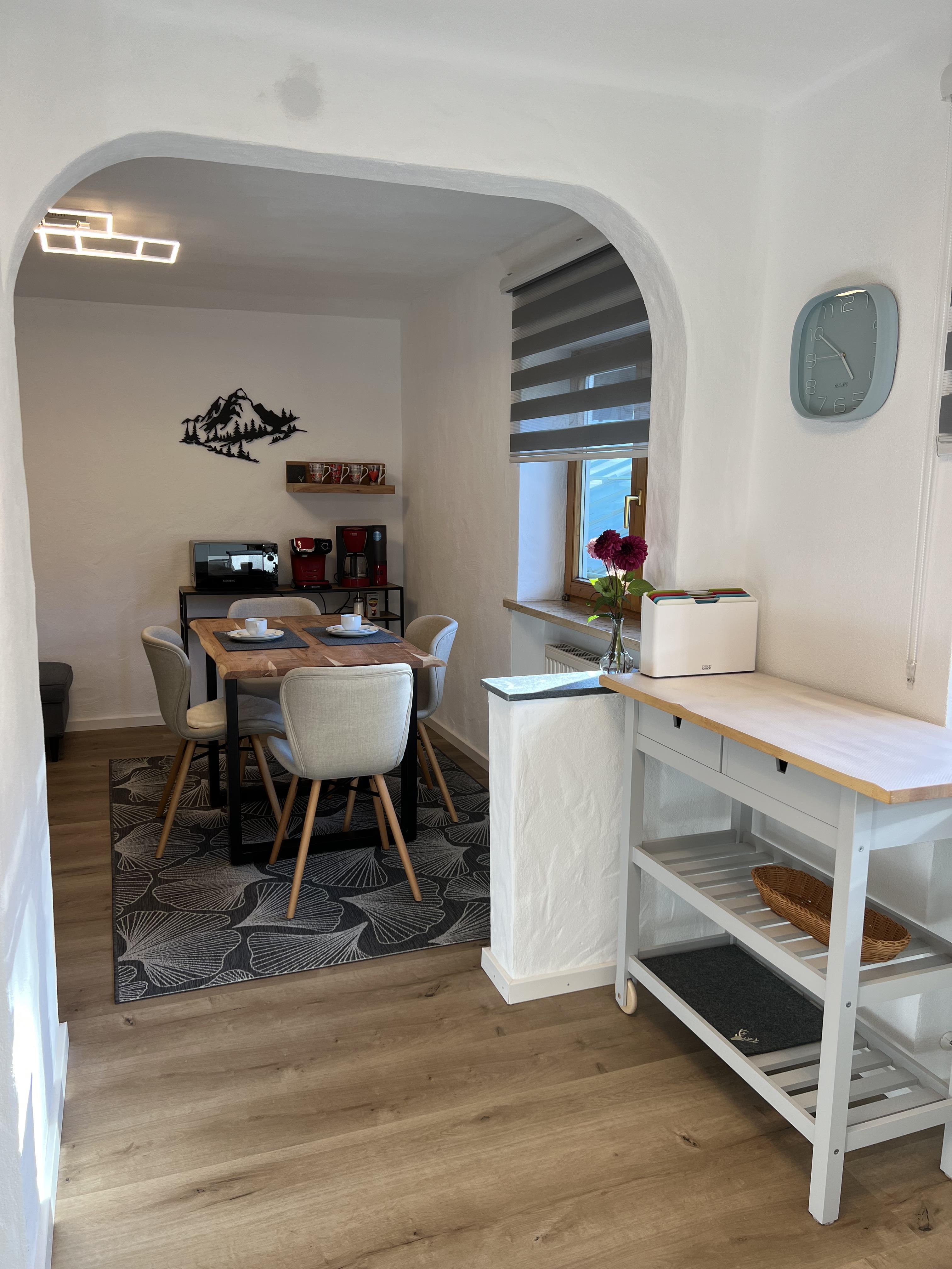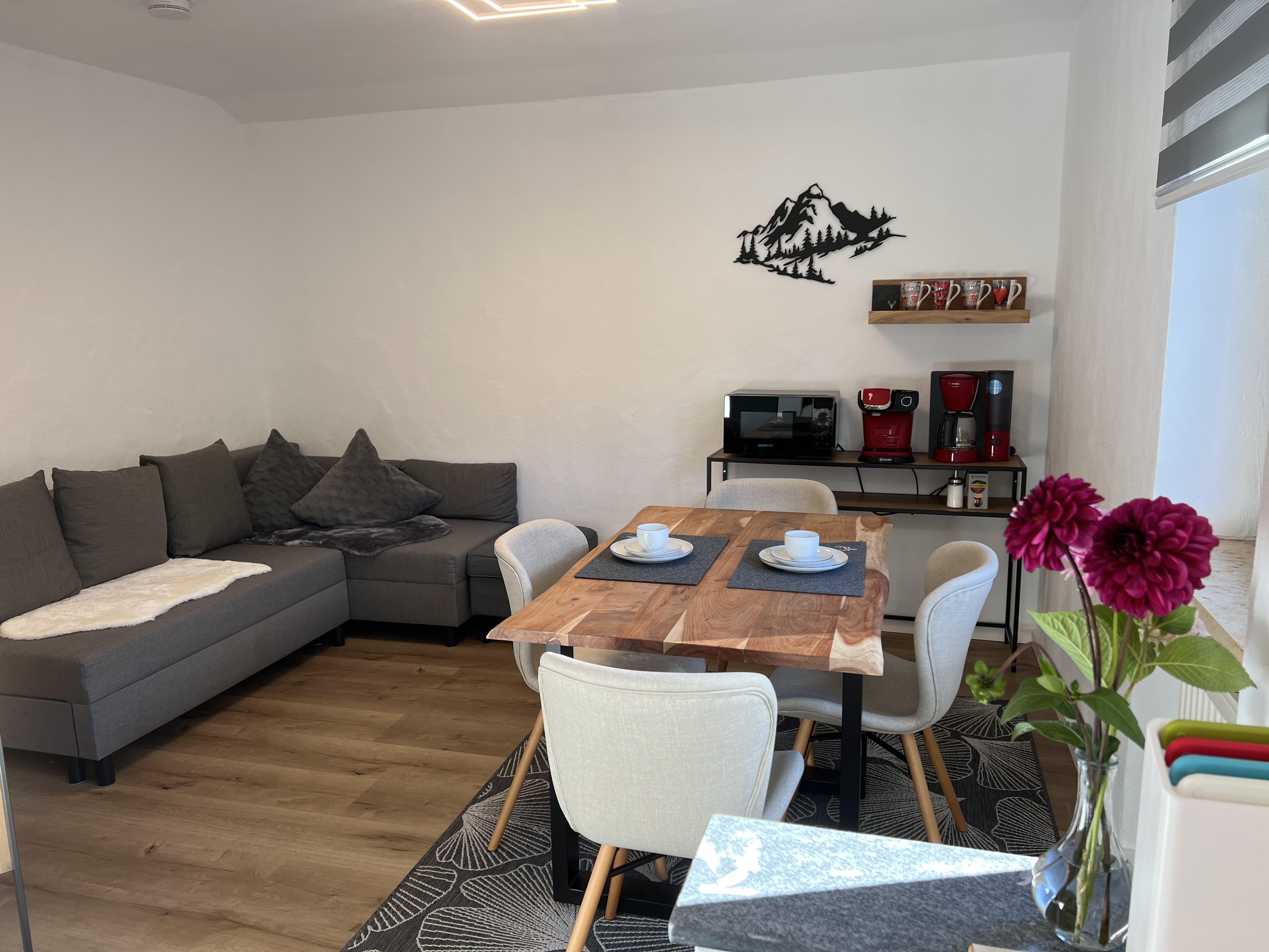 Schöne Ferienwohnung im Obergeschoss (renoviert 2022) mit Dusche/WC, Küchenzeile mit Kühlschrank/Gefrierfach, Geschirrspülmaschine, TASSIMO Kapsel-Maschine, Wasserkocher, Toaster und 2er Touch Control Cerankochfeld. Wohnbereich mit Massivholztisch, Fernseher mit A1-TV-Box und Schlafsofa. Abgetrennter Balkon am Schlafzimmer in Richtung Osten mit Klapptisch und zwei Stühlen. Eigene Terrasse im Garten mit Gartenmöbeln und tollem Ausblick in die Walser Berge.