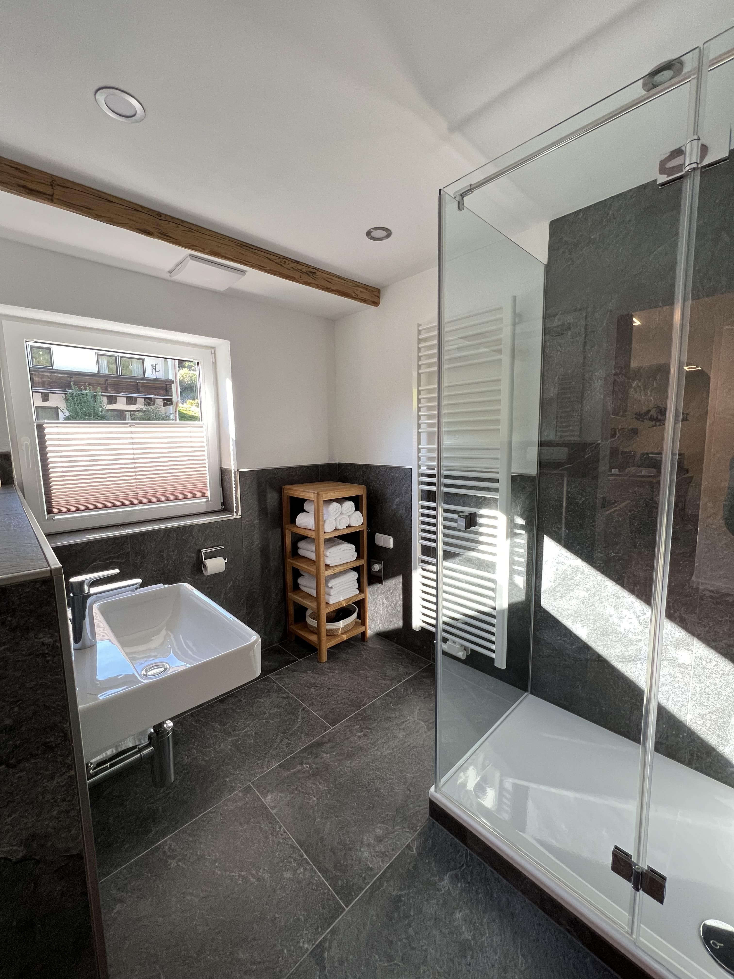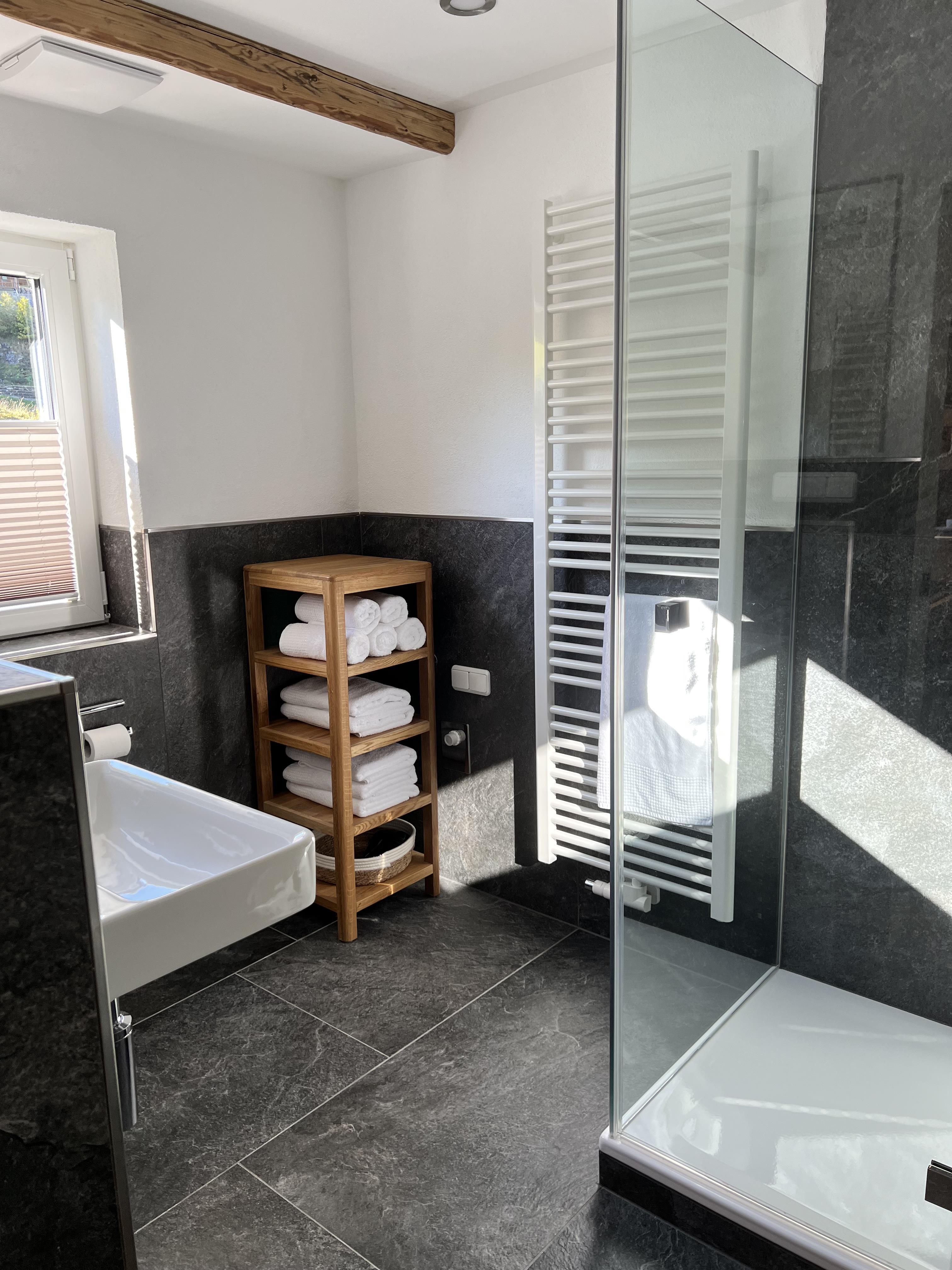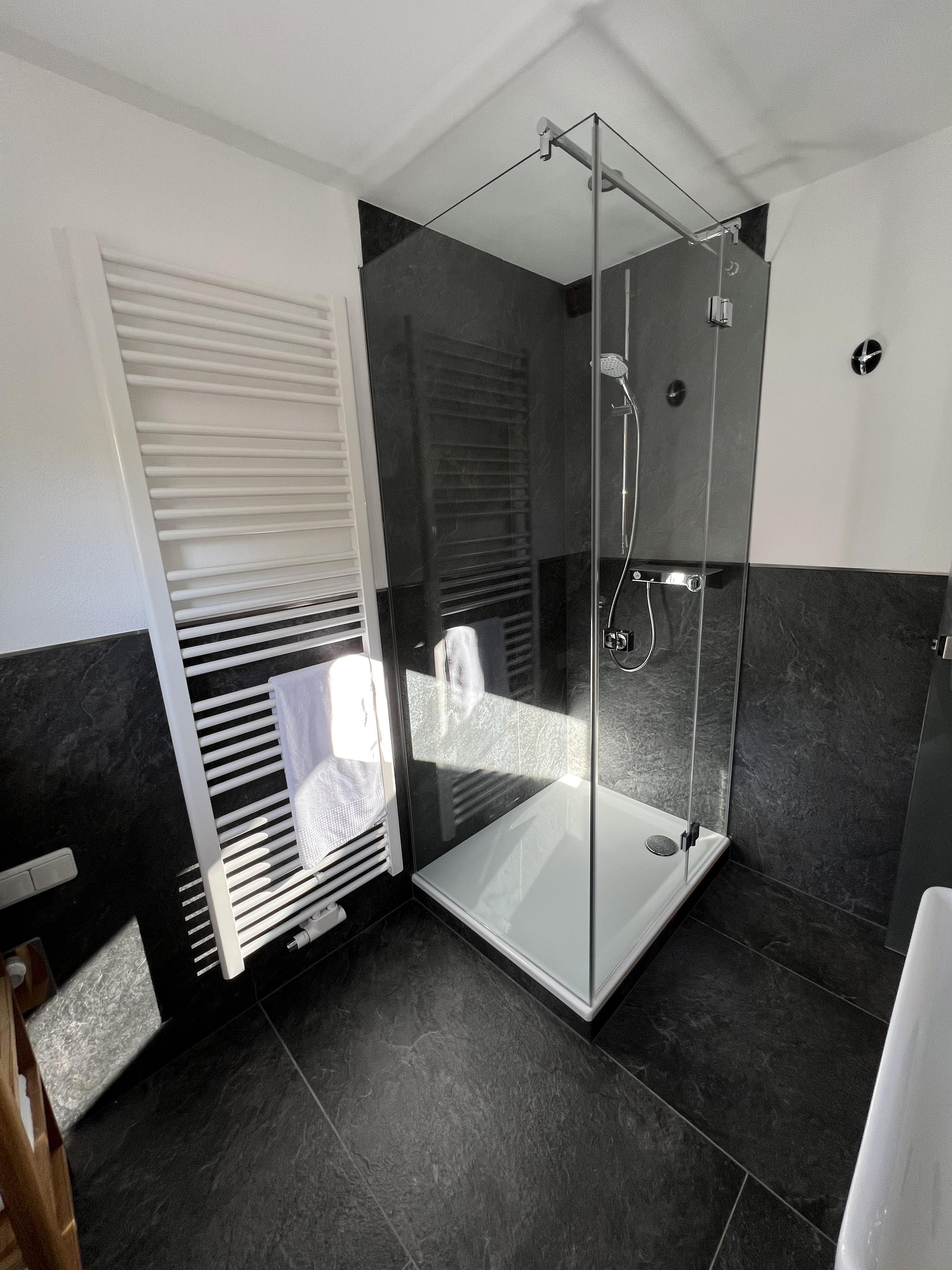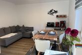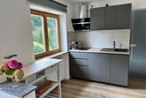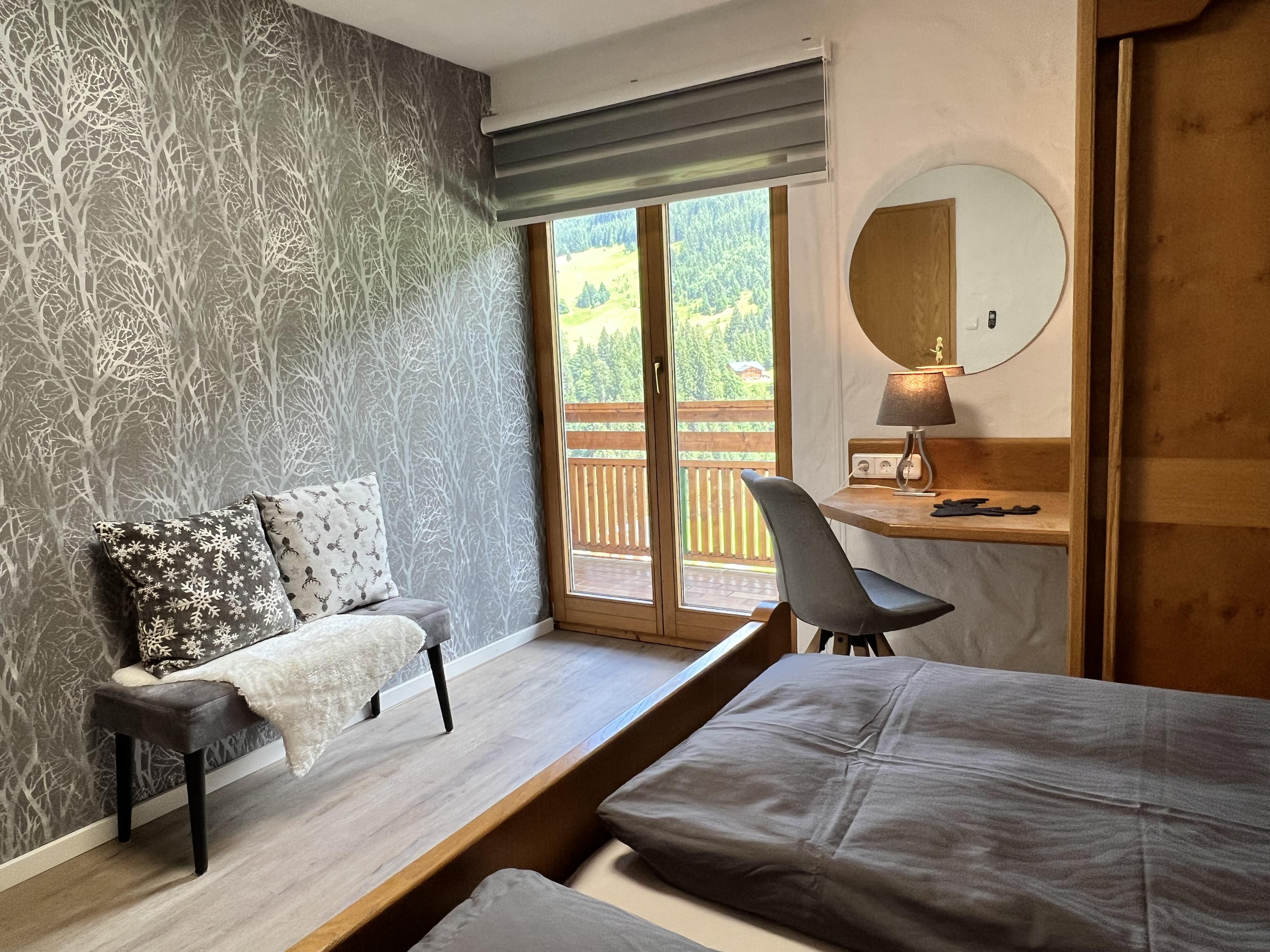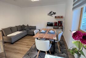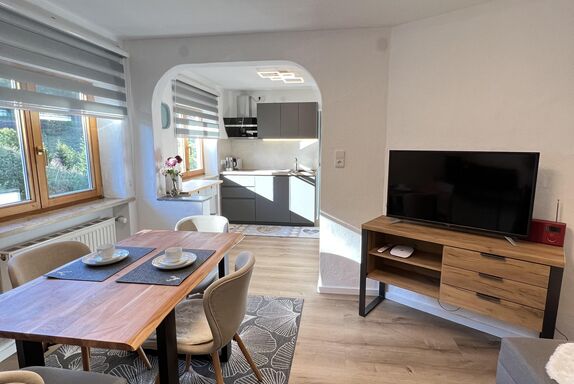 Schöne Ferienwohnung im Obergeschoss (renoviert 2022) mit Dusche/WC, Küchenzeile mit Kühlschrank/Gefrierfach, Geschirrspülmaschine, TASSIMO Kapsel-Maschine, Wasserkocher, Toaster und 2er Touch Control Cerankochfeld. Wohnbereich mit Massivholztisch, Fernseher mit A1-TV-Box und Schlafsofa. Abgetrennter Balkon am Schlafzimmer in Richtung Osten mit Klapptisch und zwei Stühlen. Eigene Terrasse im Garten mit Gartenmöbeln und tollem Ausblick in die Walser Berge.