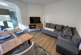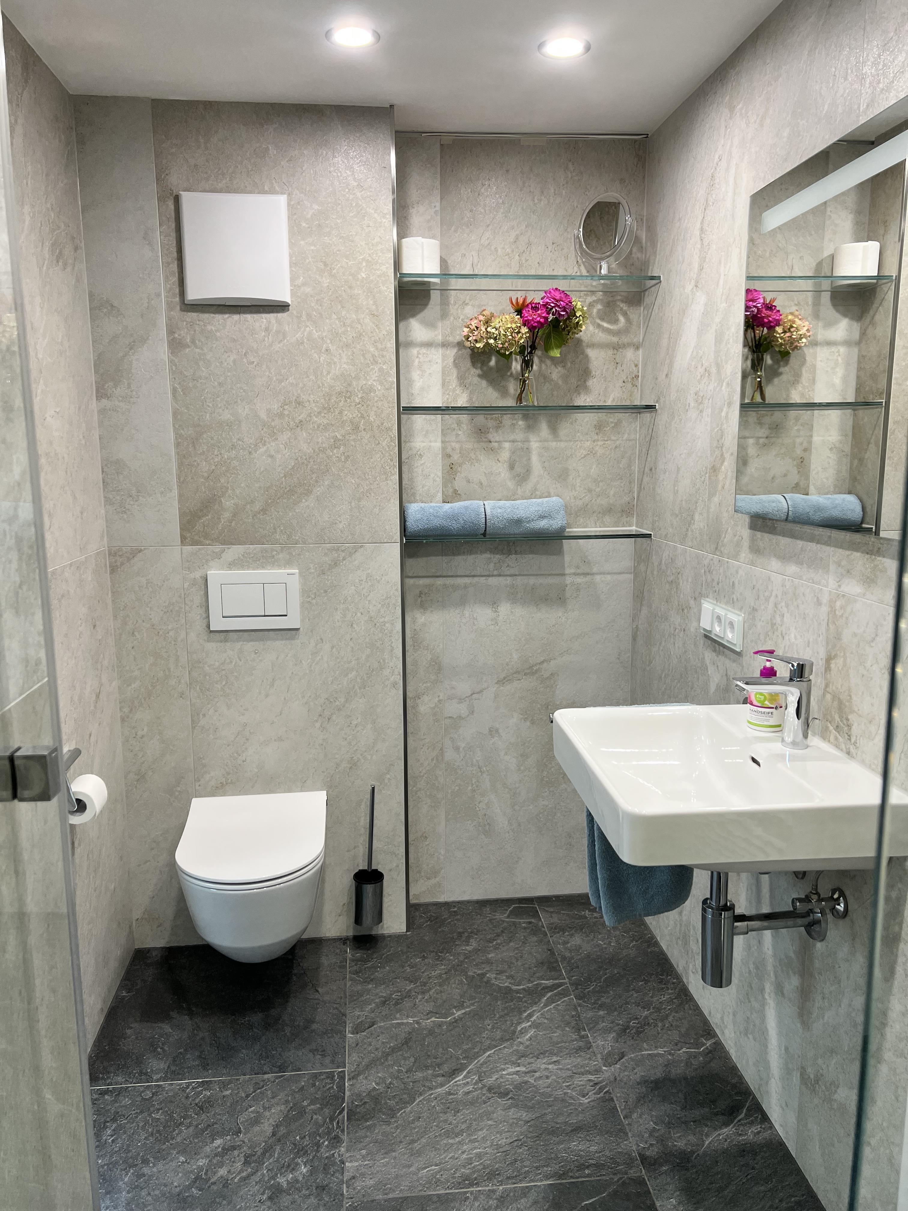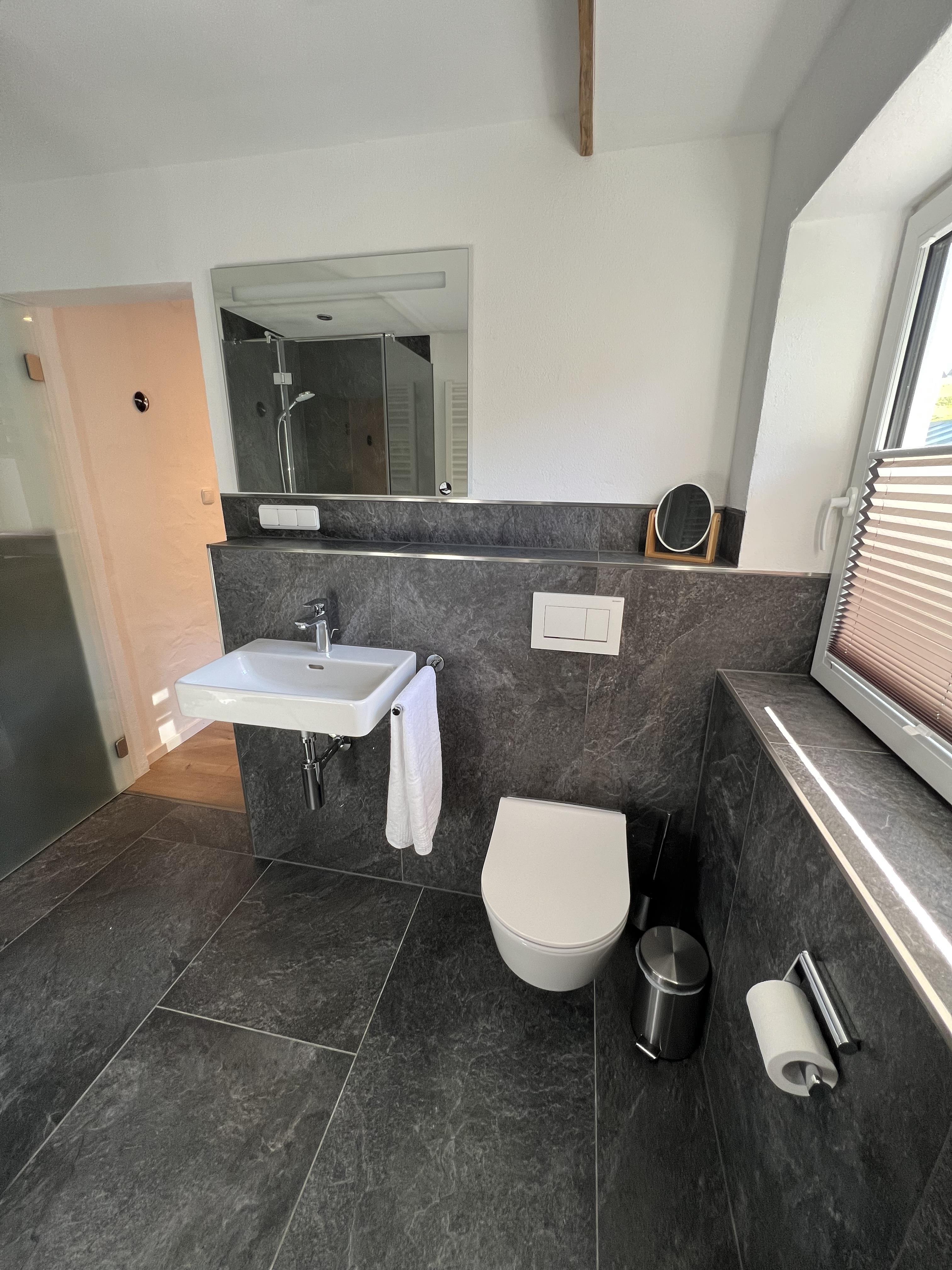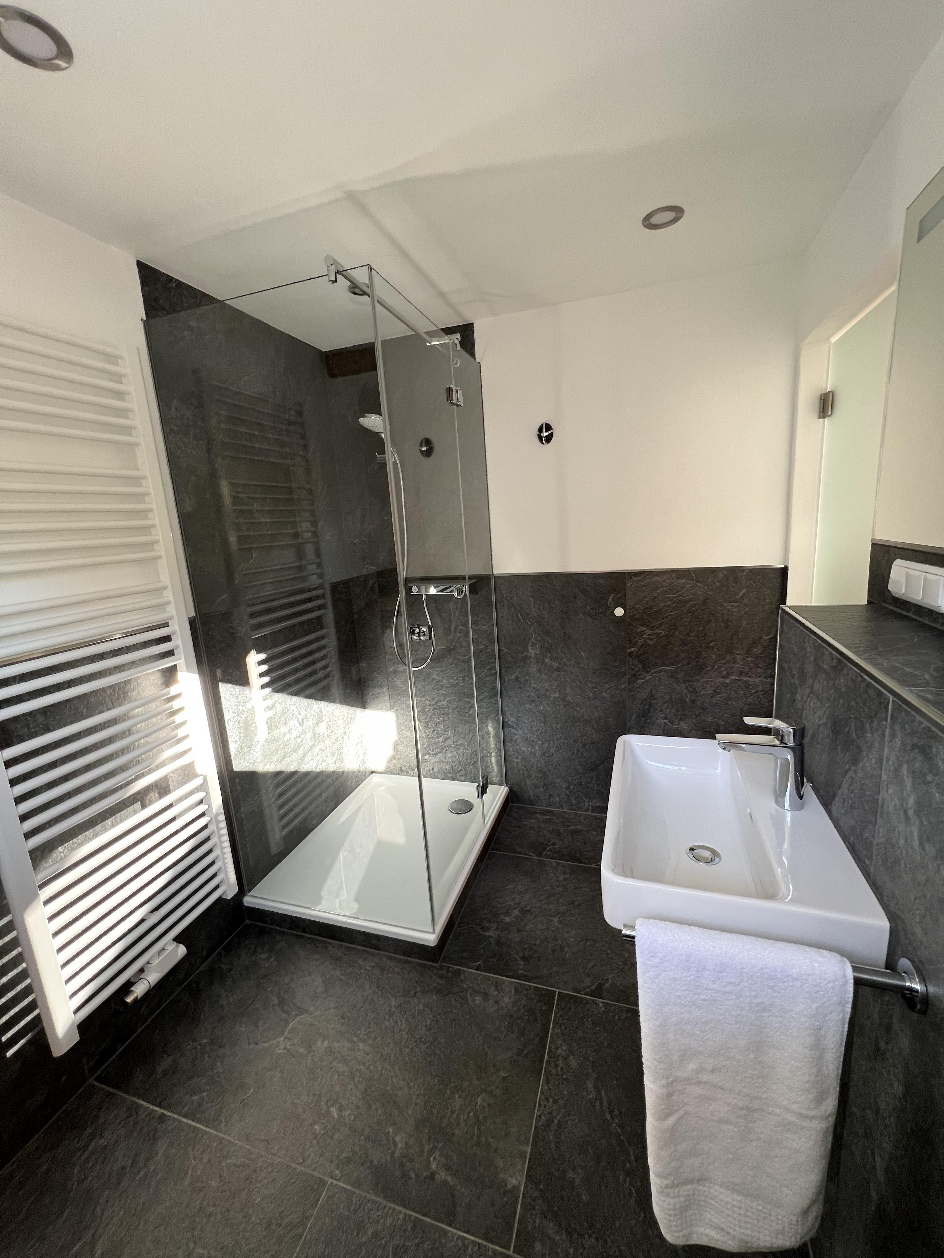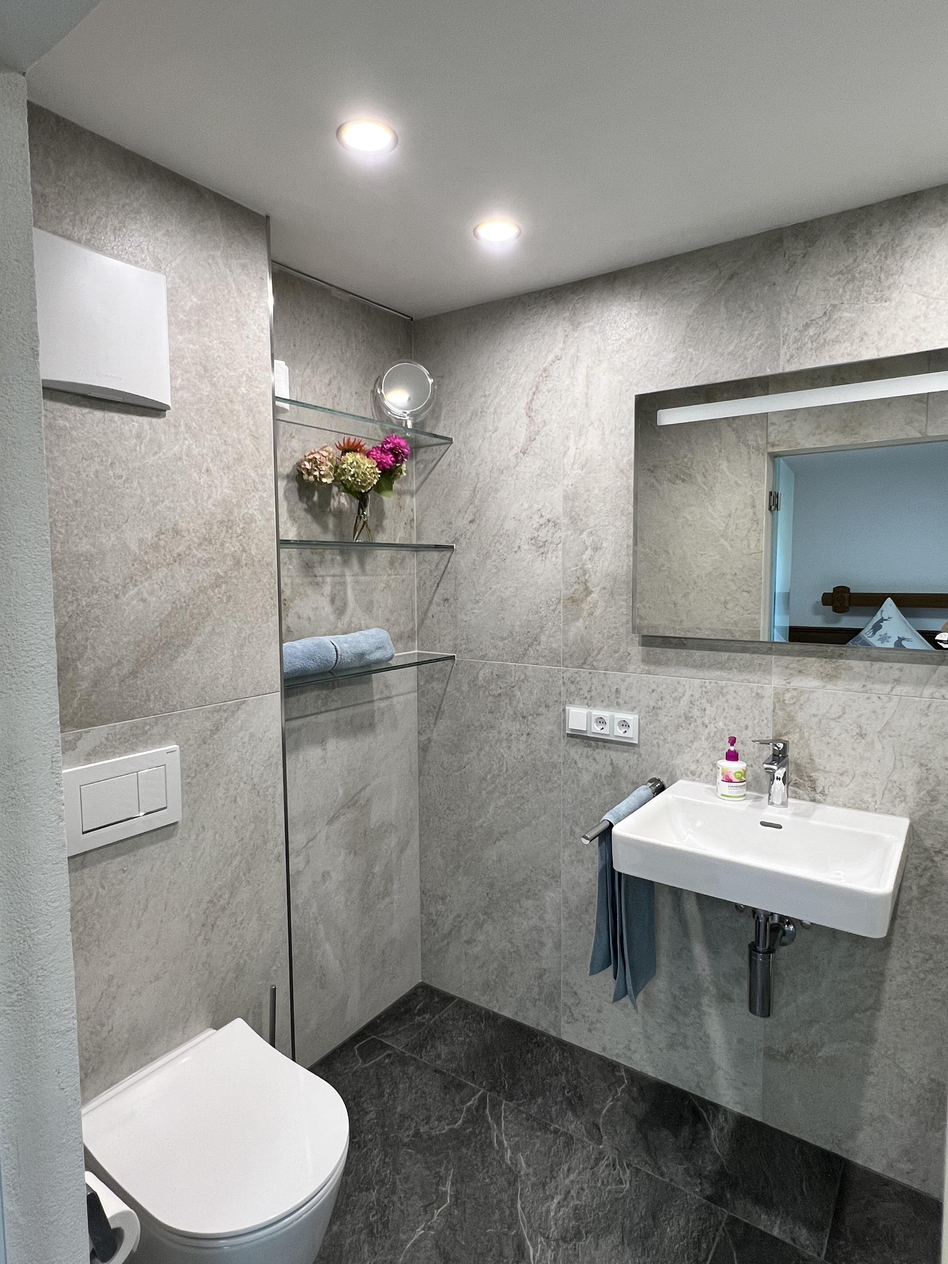 Schöne Ferienwohnung im Obergeschoss (renoviert 2022) mit Dusche/WC, Küchenzeile mit Kühlschrank/Gefrierfach, Geschirrspülmaschine, TASSIMO Kapsel-Maschine, Wasserkocher, Toaster und 2er Touch Control Cerankochfeld. Wohnbereich mit Massivholztisch, Fernseher mit A1-TV-Box und Schlafsofa. Abgetrennter Balkon am Schlafzimmer in Richtung Osten mit Klapptisch und zwei Stühlen. Eigene Terrasse im Garten mit Gartenmöbeln und tollem Ausblick in die Walser Berge.