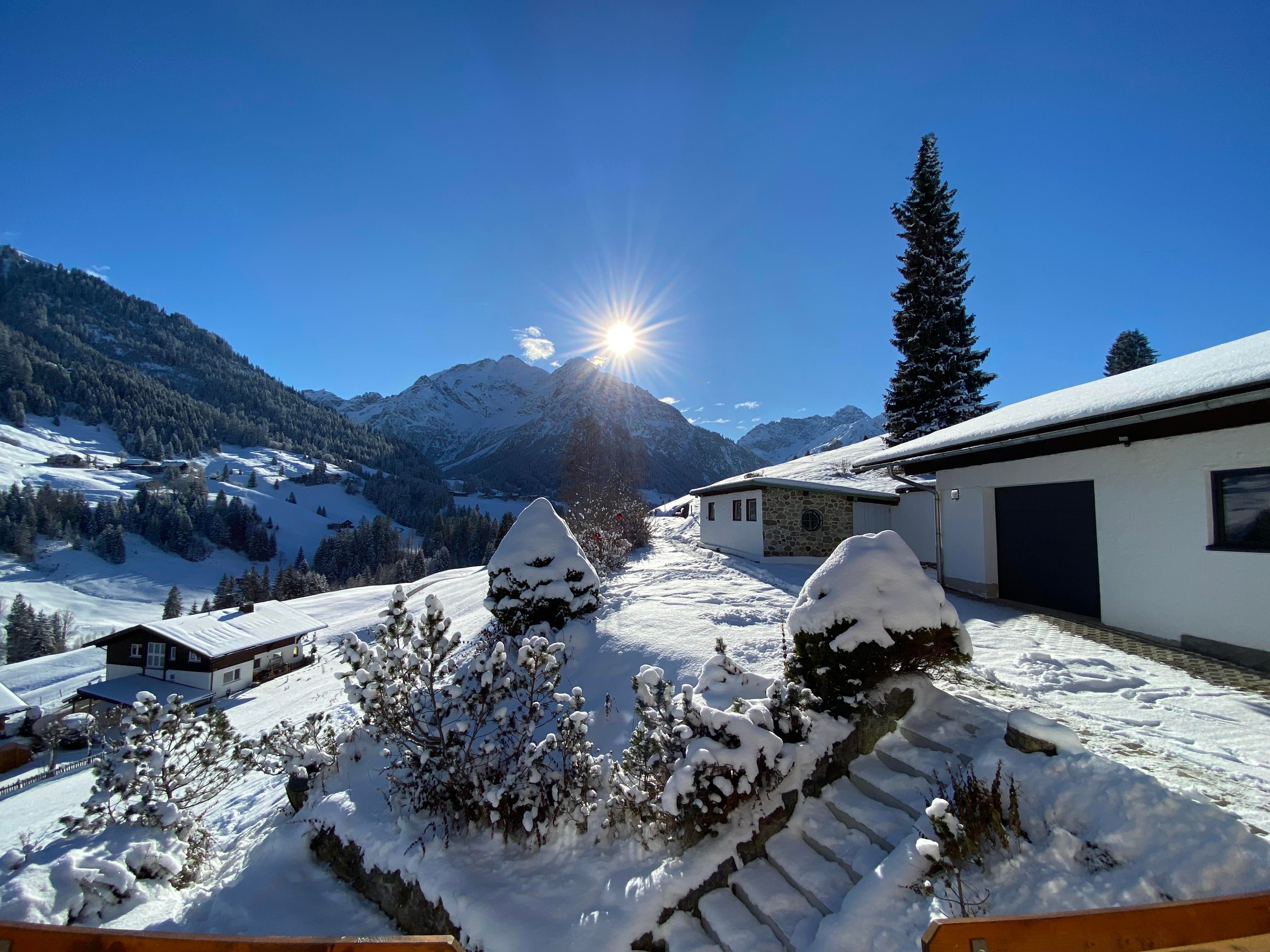 Schöne Aussichtslage auf Anhöhe in der Talmitte mit ca. 10 Gehminuten zur Bushaltestelle (kostenloser Walserbus). Walserhaus und Skilift Heuberg ca. 12 Gehminuten (bei Verfügbarkeit auch Depot für gesamte Skiausrüstung am Lift mietbar). Kostenloser PKW-Stellplatz am Haus. Abstellraum mit Fahrradständer (Steckdose für E-Bike) und für Skiausrüstung. Optional Garage mit Wallbox für Elektroauto buchbar. Im Winter können ggf. Schneeketten für die Zufahrt erforderlich sein. Haus in 2022 renoviert.