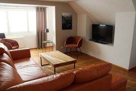• 1 geräumiges Wohnzimmer mit Fernseher