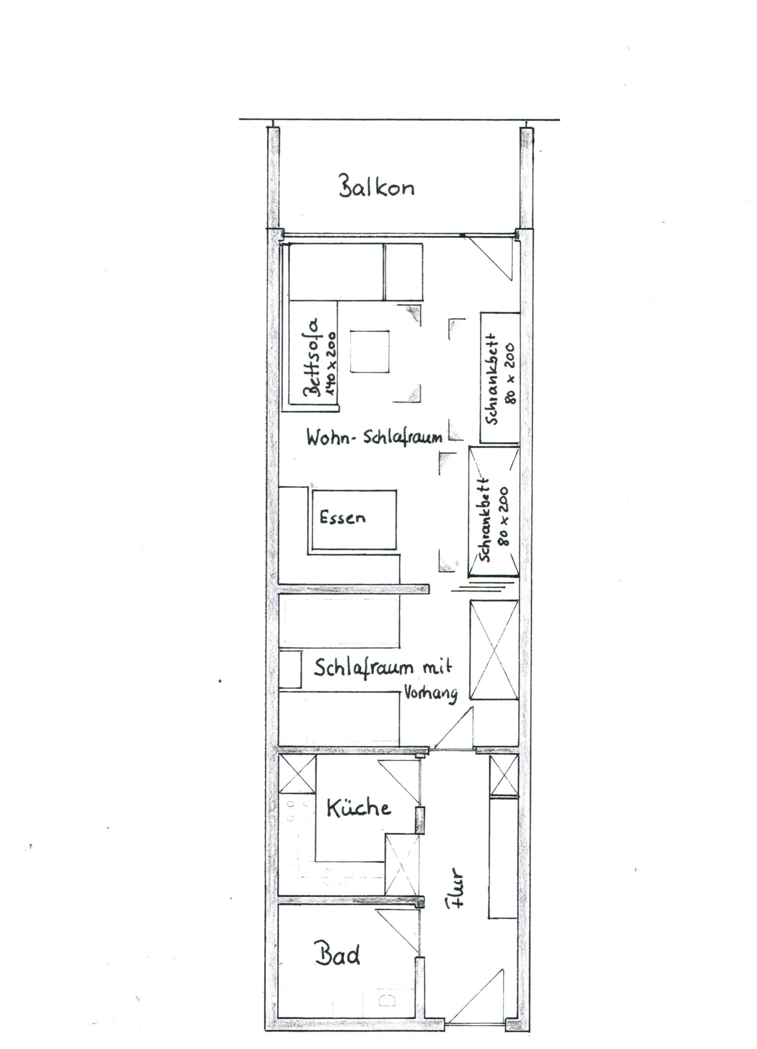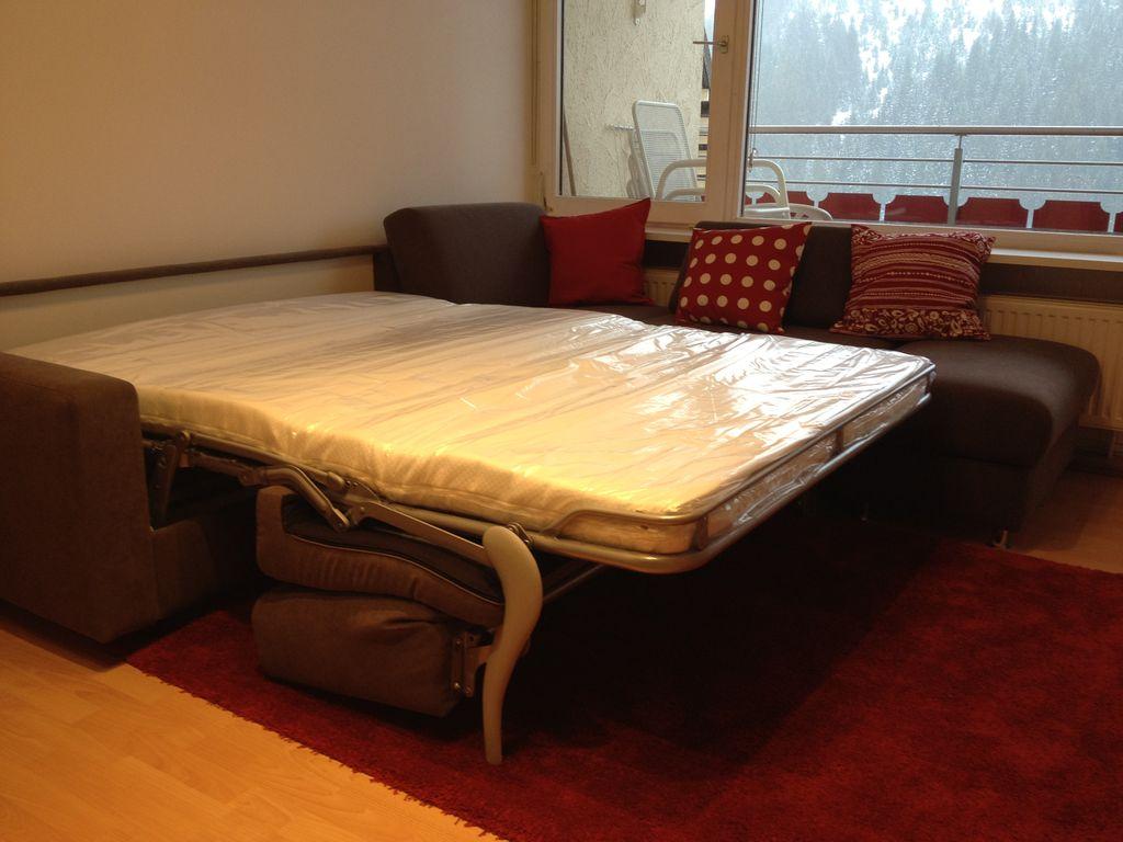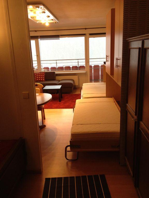 Unsere gemütliche Ferienwohnung (55 m²) befindet sich im 5. Stock des Aparthotels und ist mit dem Aufzug bequem erreichbar. Im offenen Wohn/Schlafraum stehen bis zu 6 Schlafplätze zur Verfügung (Zwei Einzelbetten durch einen Vorhang getrennt, ein Doppelschlafsofa mit Federkernmatraze (140 x 200 cm) und zwei Einzelschrankbetten zum Ausklappen. Zum Ausspannen und Erholen lädt das im Haus befindliche Hallenbad und der Wellnessbereich ein. Das Badezimmer besteht aus Dusche/WC, Handtuchtrockner, Badschränkchen, Haarfön, und ist komplett renovieret worden. Wanderwege im Sommer und Winter, Skilifte, Langlaufloipe, Bushaltestelle, Einklaufsmöglichkeiten, Restaurants, Sportverleih und Sportgeschäfte befinden sich ganz in der Nähe und sind fußläufig gut zu erreichen. Skischule, Skiverleih, Restaurant und Hotelbar befinden sich direkt im Haus.