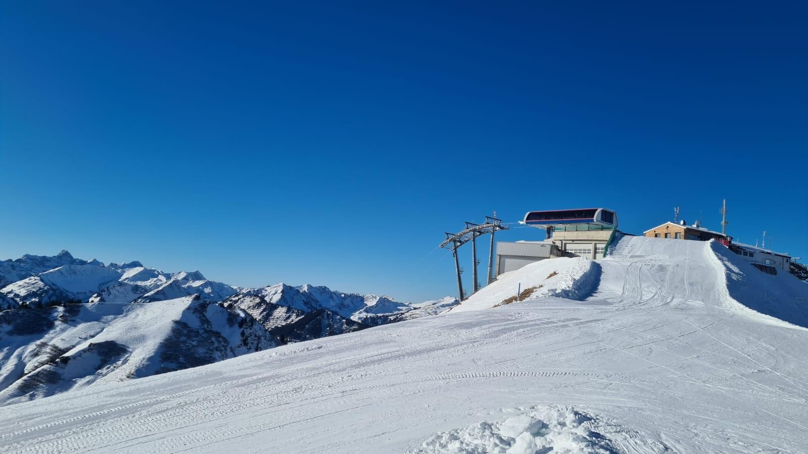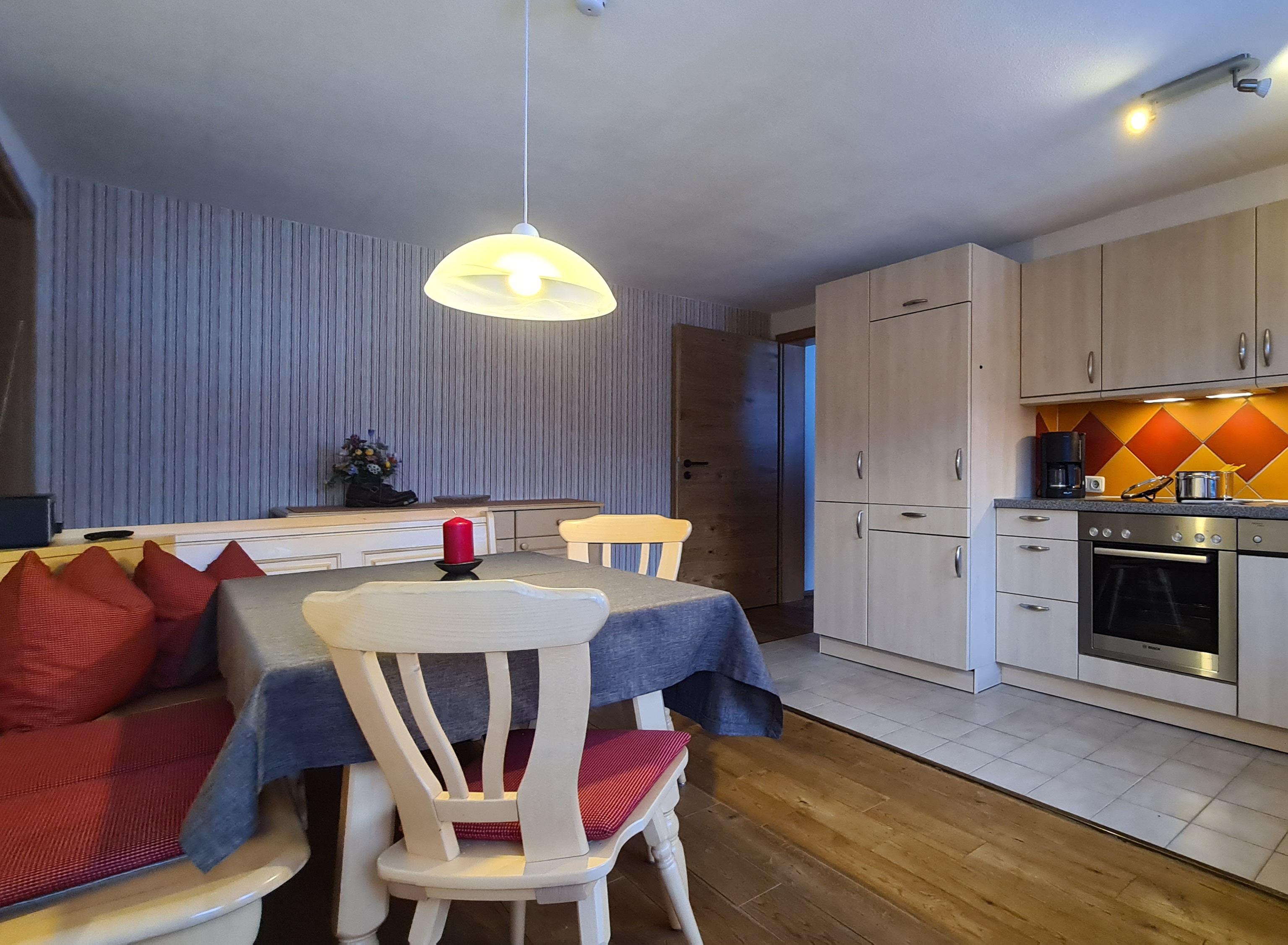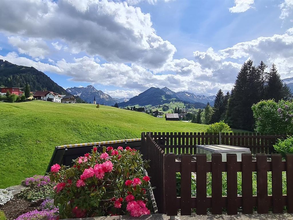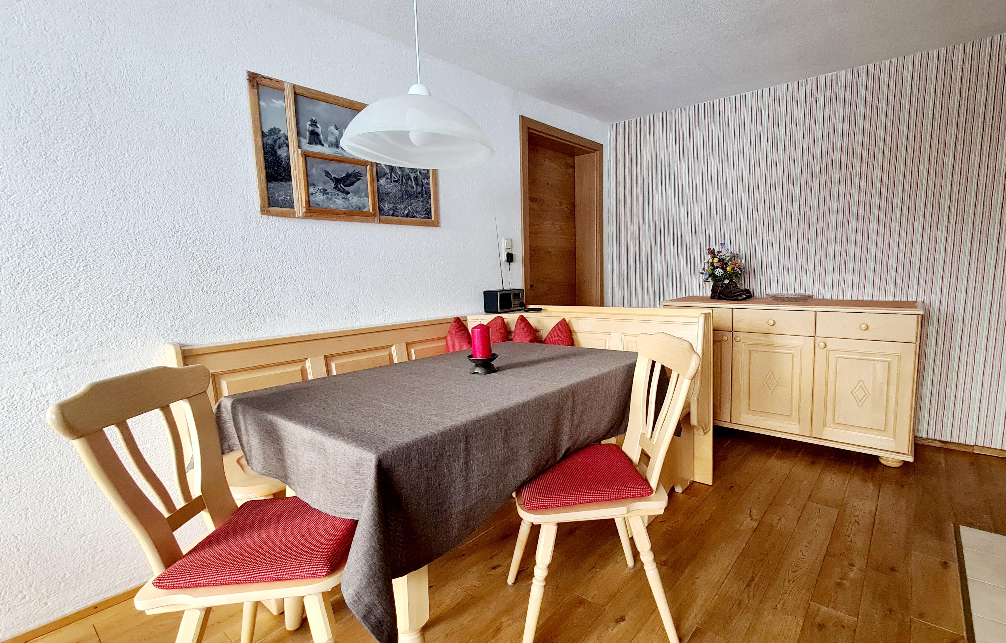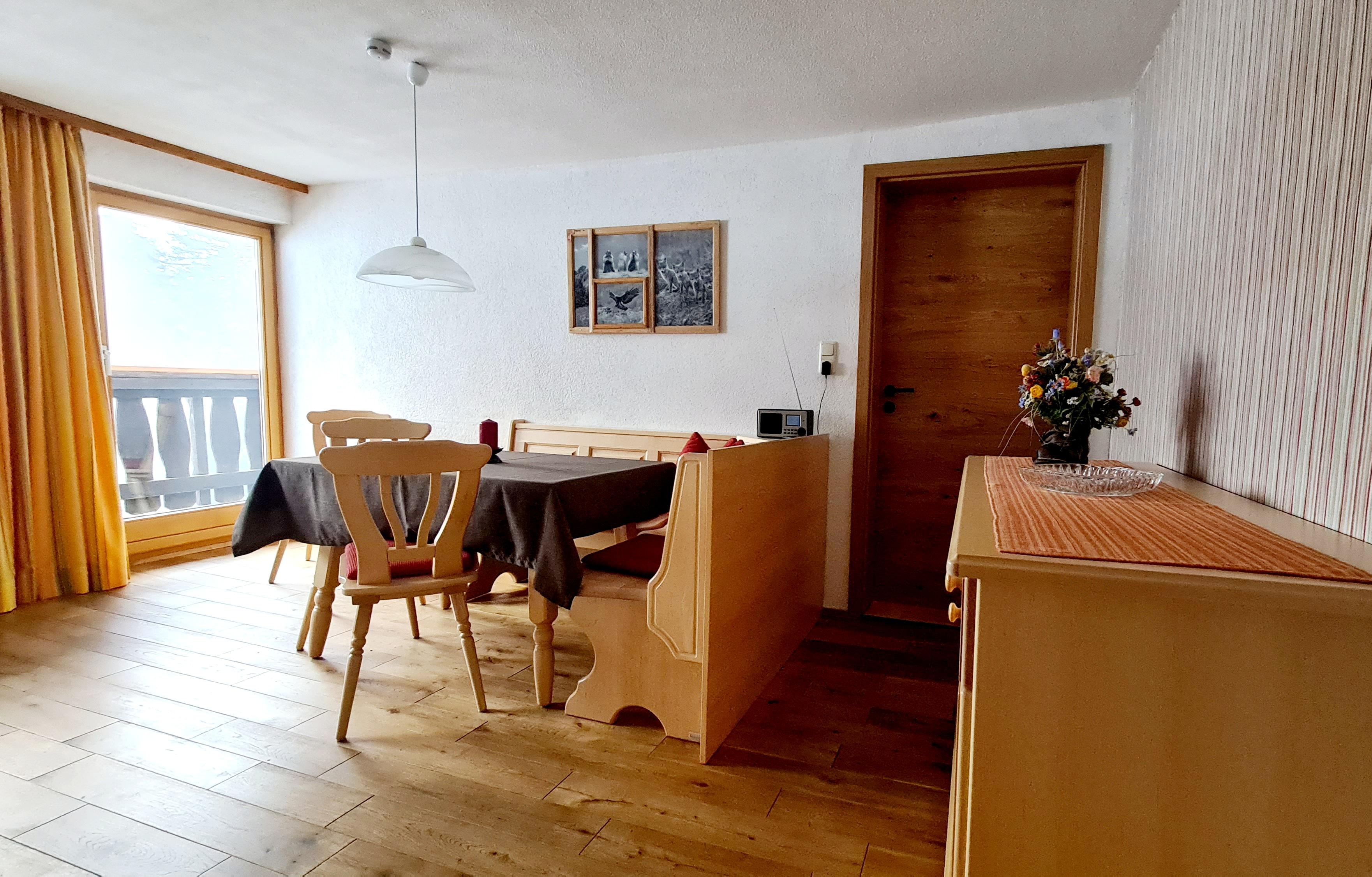 Essecke mit Blick auf die Kleinwalsertaler Berge mit Balkon.