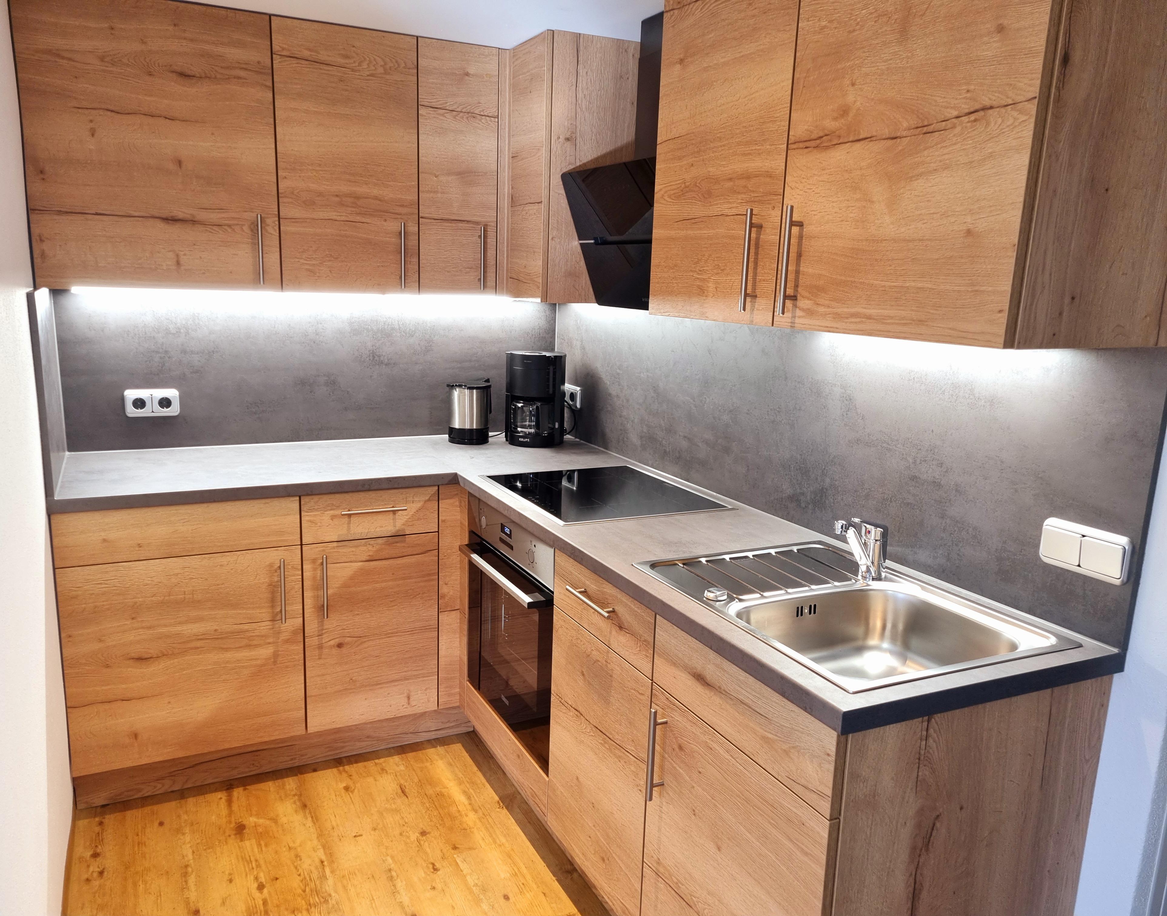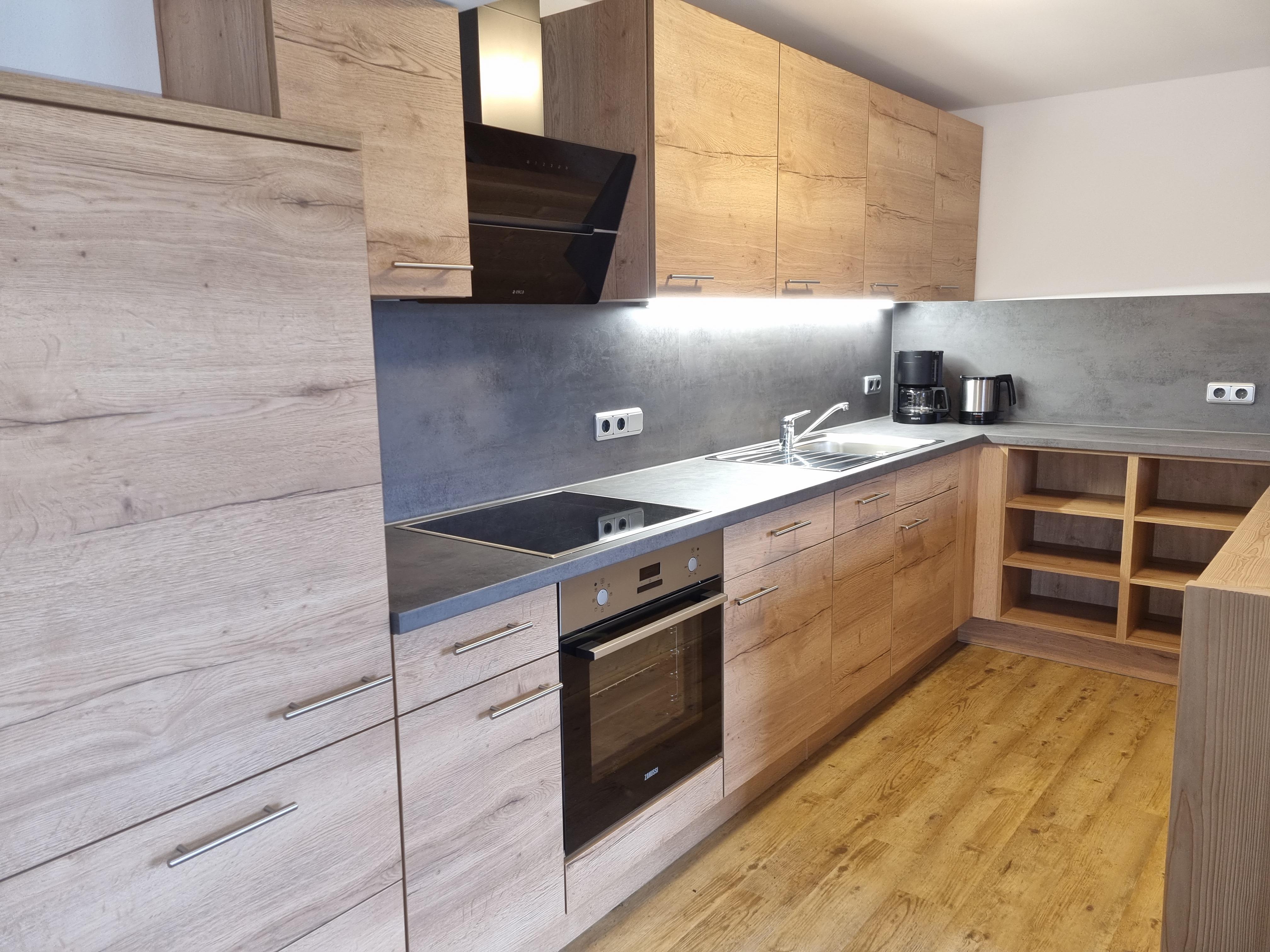 - Essecke und großer Küchenbereich mit 4 Felder-Induktionsherd, Backofen und Spülmaschine