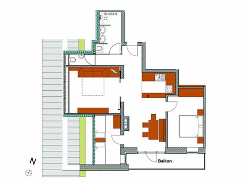 Diese Wohnung kann in Kombination mit der 1,5-Zi-Wohnung Nr. 9 für insgesamt 8 Personen angemietet werden.