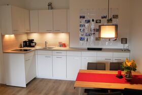 Wohnraum mit Essplatz und Einbauküche (Spülmaschine, Kühlschrank mit Gefrierfach, Kaffeemaschine),