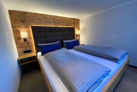 Doppelzimmer mit Balkon, getrennter Wohn-Schlafbereich, gemütlicher neuer Wohnteil im alpenländischen Stil und neuer Schlafzimmerbereich, Kühlschrank, Wasserkocher/ Teezubereitung, kleiner Esstisch, Safe