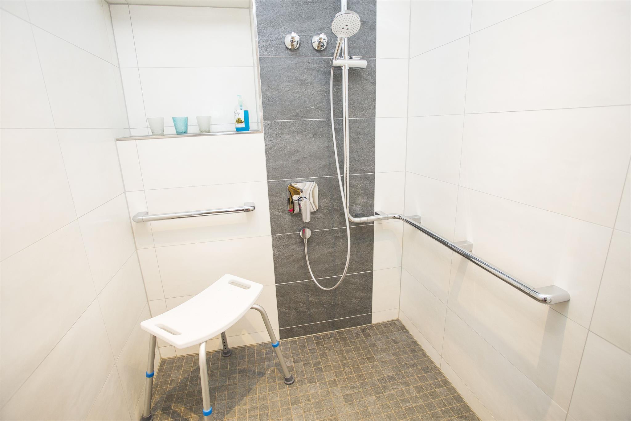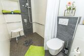 • Duschbad mit Fön, Kosmetikspiegel und WC. Barrierefei mit Rollstuhl zu befahren.