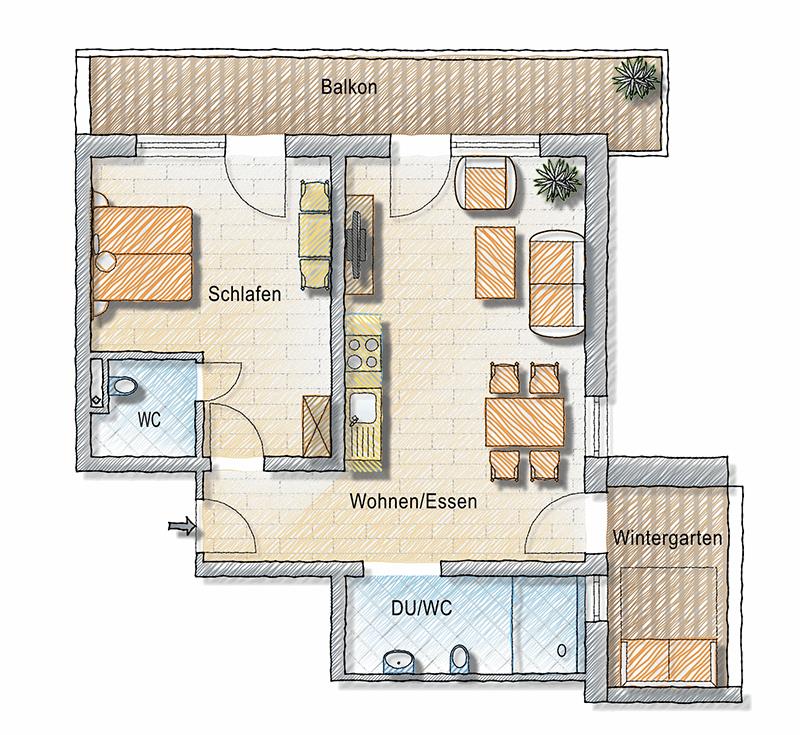 • 12 ruhige, zur Talseite gelegenen Wohnungen für 1-6 Pers, in unterschiedlichen Größen Balkon/Terrasse.