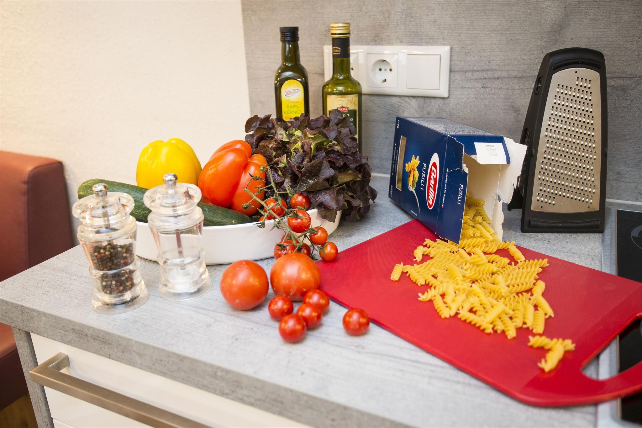 • Küche voll ausgestattet: Ceranfeld, Backofen, Kühlschrank + Gefrierfach, Kaffeemaschine, Toaster, Wasserkocher u. Spülmaschine.