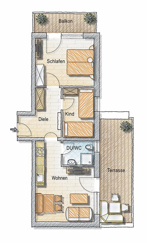 • 12 ruhige, zur Talseite gelegenen Wohnungen für 1-6 Pers, in unterschiedlichen Größen Balkon/Terrasse.