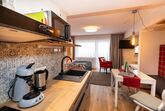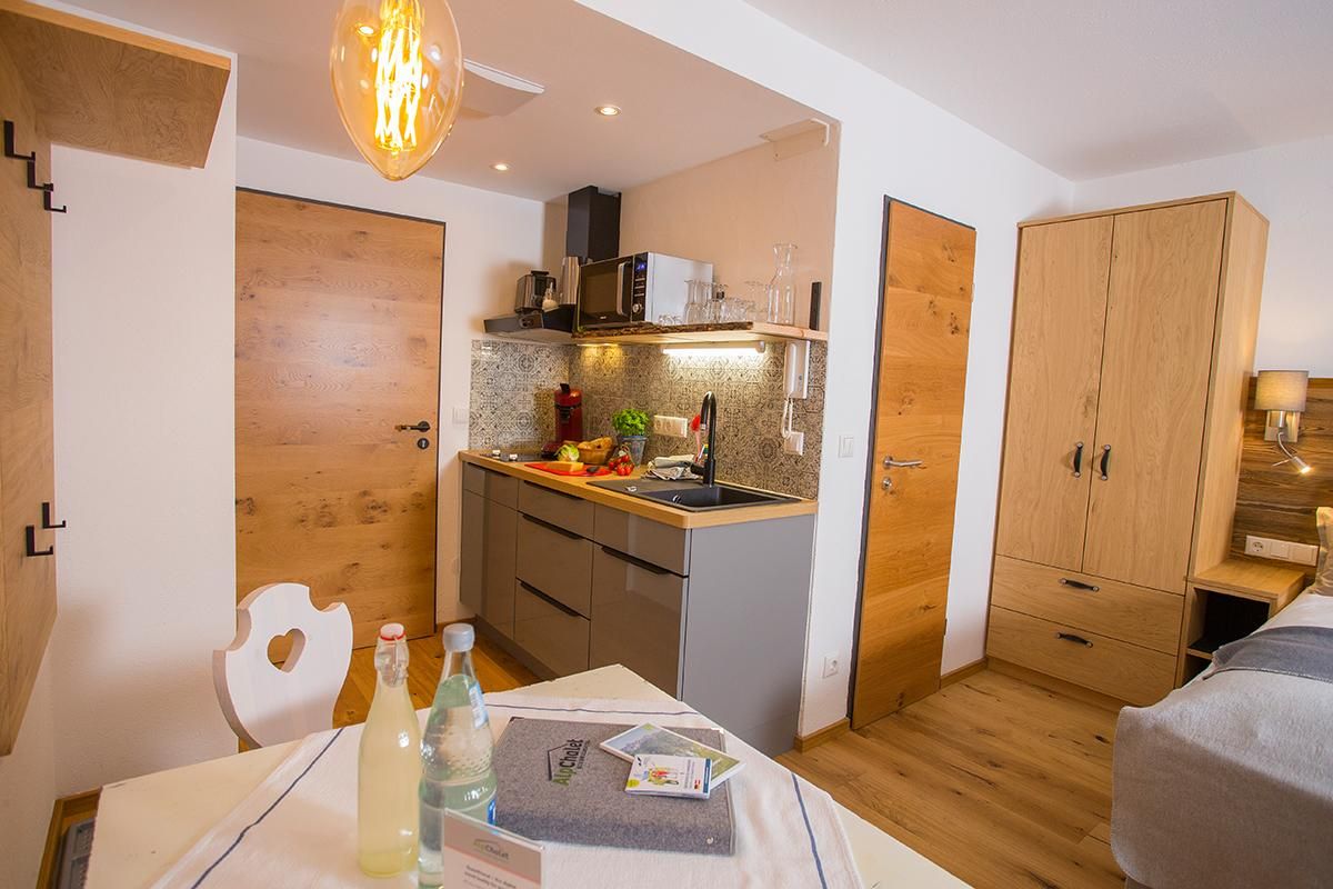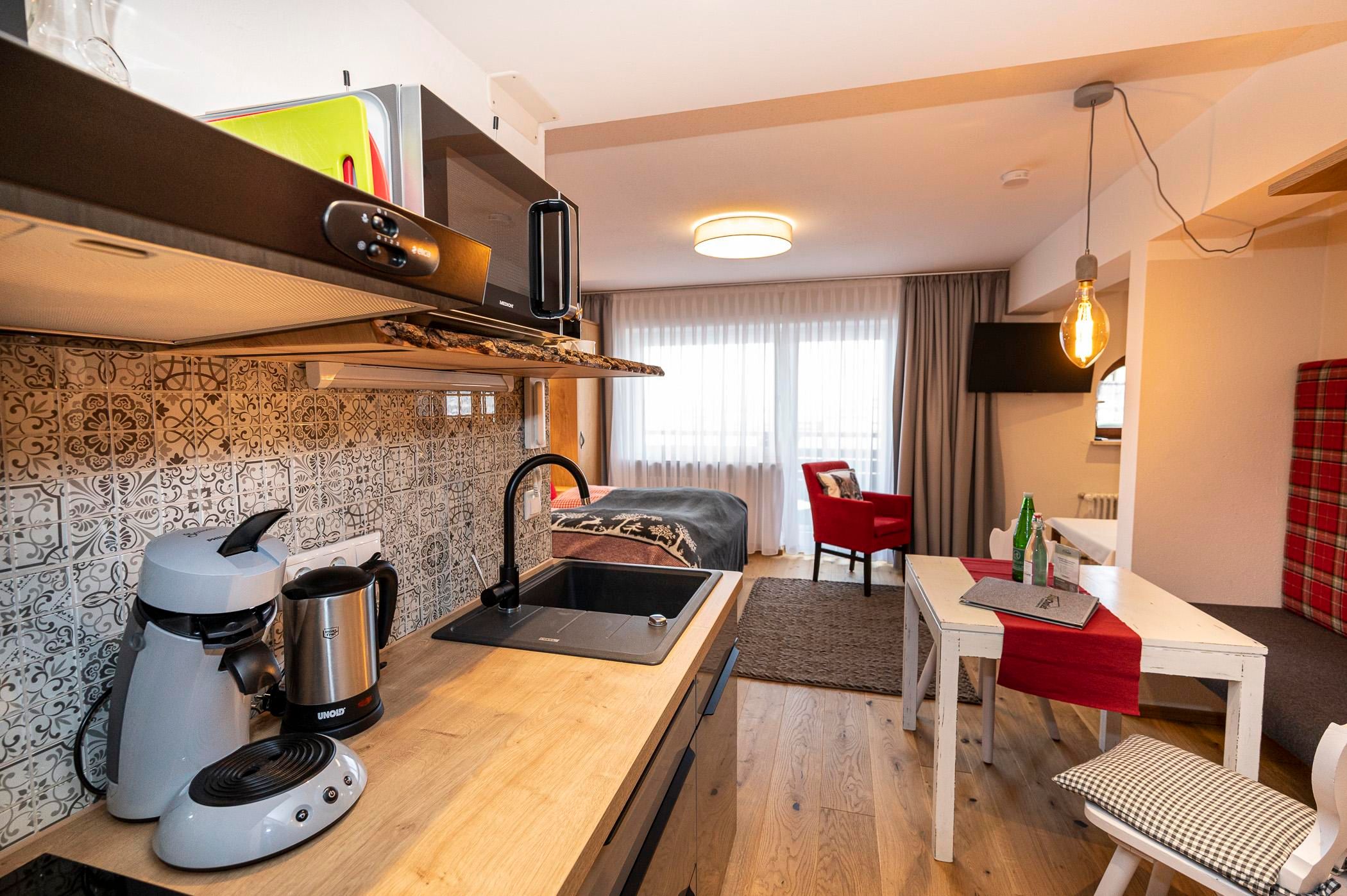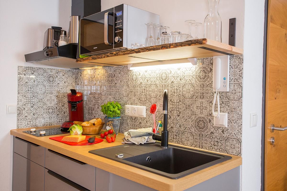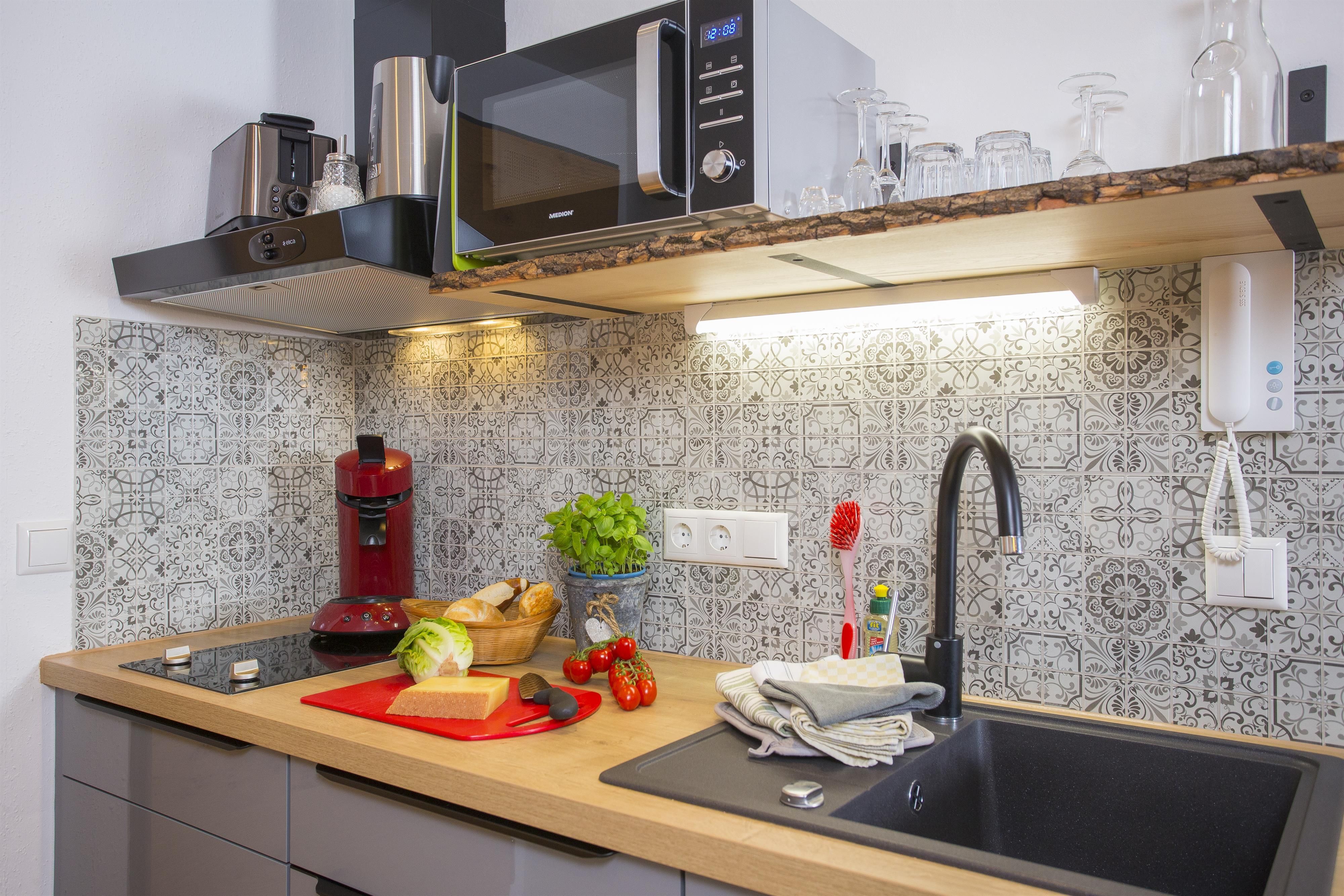 • Kleine Küchenzeile- voll ausgestattet: Ceranfeld, Kühlschrank, Kaffeemaschine, Toaster, Wasserkocher, Geschirr/ Besteck + Geschirrtücher und Mikrowelle mit Grillfunktion
