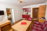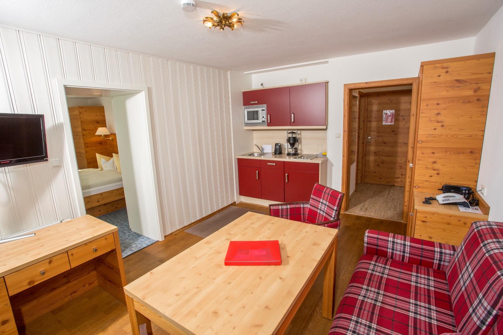 Schlafzimmer mit Doppelbett und Schränke, durch eine Verbindungstür ins Wohnzimmer mit Couch/Essecke, digitalisiertem Flachbildschirm, Radio, Safe und Telefon. Integrierte kleine Küchenzeile mit 2-Plattenherd, Spülmaschine, Mikrowelle, Toaster, Kaffeemaschine, Wasserkocher, vollkommen eingerichtet bei beiden Zimmern Ausgang auf die große Sonnenterrasse mit grandiosem Bergpanorama-Blick Garderobenvorraum Badezimmer mit Dusche/WC, Fön tägliche Reinigung inklusive