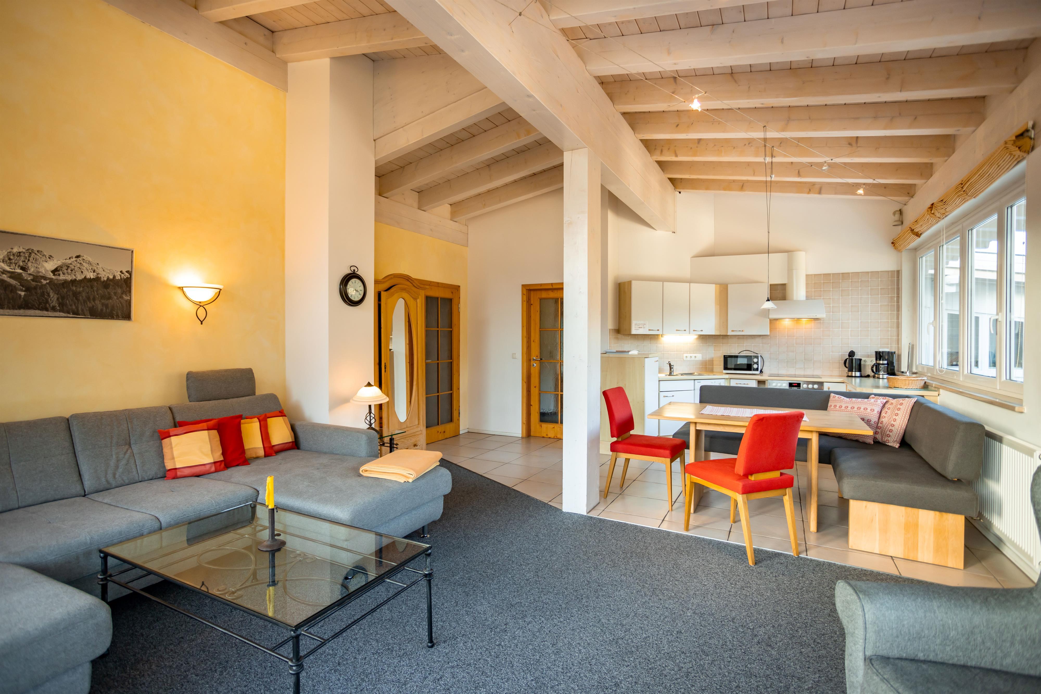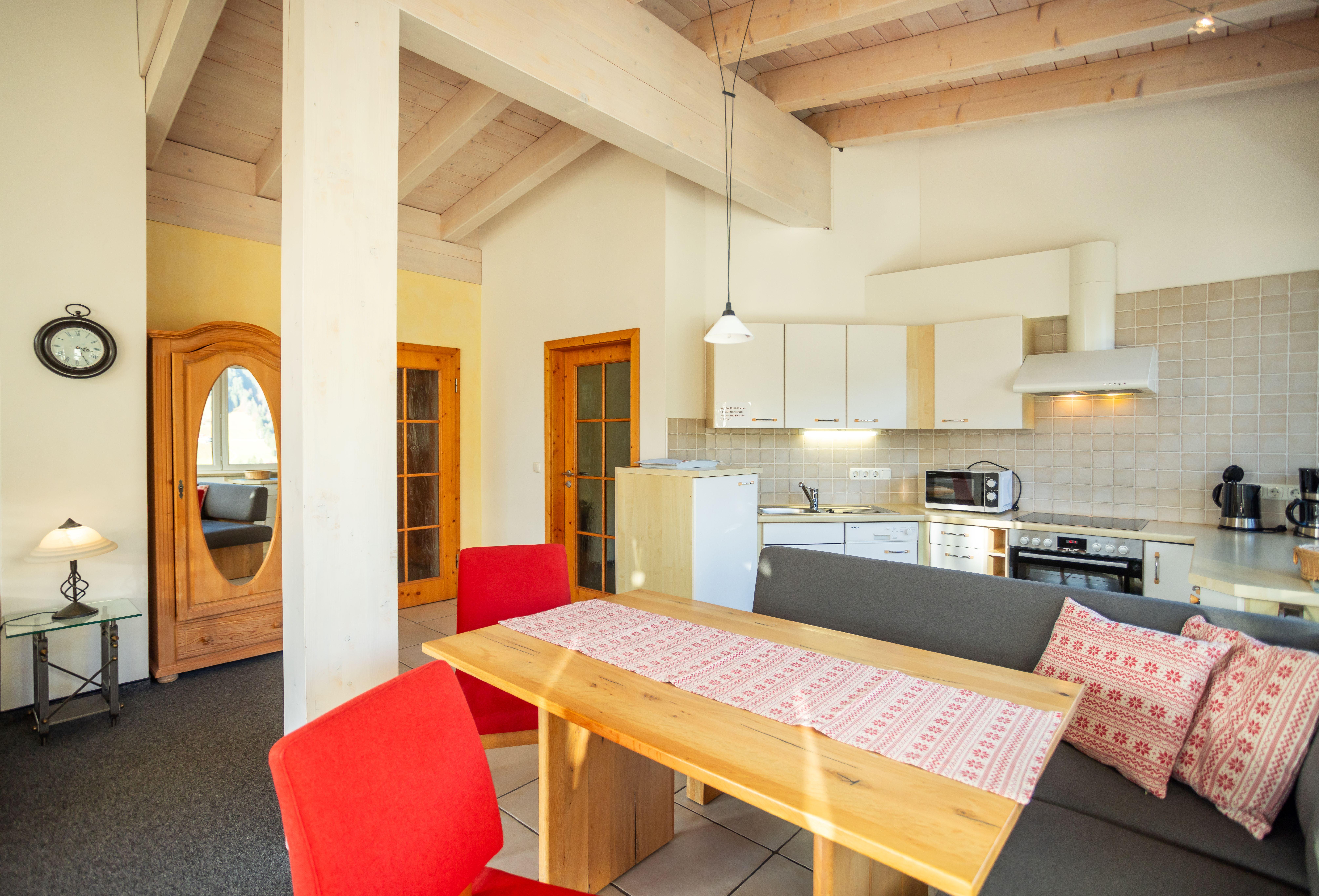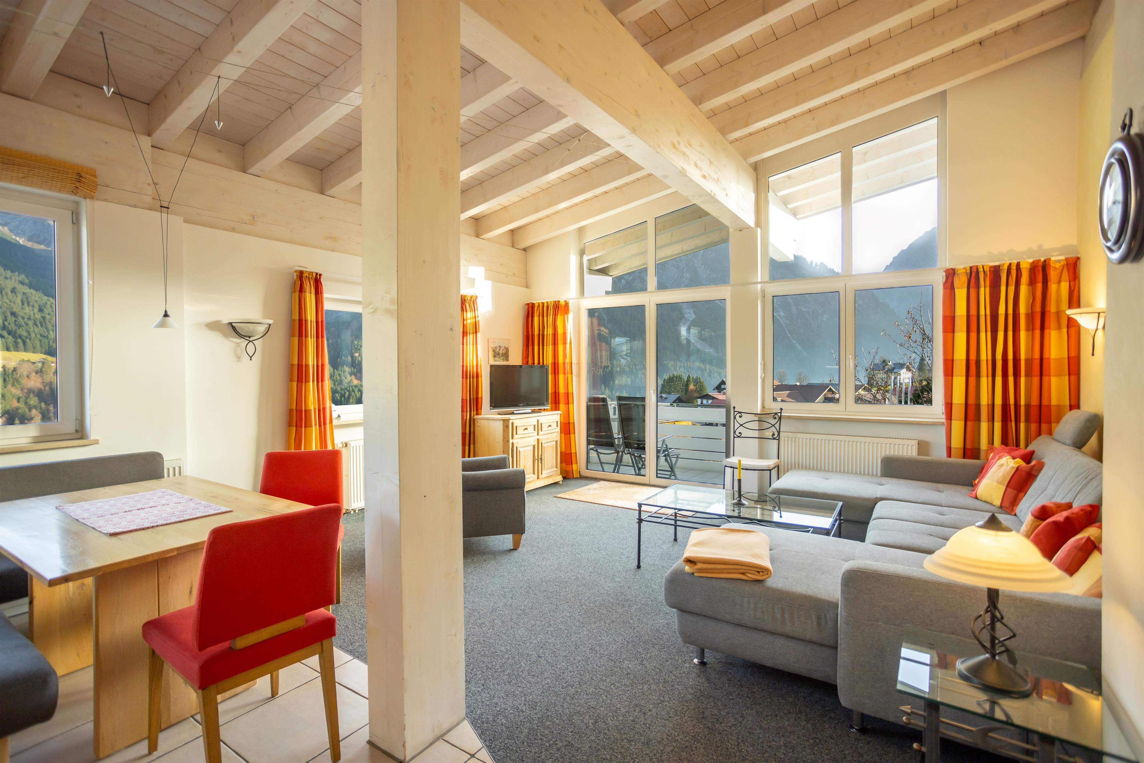 Schlafzimmer mit Doppelbett, Wohnzimmer offenem Dachstuhl und großer Wohnlandschaft (dreifach ausziehbar), Rundum-Bergpanorama-Blick, integr. Küche mit 4-Platten-Herd, Backofen, Spülmaschine, Eßecke, digitalisierter Flachbildschirm, Telefon, Radio, Internetzugang, Bad mit Badewanne und Dusche/WC, Fön, separates WC, großer Ost-Süd-West-Balkon 10qm