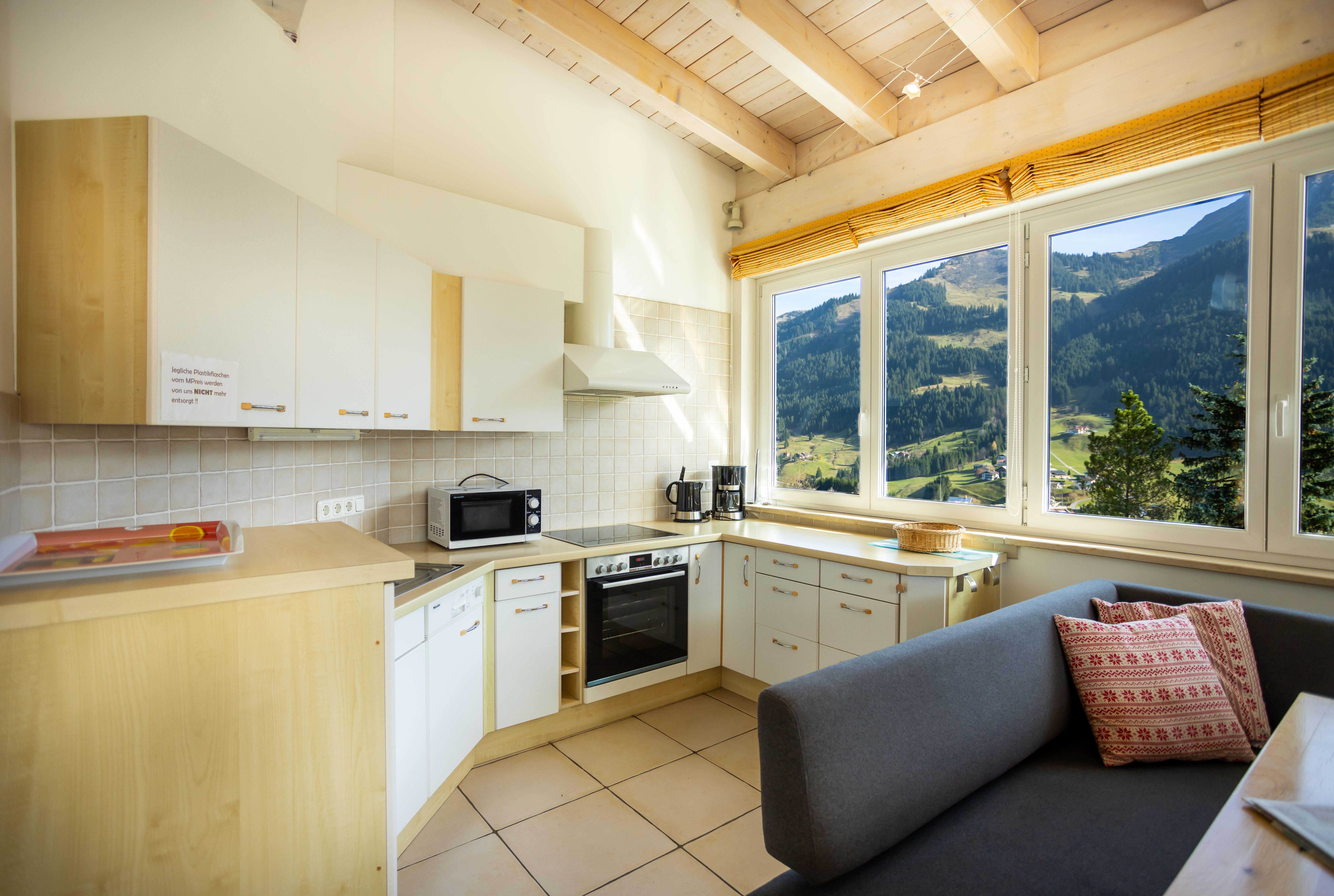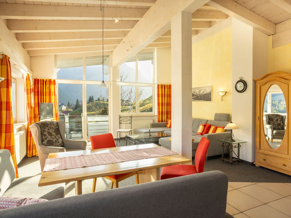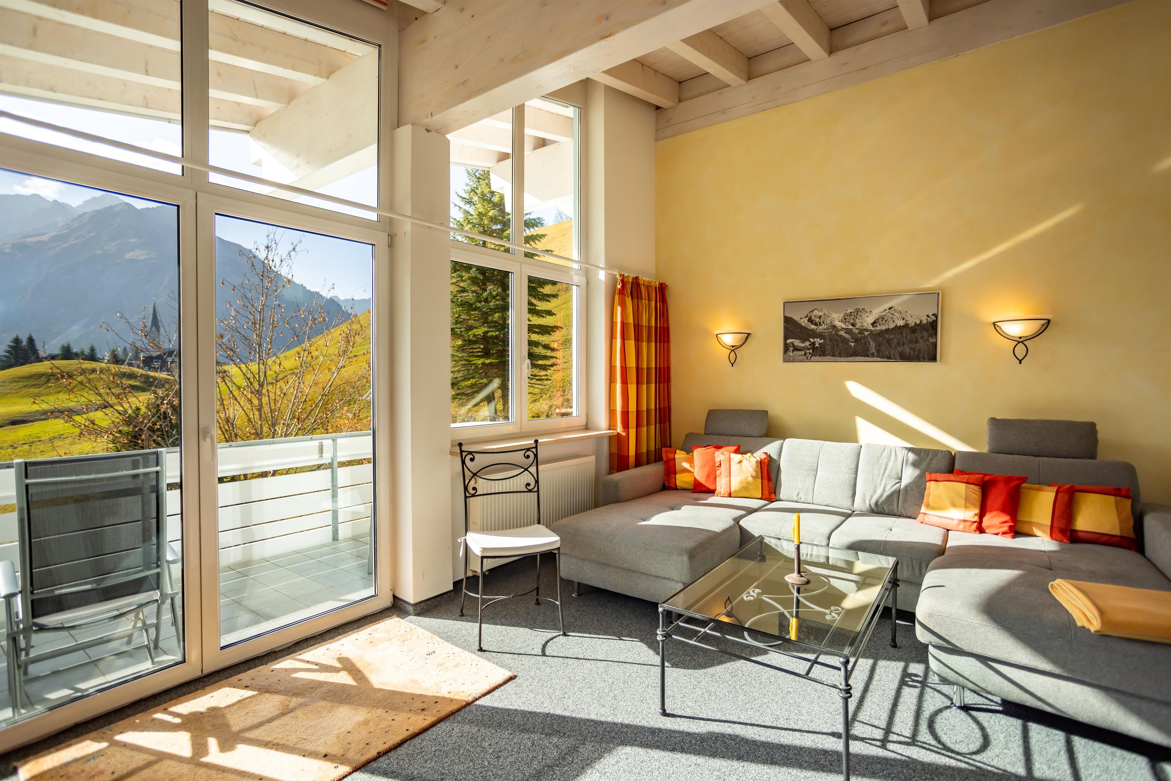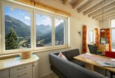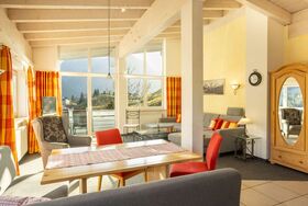 Schlafzimmer mit Doppelbett, Wohnzimmer offenem Dachstuhl und großer Wohnlandschaft (dreifach ausziehbar), Rundum-Bergpanorama-Blick, integr. Küche mit 4-Platten-Herd, Backofen, Spülmaschine, Eßecke, digitalisierter Flachbildschirm, Telefon, Radio, Internetzugang, Bad mit Badewanne und Dusche/WC, Fön, separates WC, großer Ost-Süd-West-Balkon 10qm