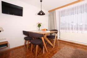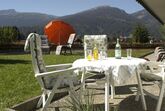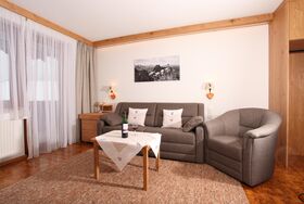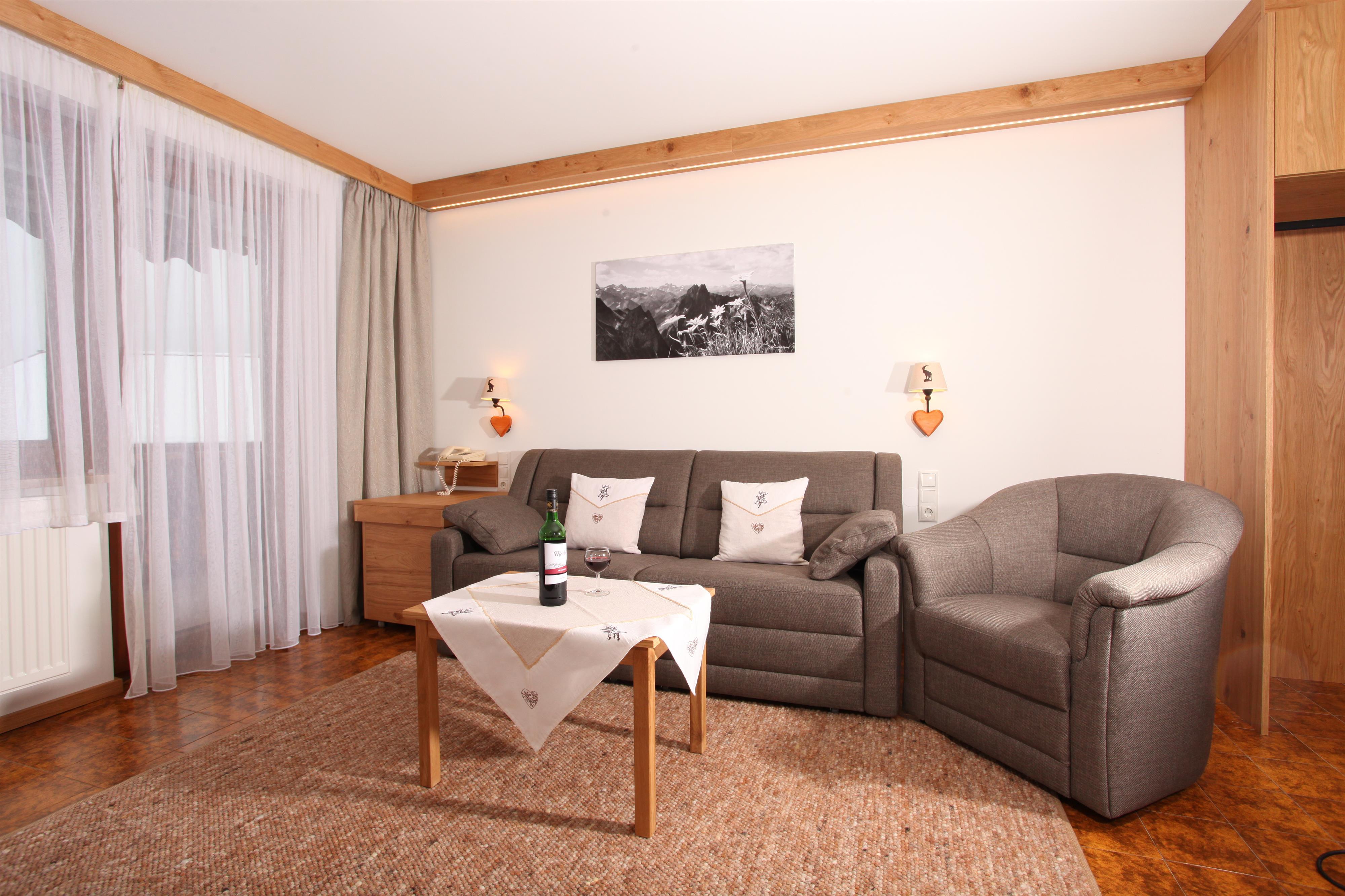 Komfortables Apartment mit 41qm mit großem Wohn- und Schlafbereich. Doppelbett, Ausziehcouch und Sessel, komfortable Essecke, sep.Küche, sep.Dusche, sep. WC. Standard sind Fliesenboden mit Fußbodenheizung, sowie Radiatoren, Telefon, Sat-TV und Safe, W-Lan. Südbalkon mit Markise oder Südterrasse mit Liegewiese sowie Komfortliegestühlen und Bergblick. Brötchenservice oder auf Wunsch Frühstücksservice.