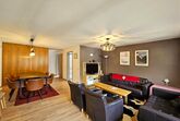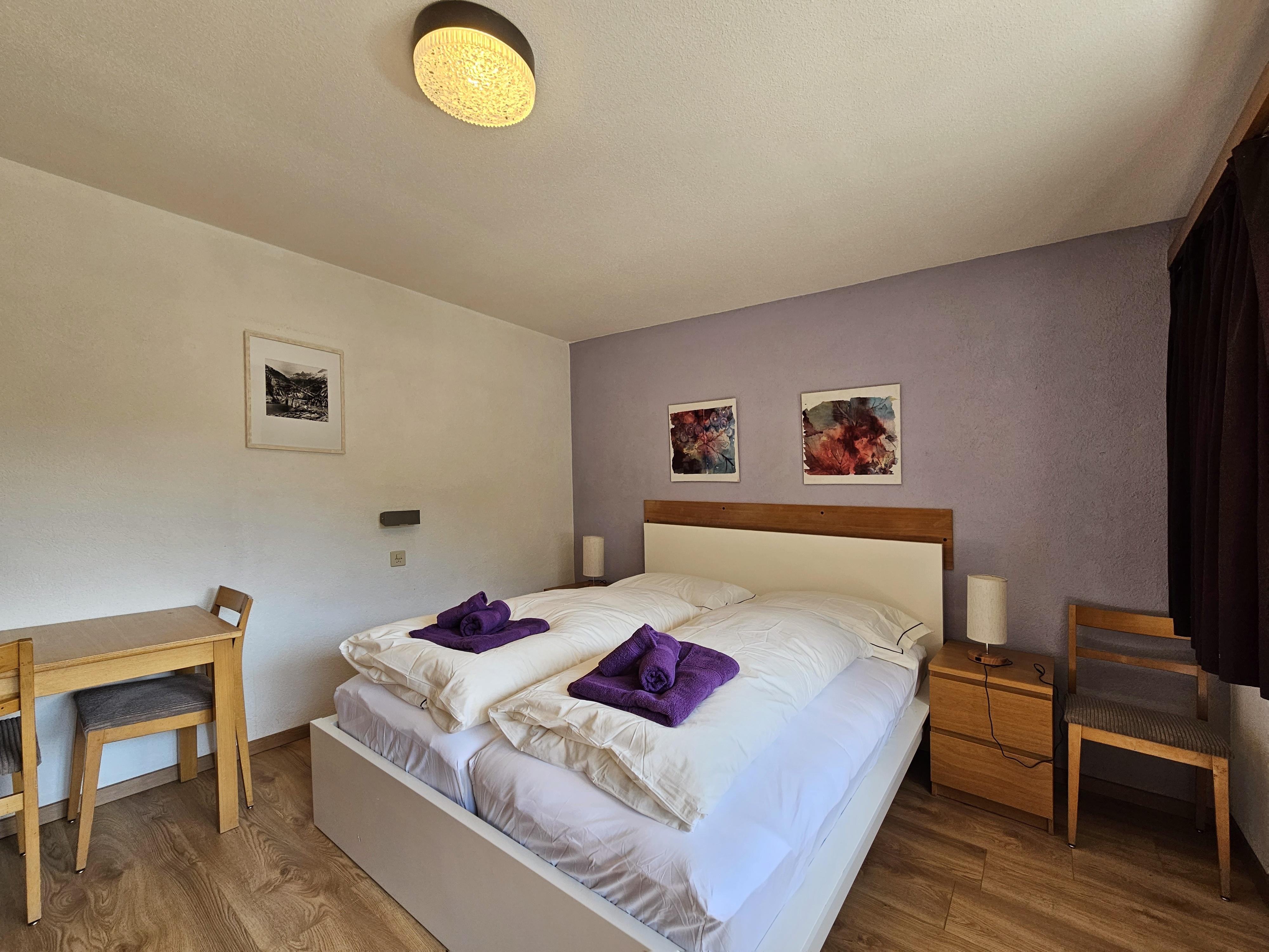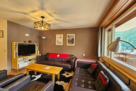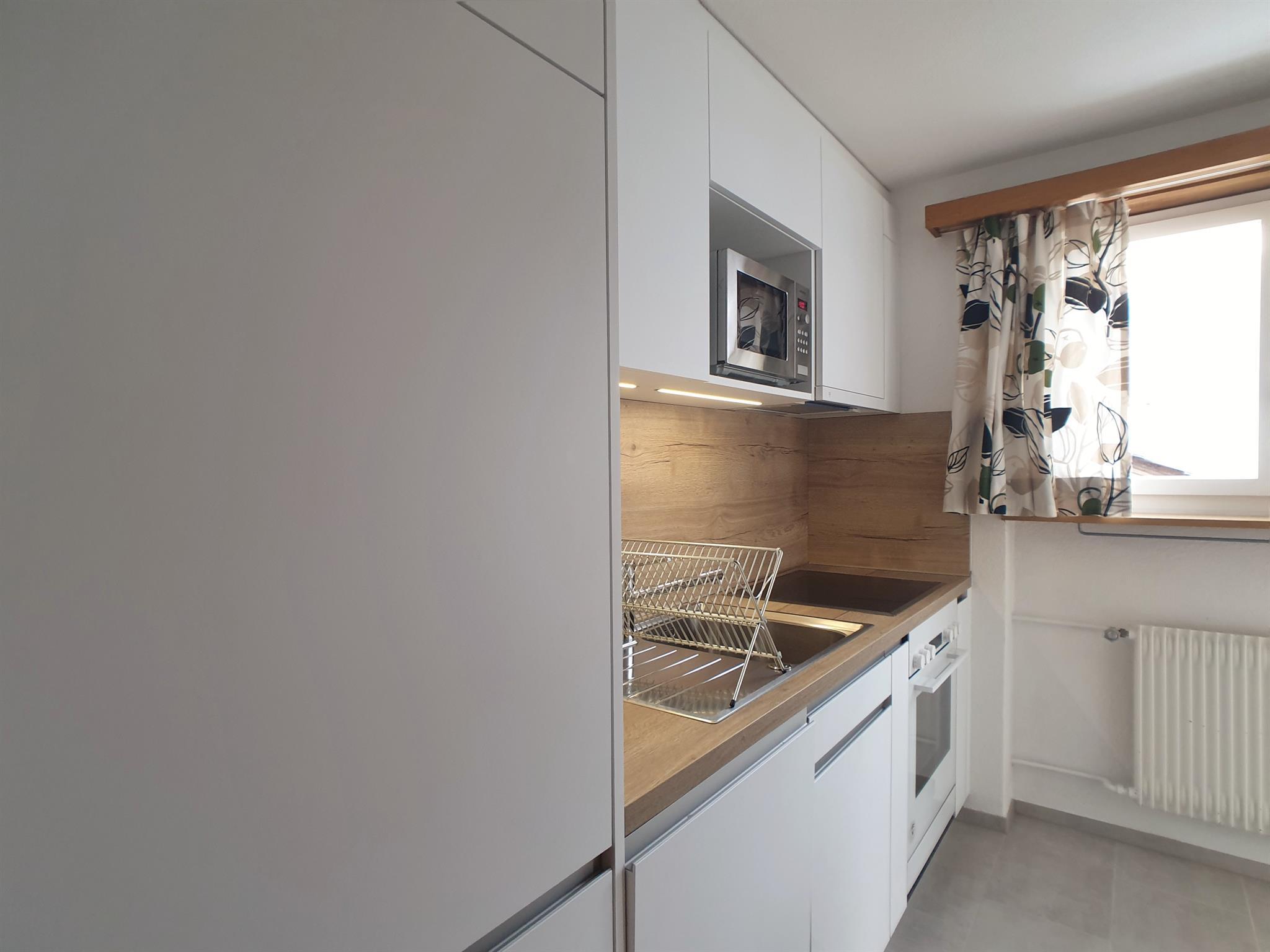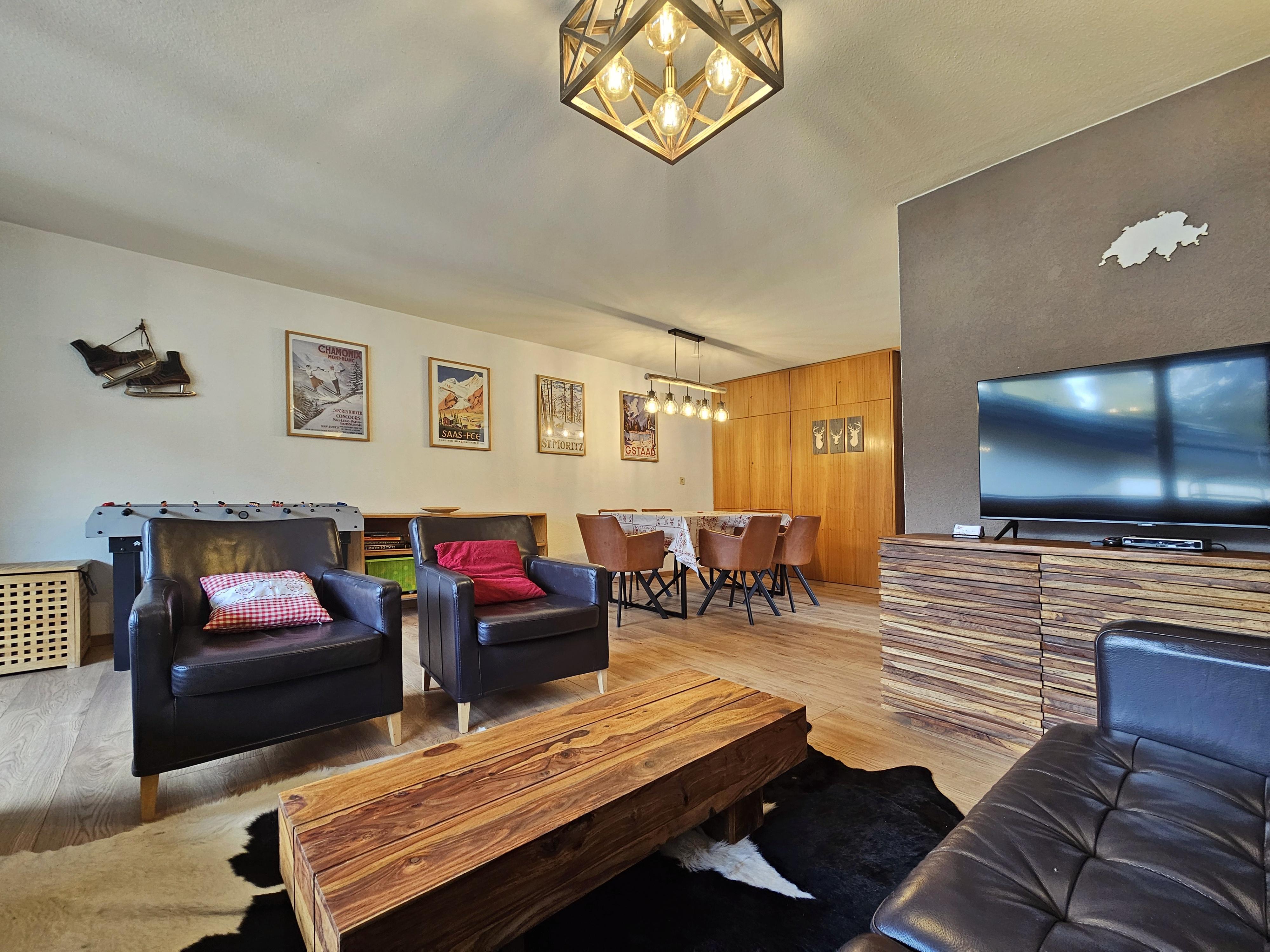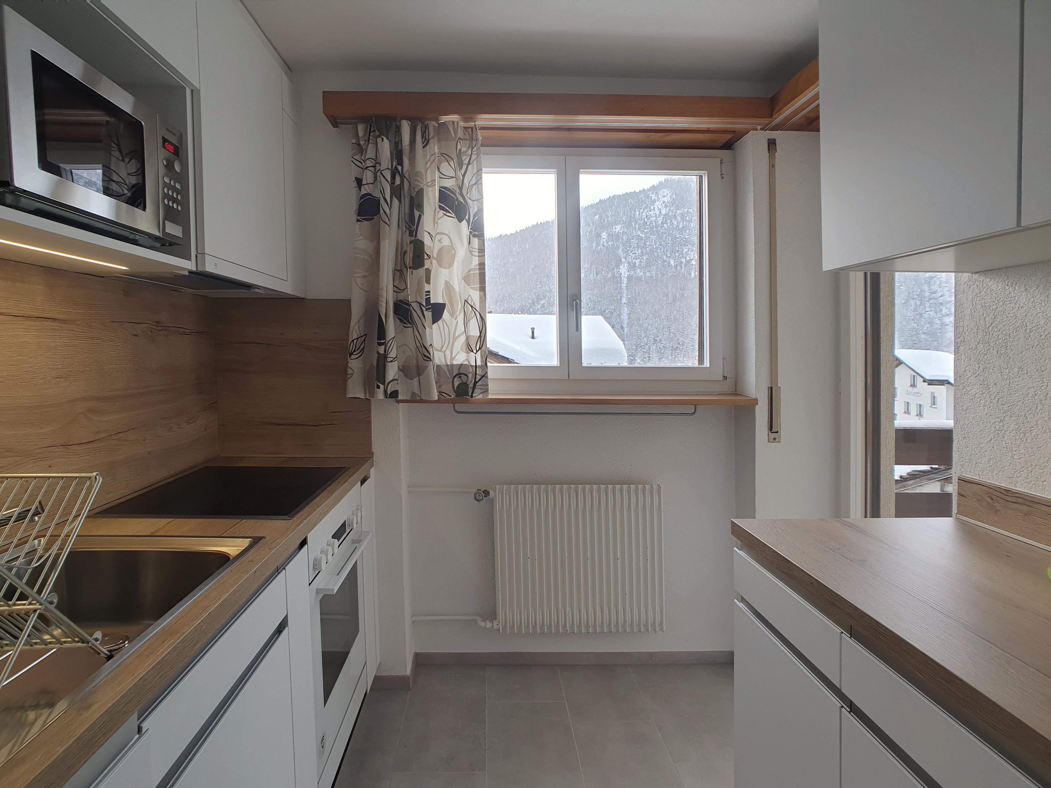 Apartment mit 2 Schlafzimmern im Haus Cresta. Beide Schlafzimmer (eines mit einem Doppelbett, eines mit 2 Etagenbetten) teilen sich ein Badezimmer mit Dusche und WC. Der grosse Wohn- & Essbereich ist der perfekte Ort für die Familie zum Entspannen. Die Küche wurde im Herbst 2020 komplett renoviert. Das Apartment verfügt über einen Balkon mit schöner Aussicht. Von der Küche hat man ebenfalls einen Ausgang zum Balkon. Skiraum und kostenloses WIFI sind vorhanden.