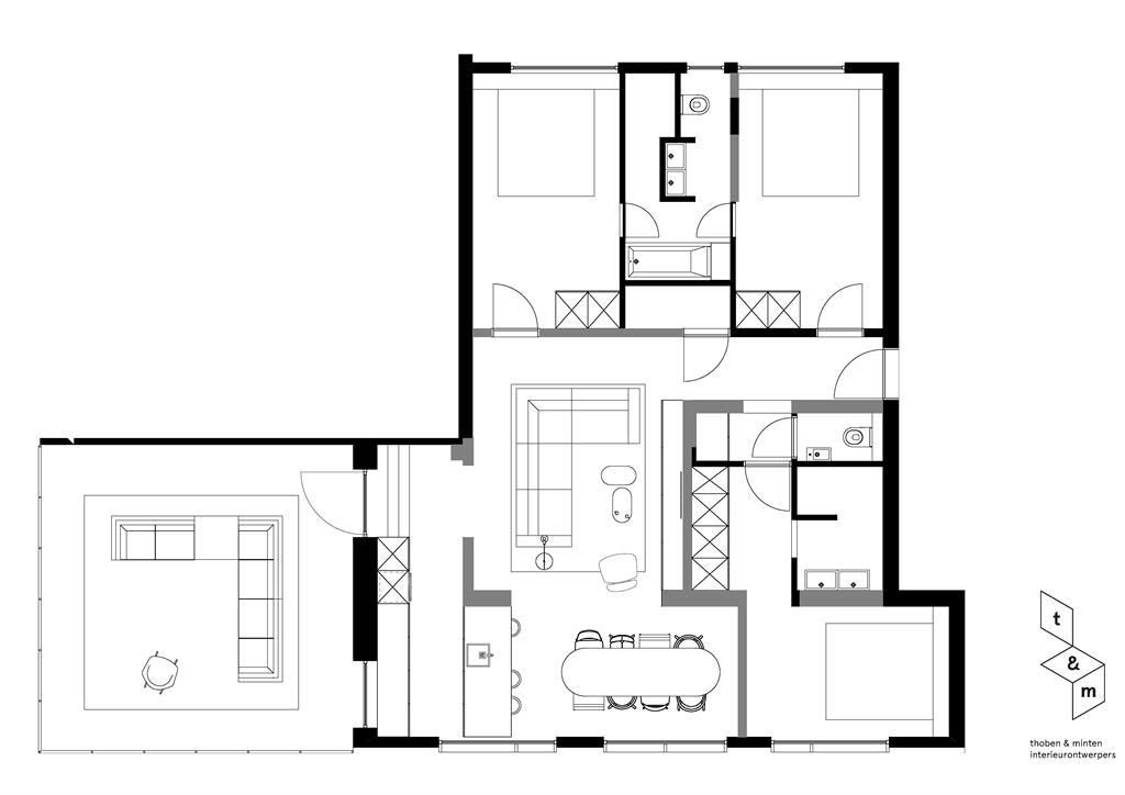 Das großzügige Apartment von ca. 100 m2 ist geeignet für 6 Personen und verfügt über 3 Schlafzimmer, 2 Badezimmer, 1 zusätzliches WC, eine moderne Küche mit Kochinsel und ein großes Wohnzimmer sowie eine große Dachterrasse.