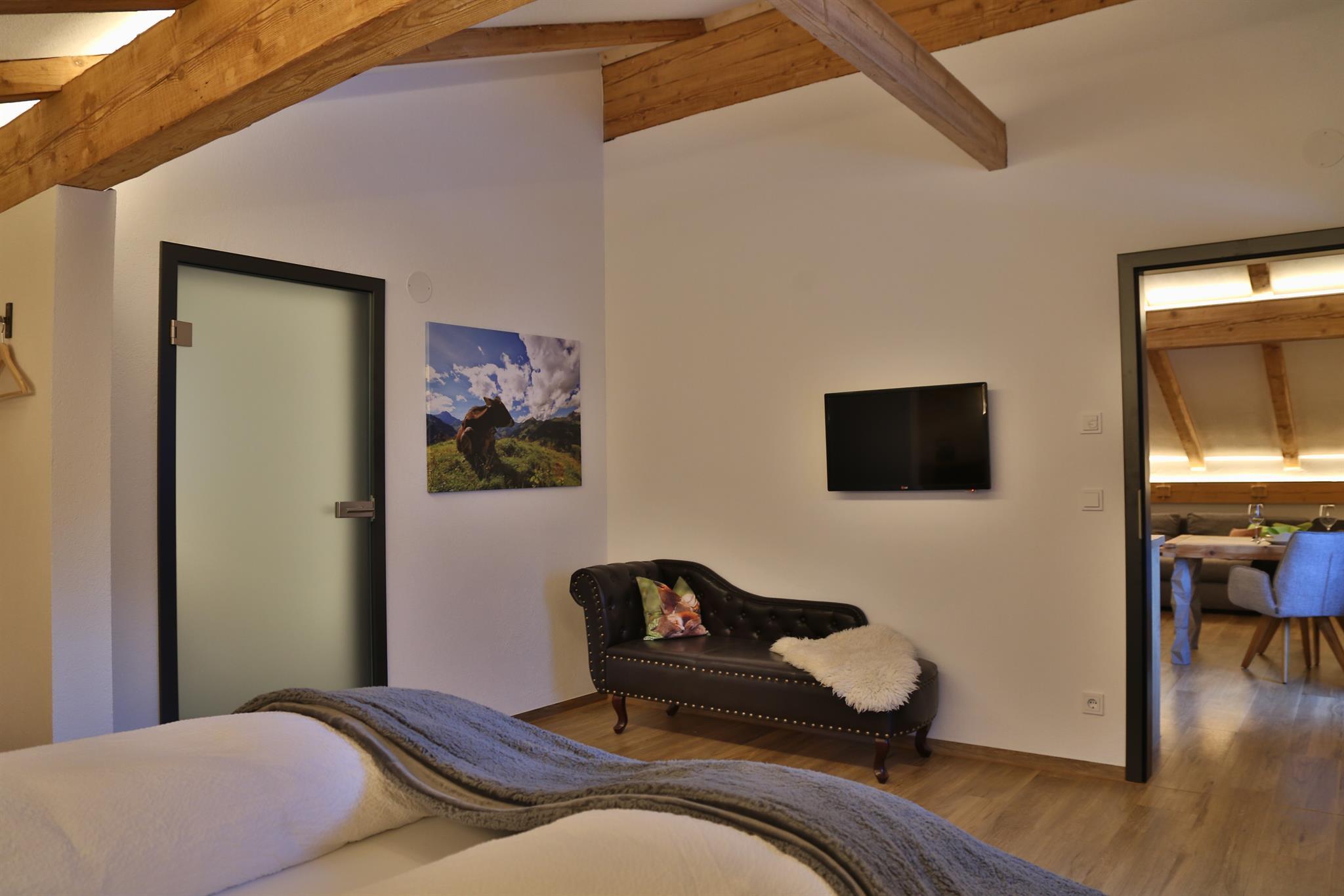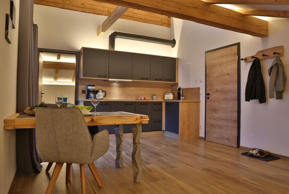 Unsere Ferienwohnung „Wildental“ ist kuschelig und gemütlich, doch durch den offenen Altholz-Dachstuhl mit indirekter, dimmbarer Beleuchtung, erhält die Wohnung ein großzügiges Wohngefühl.