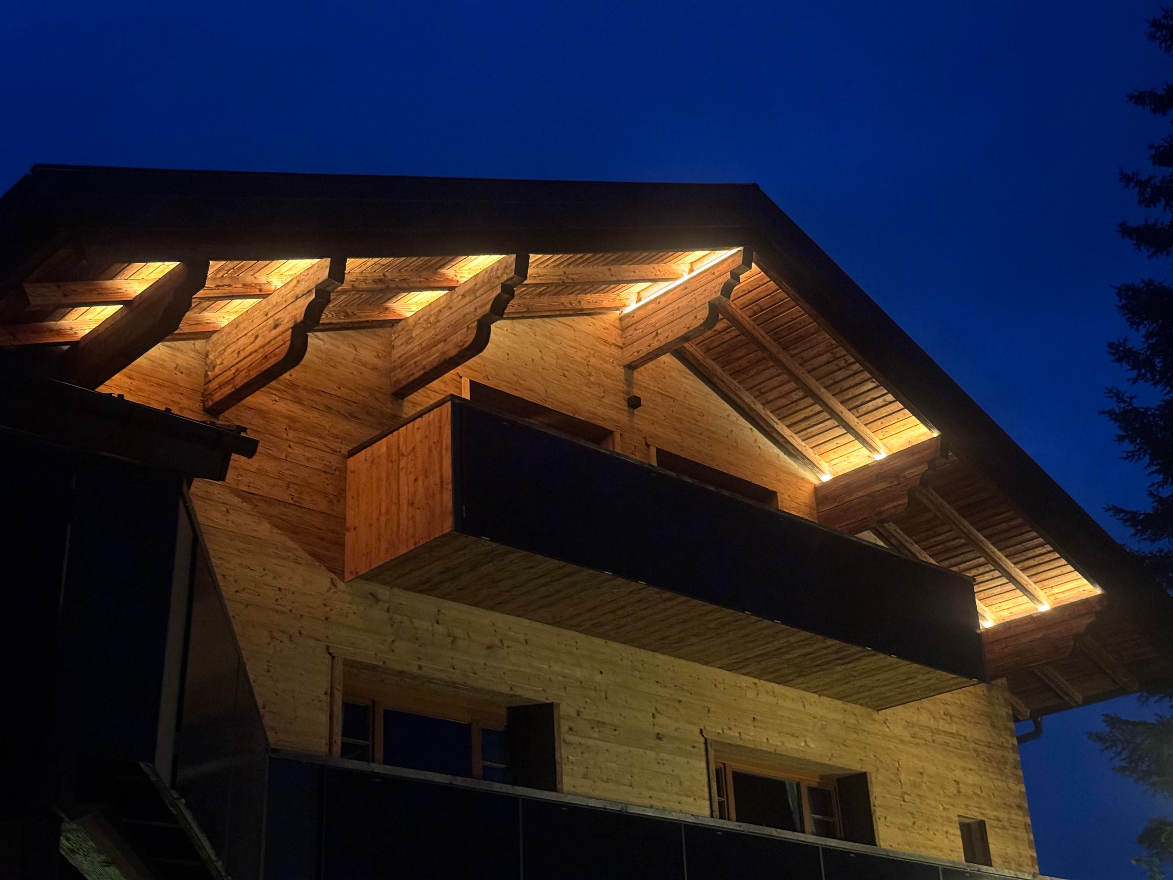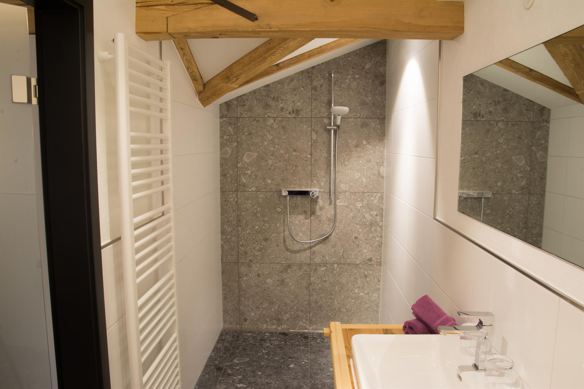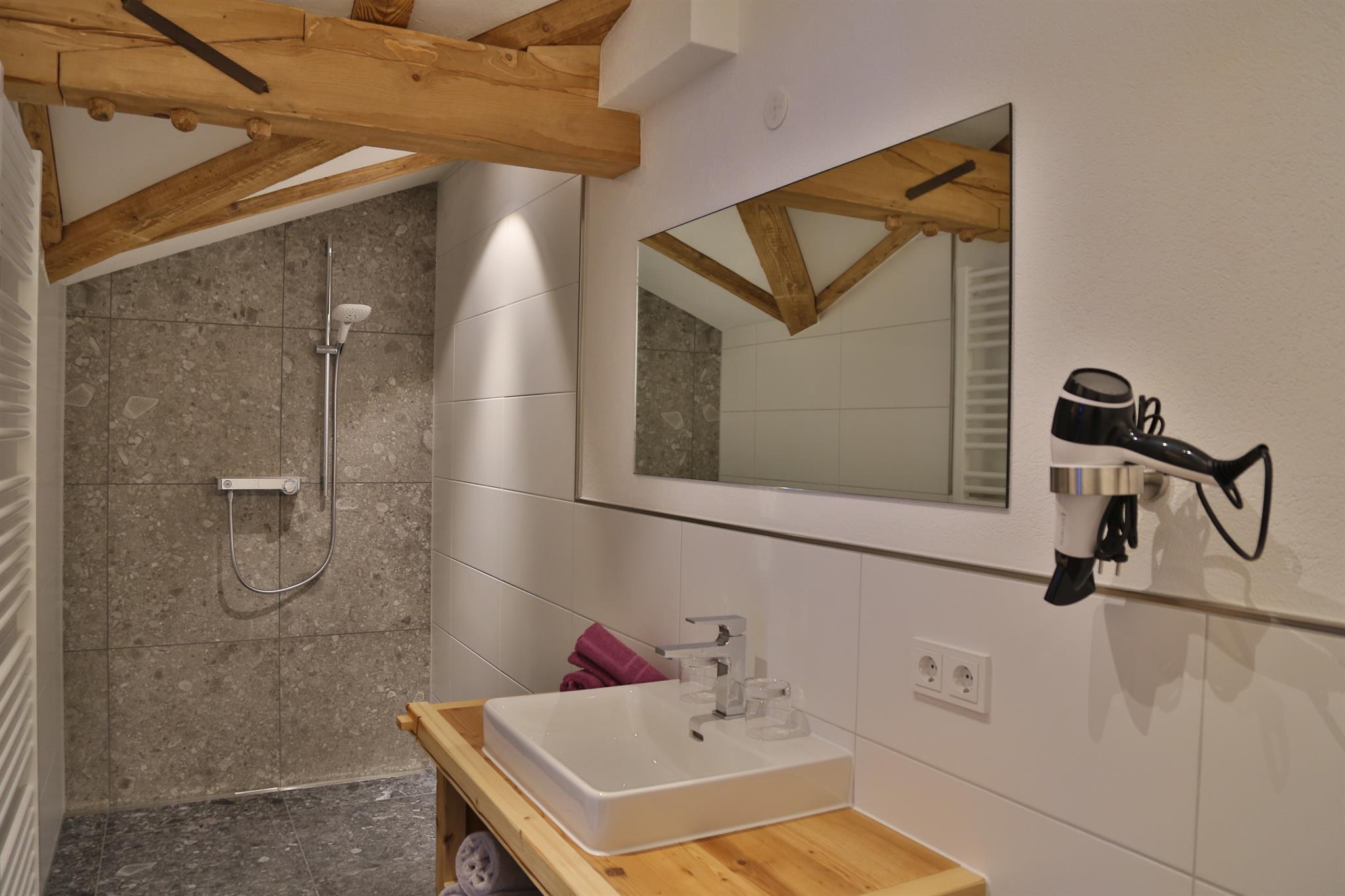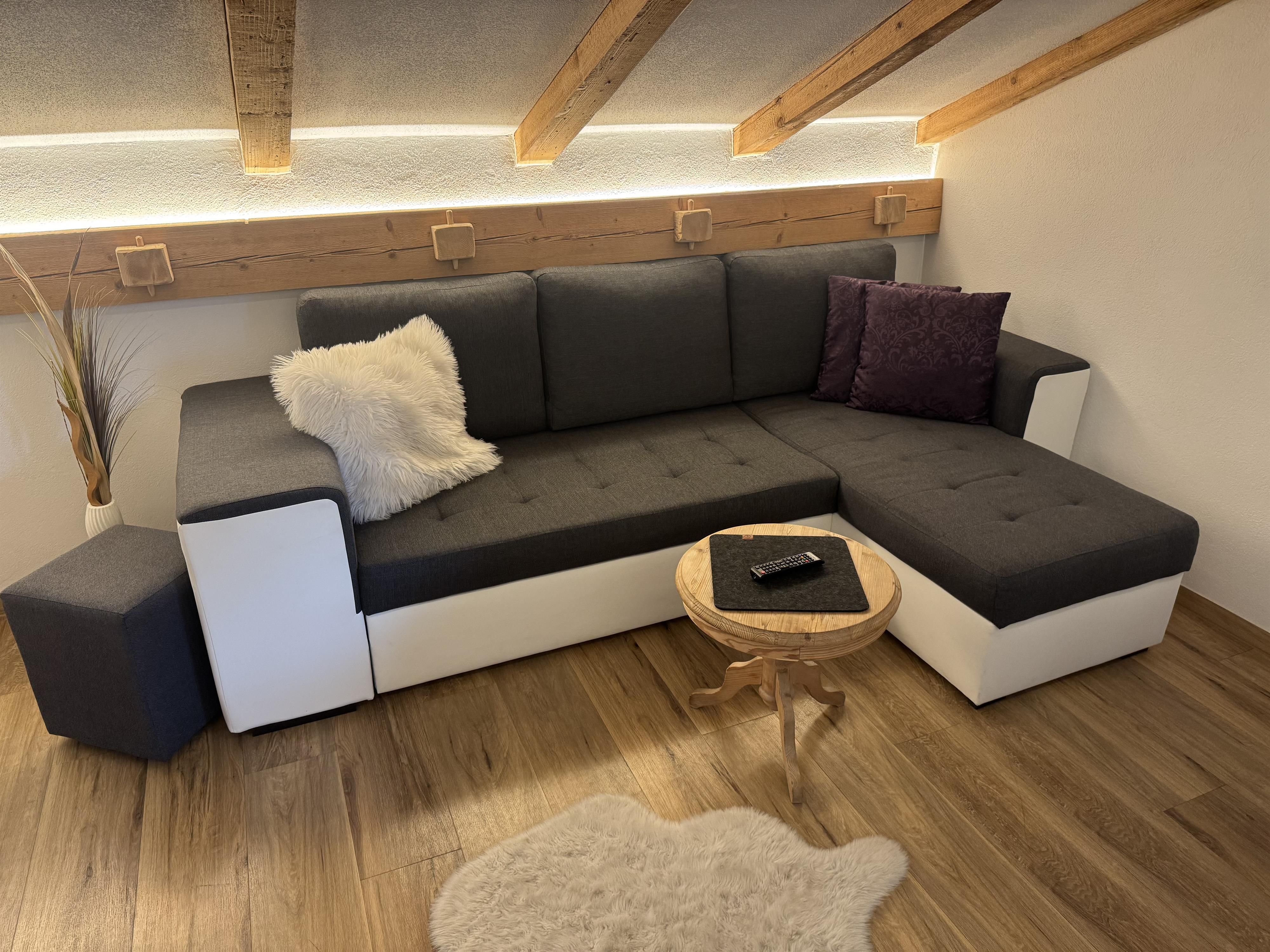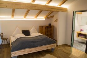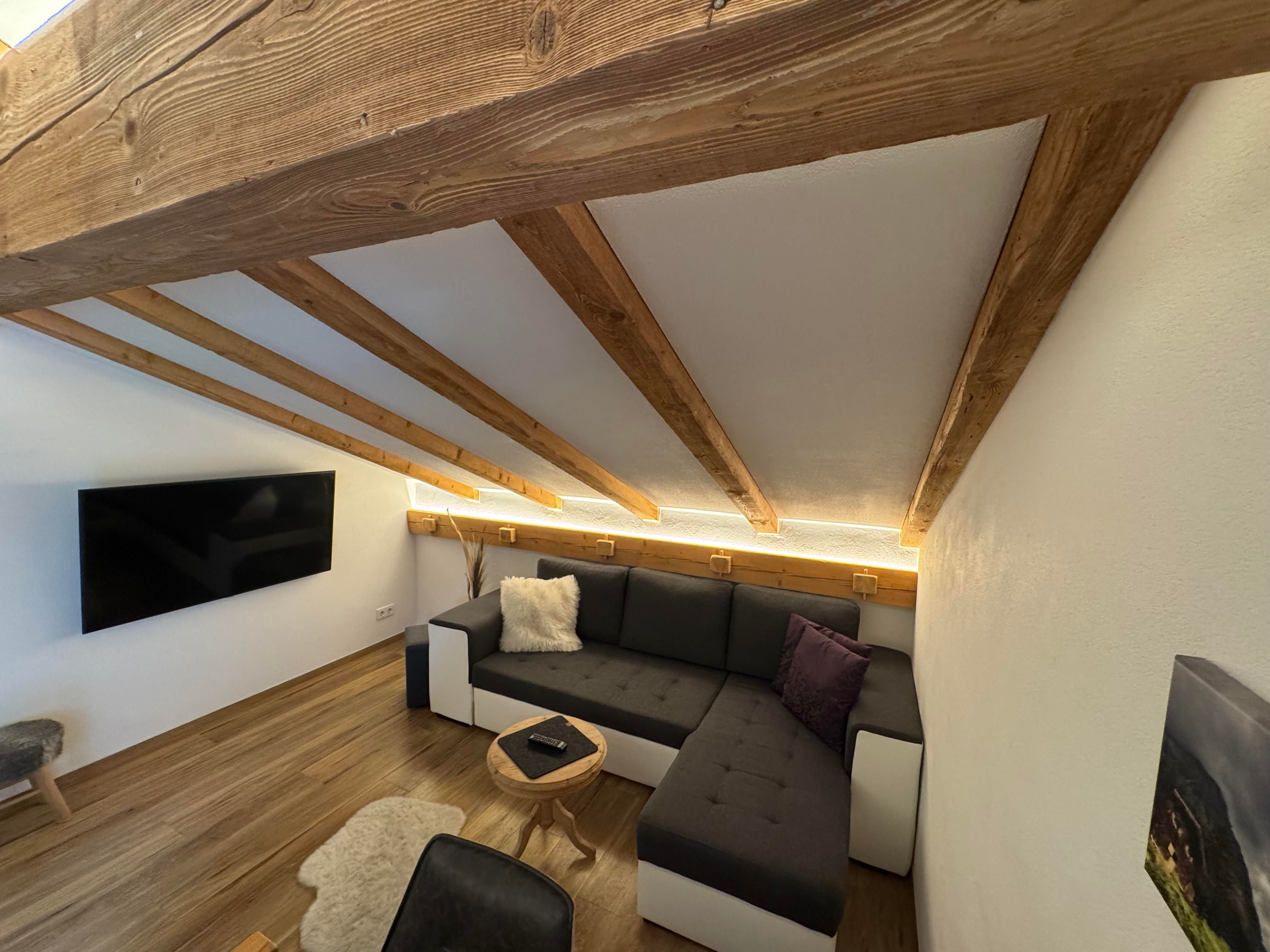 Im Sommer 2018 wurde der obere Stock unsere Hauses entkernt und Dach, sowie die Wände komplett ökologisch mit Holzwolle gedämmt. Der originale Holz-Dachstuhl wurde aufwendig aufgearbeitet und in liebevoller Kleinarbeit in Szene gesetzt. Dies wird durch die indirekte, dimmbare LED - Beleuchtung noch unterstützt. Für ein wohliges und gemütliches Raumgefühl, sogar an kältesten Wintertagen, sorgt die im ganzen Stockwerk verlegte Fußbodenheizung.