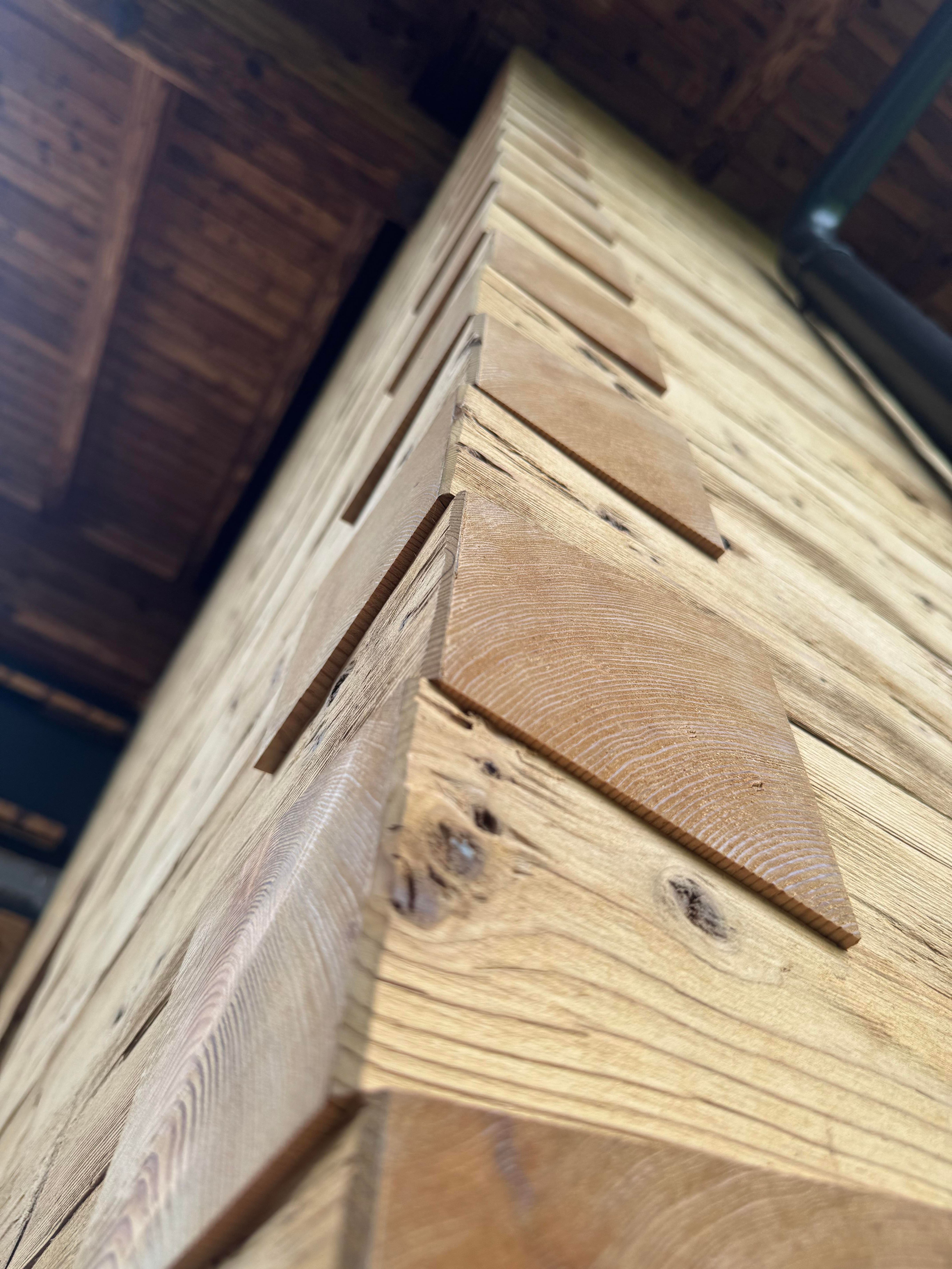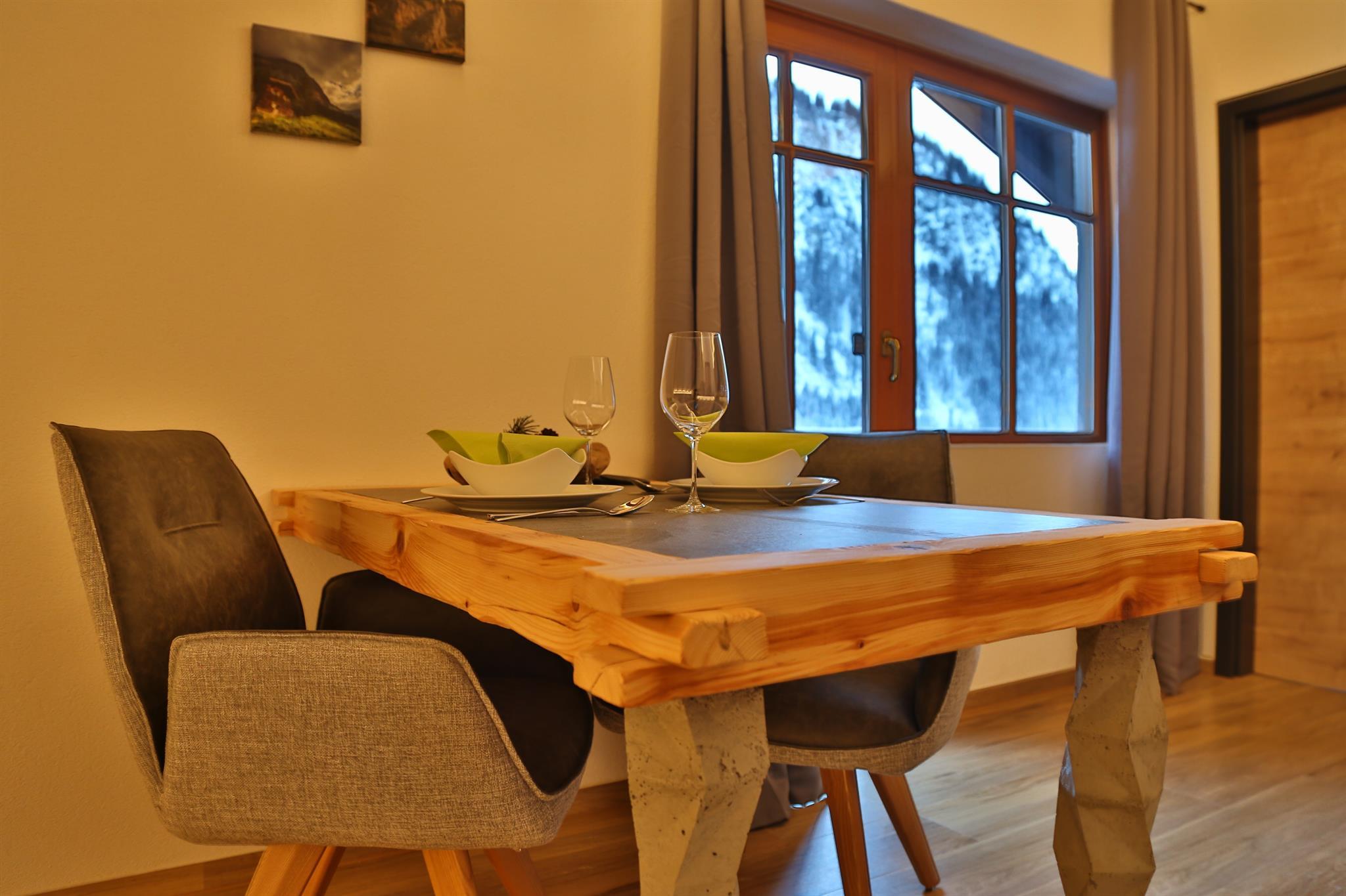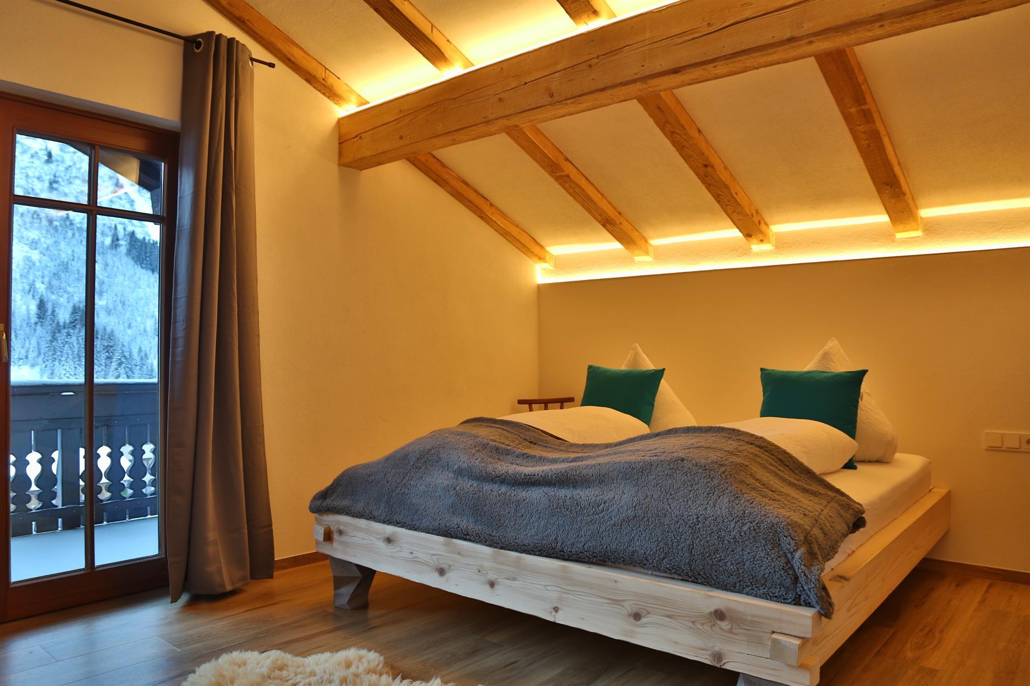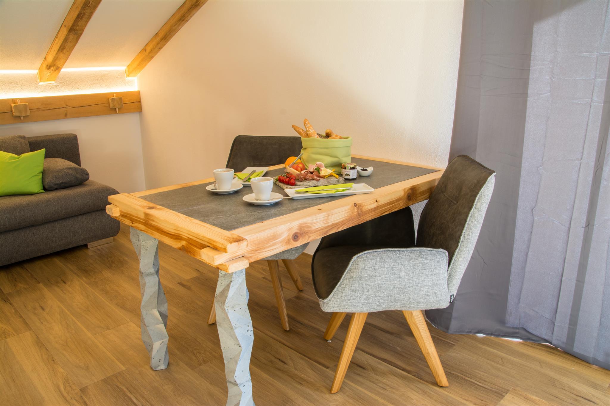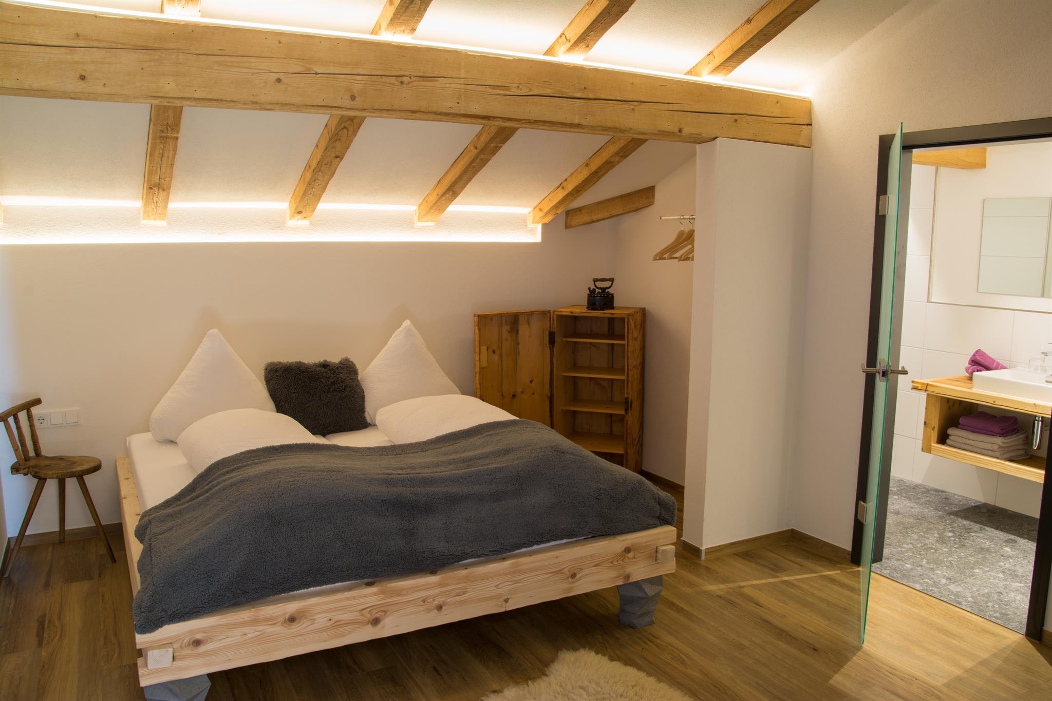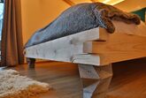 Auch hier sind Bett, Esstisch, sowie noch andere Ausstattungselemente Einzelstücke und wurden aus dem beim Abriss freigelegten alten Holz angefertigt.