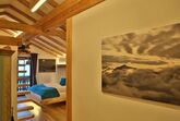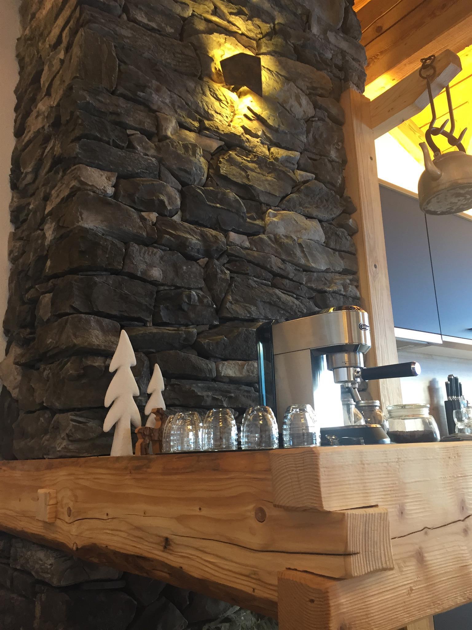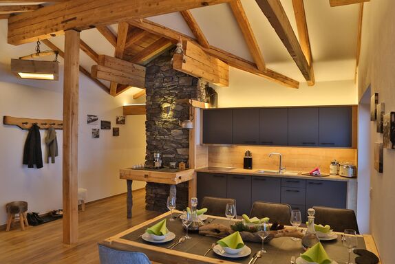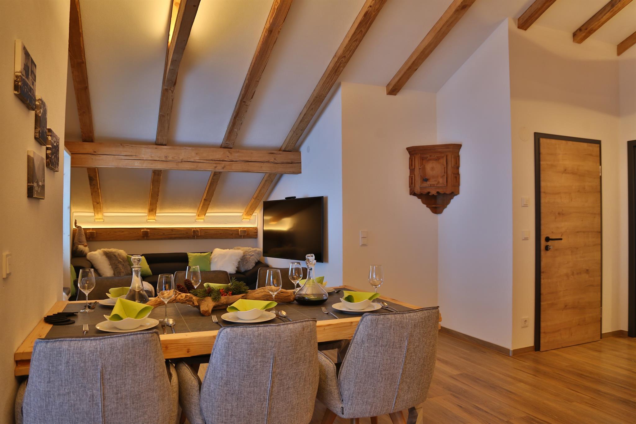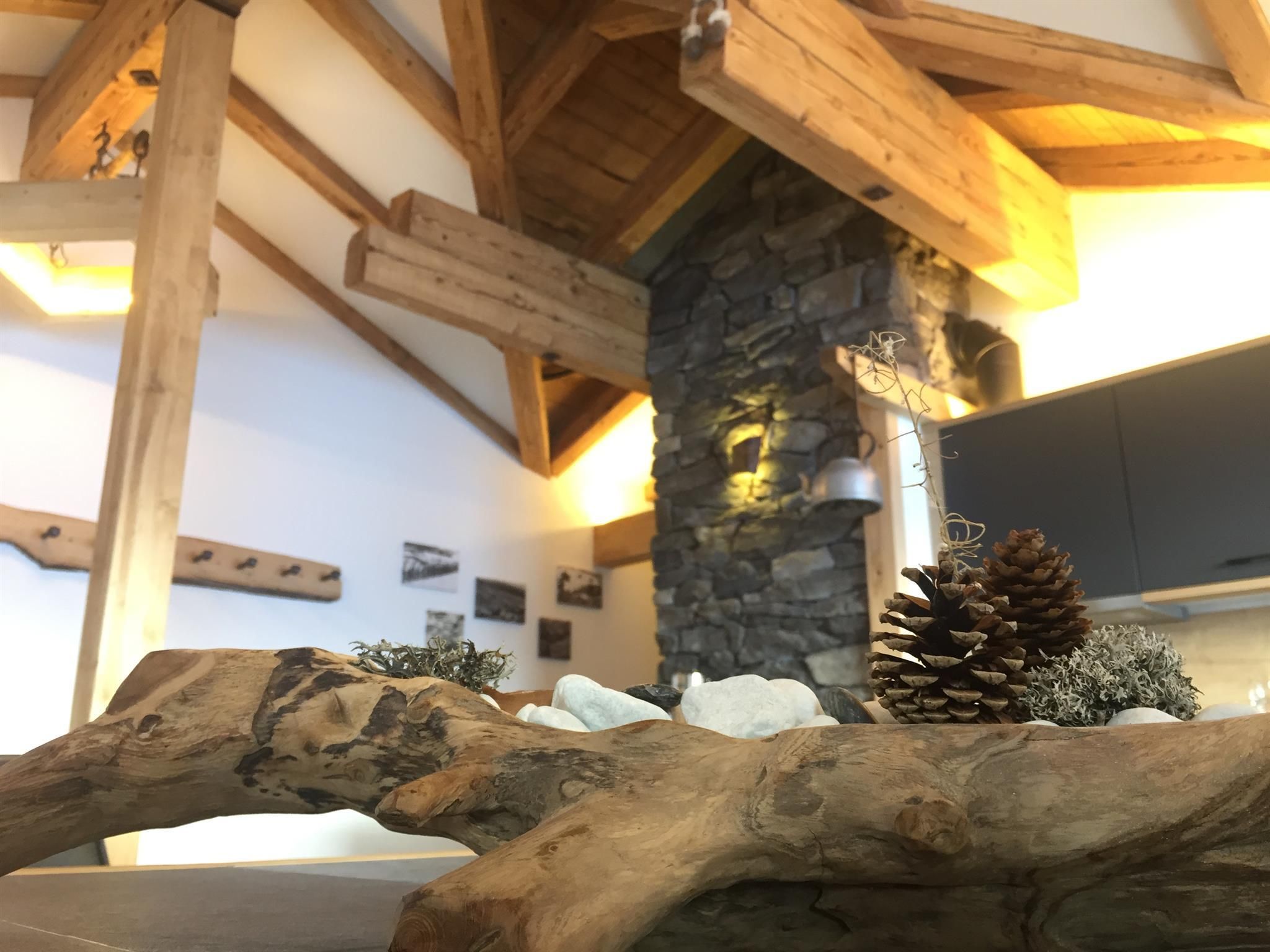 In Verbindung mit der indirekten, dimmbaren Beleuchtung kommt der alpenländische Chalet - Charme der Wohnung zur Geltung.