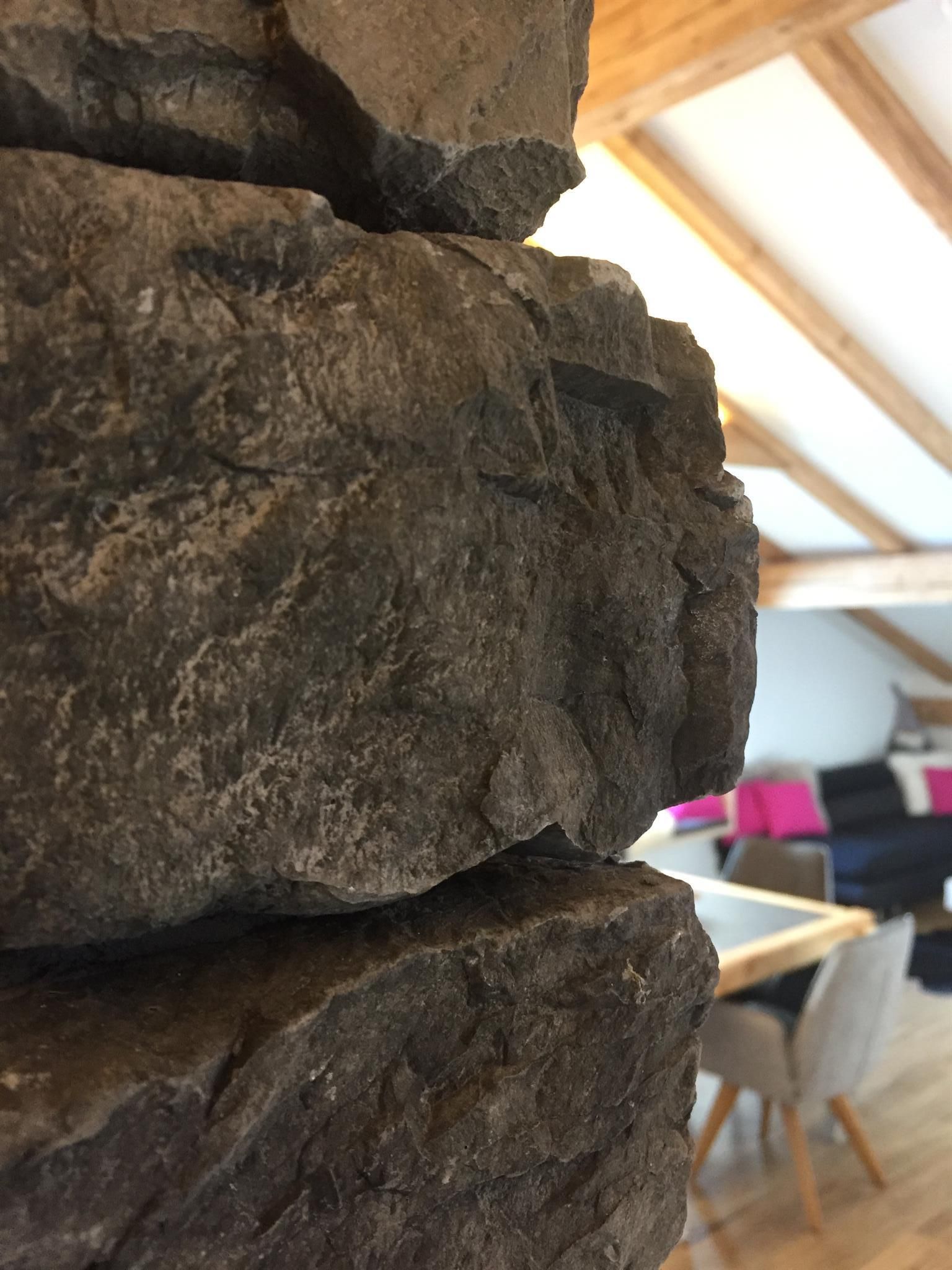 Beim Betreten der Wohn-Küche ist der massive Kreuzgiebel mit seinem Naturstein Kamin Mittelpunkt und Blickfang zugleich.
