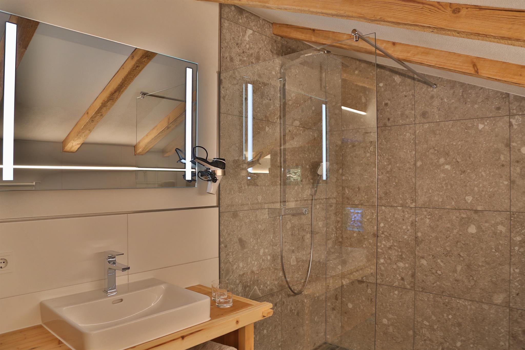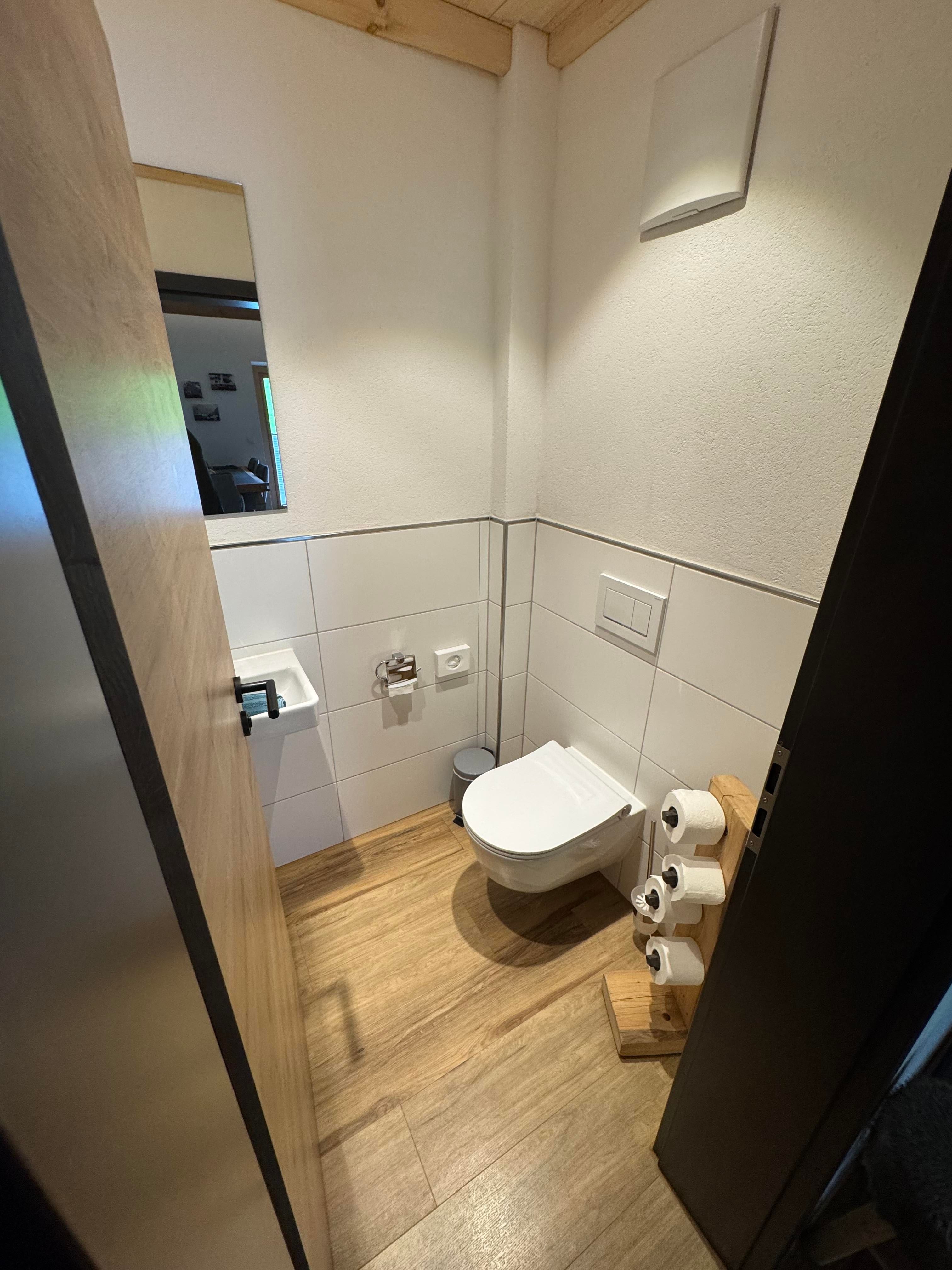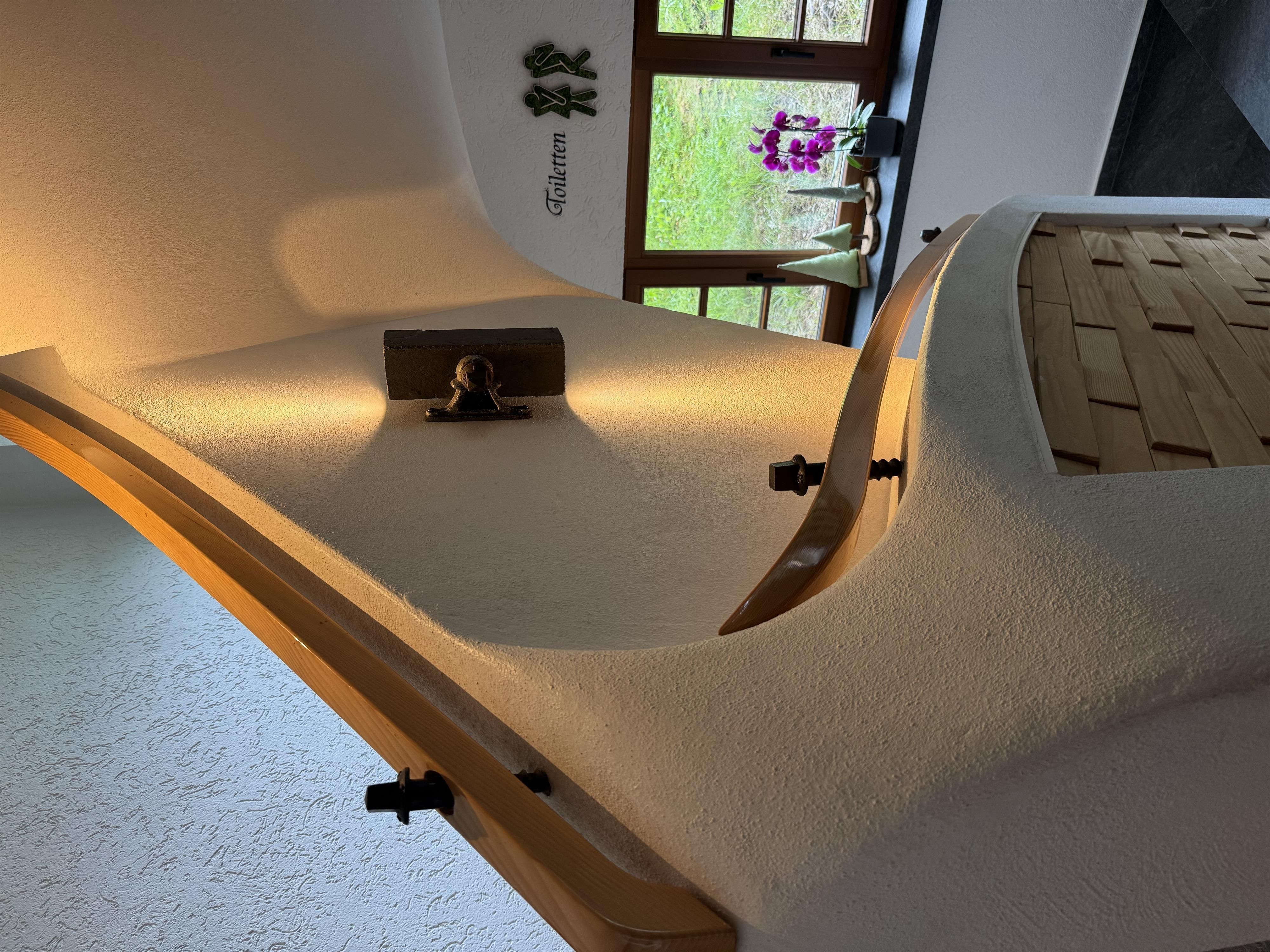Im Sommer 2018 wurde der obere Stock unsere Hauses entkernt und Dach, sowie die Wände komplett ökologisch mit Holzwolle gedämmt. Der originale Holz-Dachstuhl wurde aufwendig aufgearbeitet und in liebevoller Kleinarbeit in Szene gesetzt. Dies wird durch die indirekte, dimmbare LED - Beleuchtung noch unterstützt. Für ein wohliges und gemütliches Raumgefühl, sogar an kältesten Wintertagen, sorgt die im ganzen Stockwerk verlegte Fußbodenheizung.
