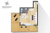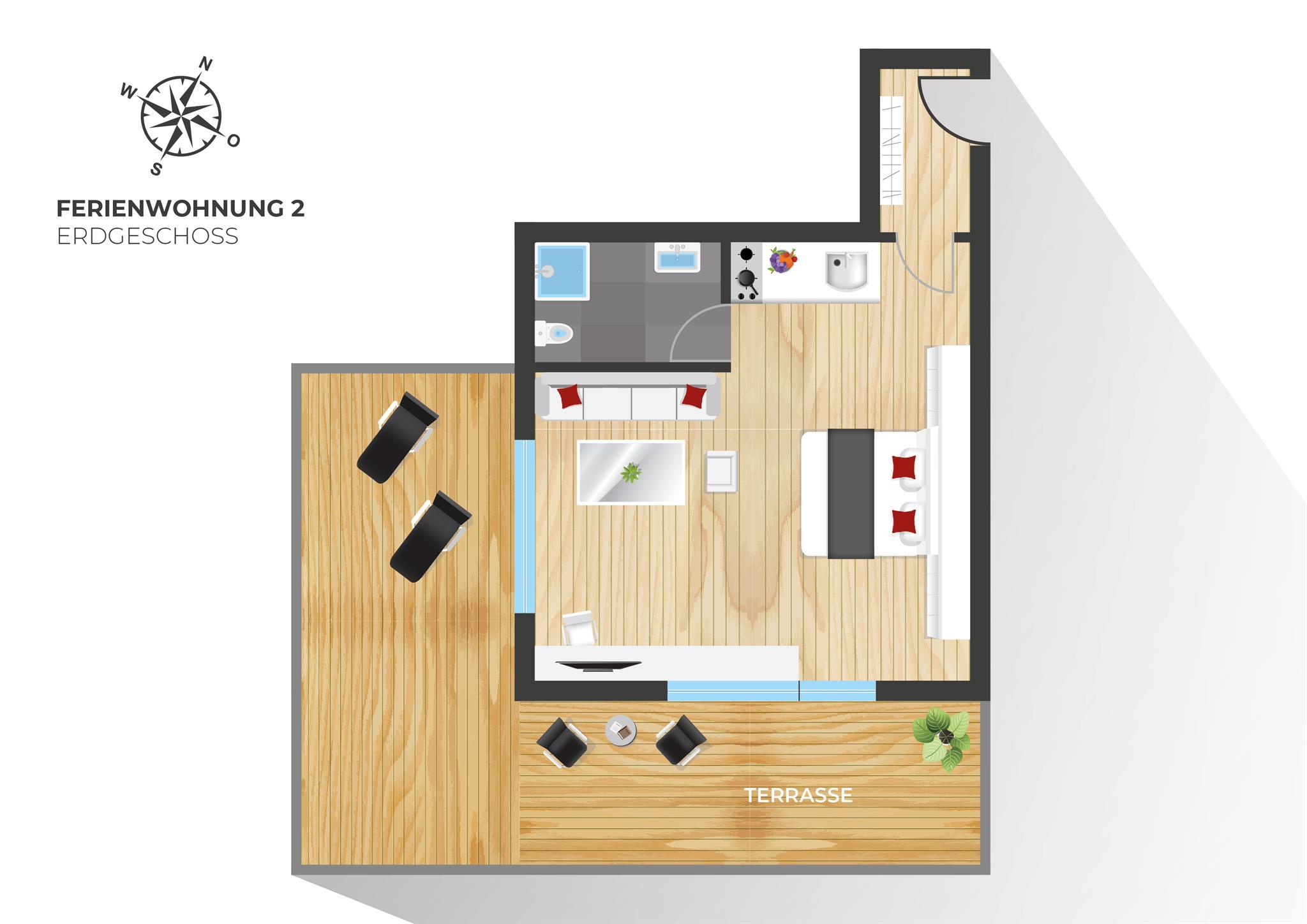 Ferienwohnung Typ 2, 30qm für 2 Personen, Wohn/Schlafraum (Doppelbett), Küchenzeile, Dusche/WC, SAT-TV, Safe, W-LAN, Radio und Terrasse.