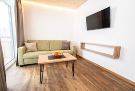 • Wohnzimmer mit ausziehbarer Schlafcouch und Sat-TV