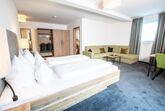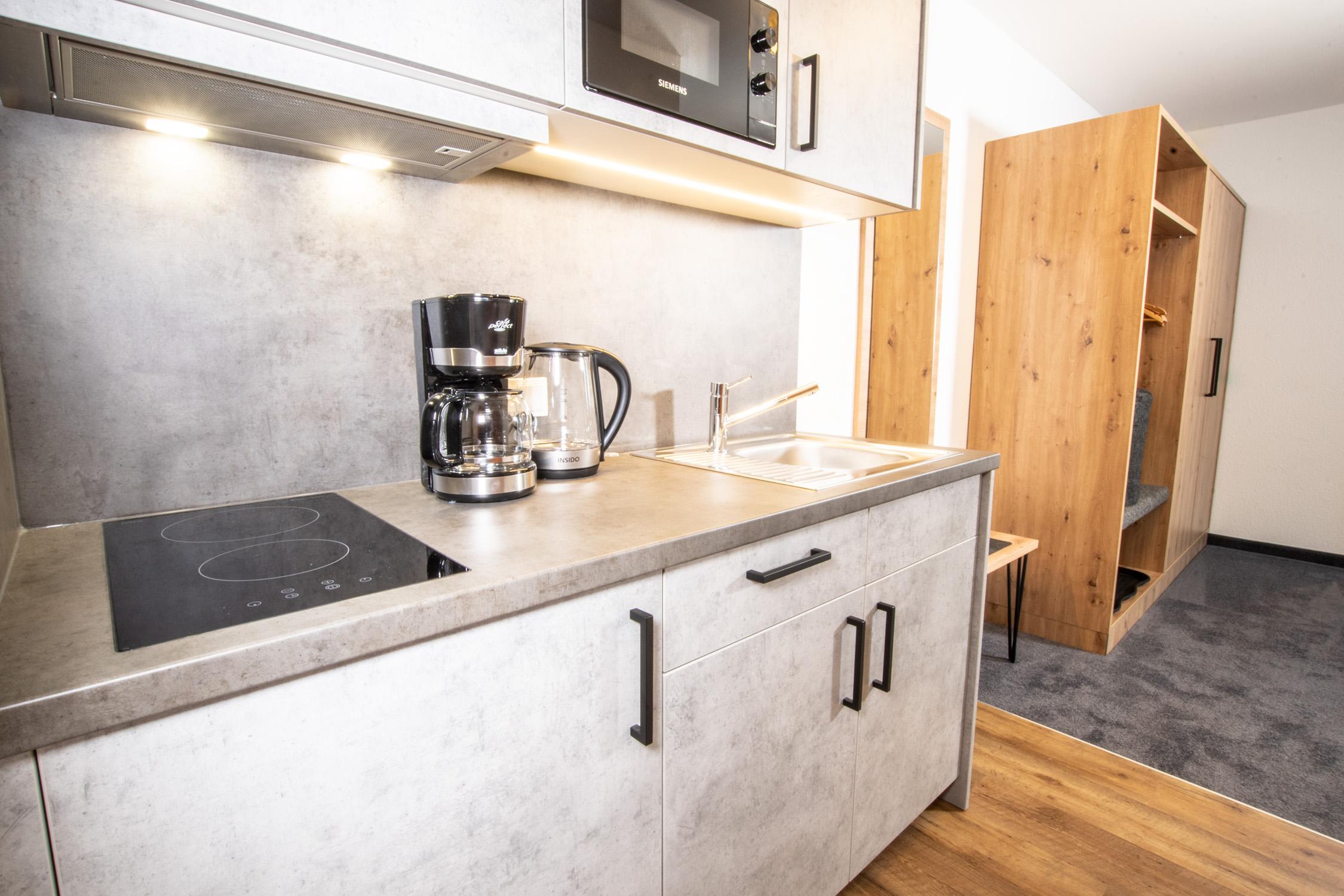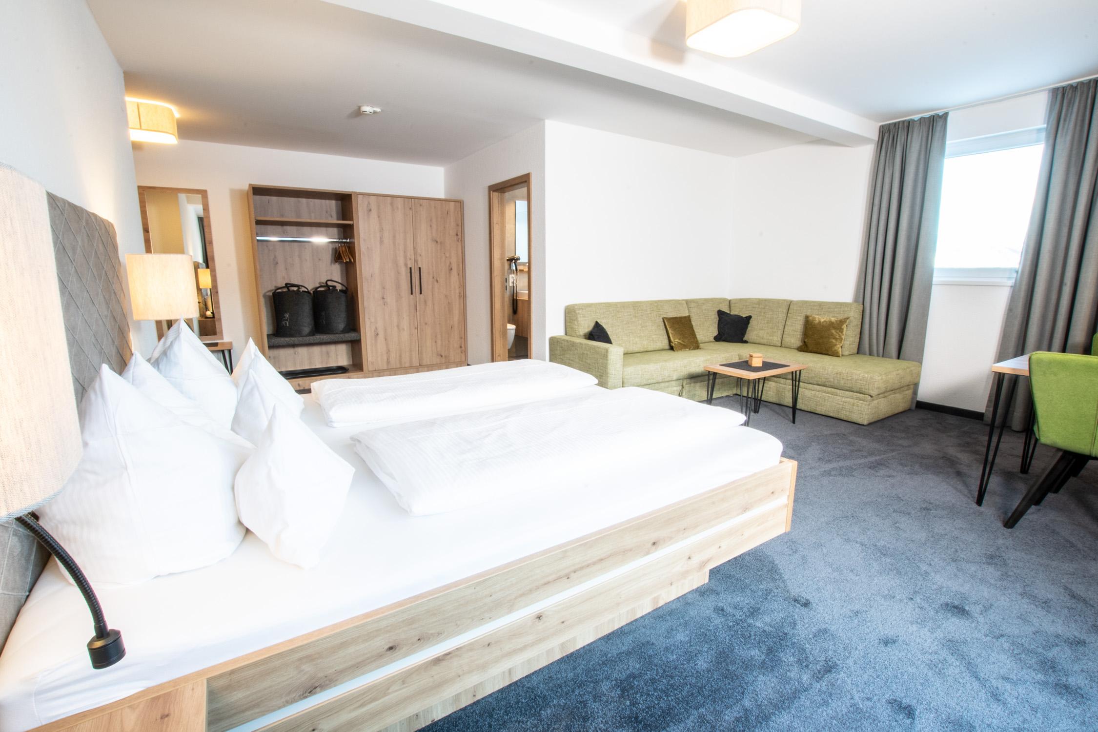 Großzügiges Doppelzimmer mit Esstisch und Stühlen sowie einer Küchenzeile – ideal für Familien. Gemütliche Couch zum Ausziehen. Balkon mit tollen Ausblick nach Süden auf die herrliche Bergwelt des Kleinwalsertals.