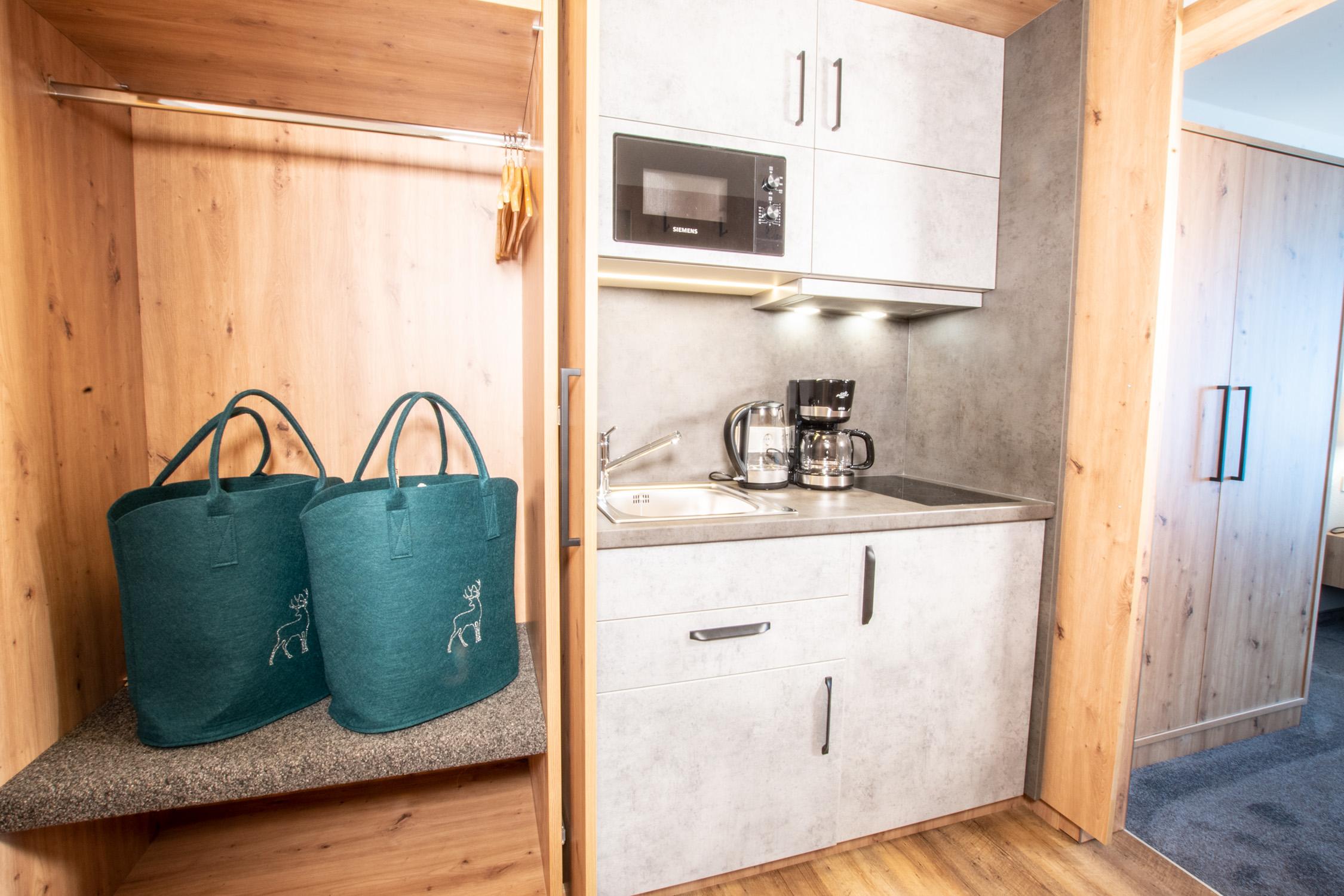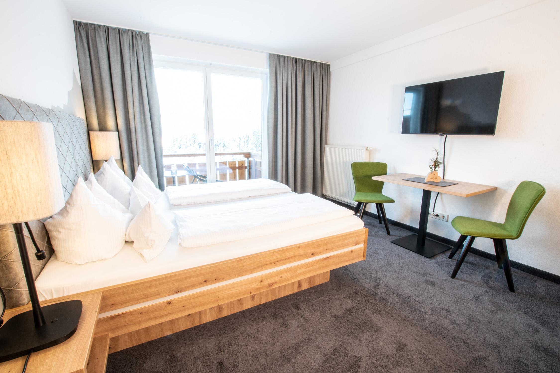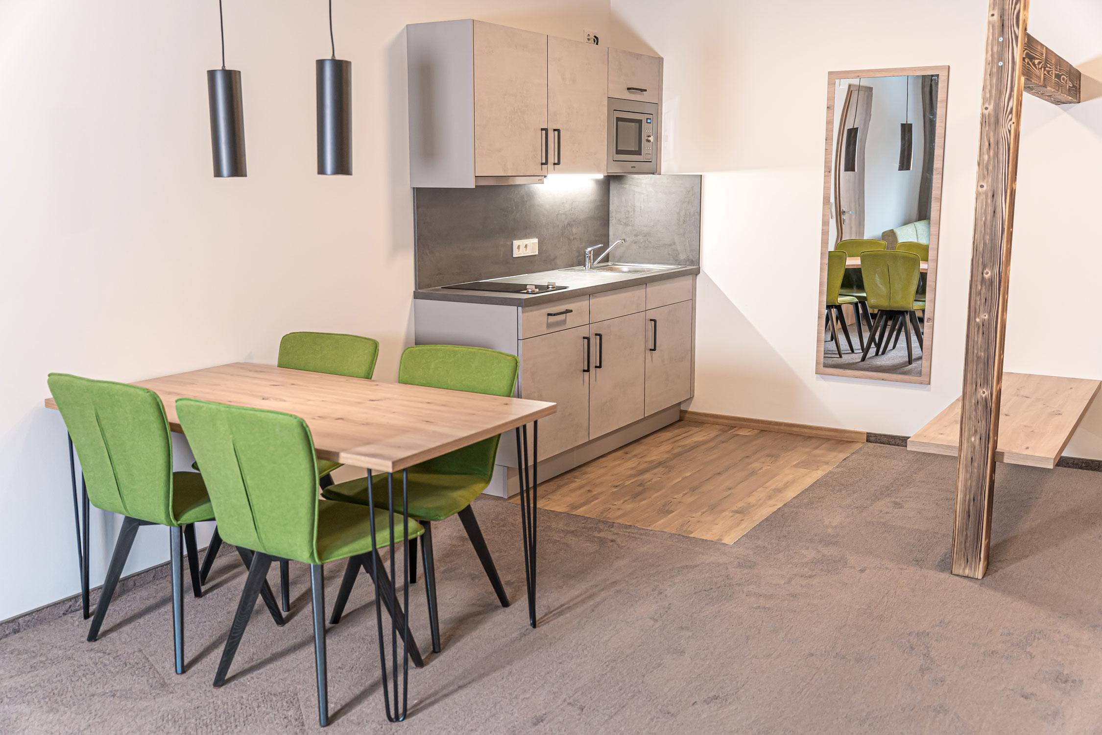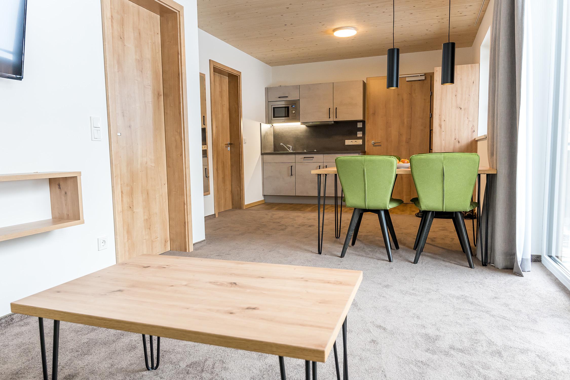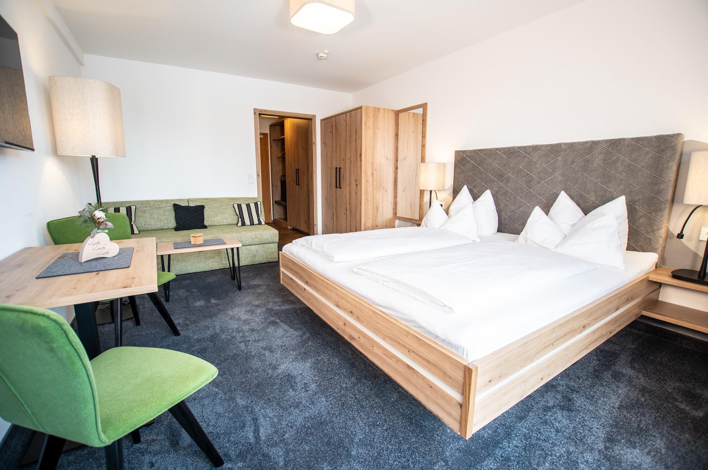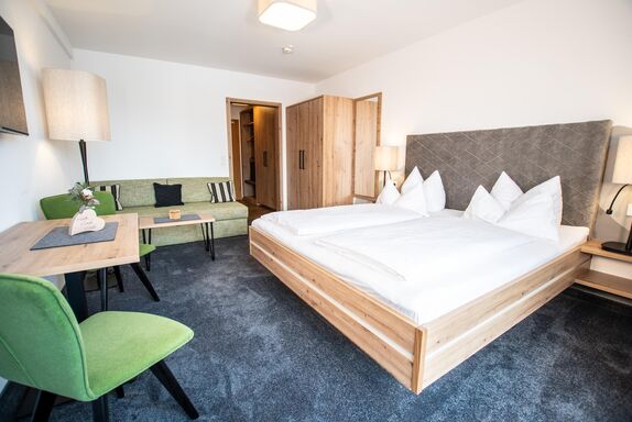 Doppelzimmer mit Balkon und Blick auf das Fellhorn. Ausgestattet mit modernen Möbeln im Eichenholzstil, einem Esstisch mit Stühlen sowie einer Küchenzeile und einer ausziehbaren Couch. Bad mit Dusche, WC und Föhn.