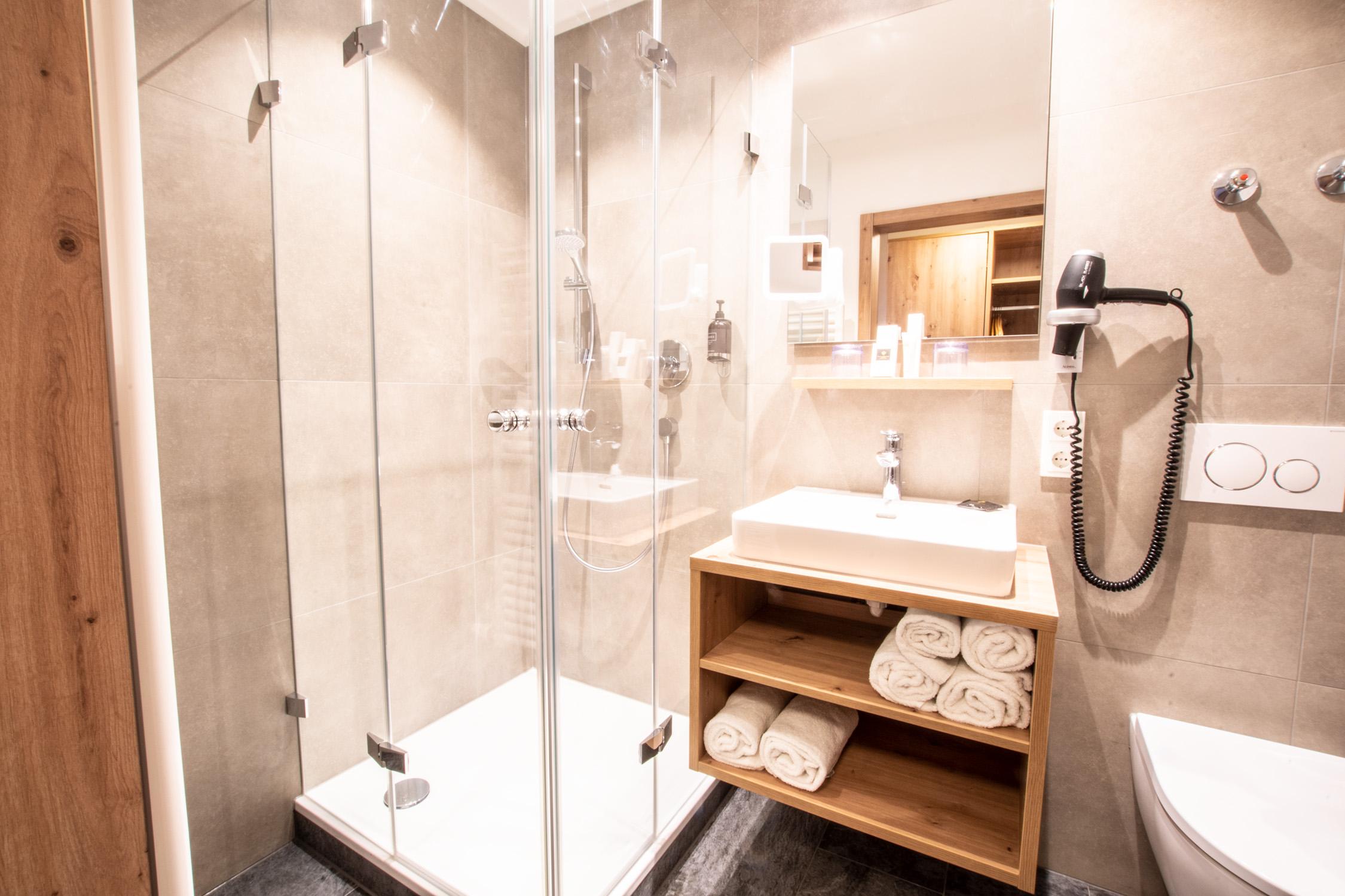 • Badezimmer (ohne Fenster) mit Dusche/WC, Fön, Bademänteln & Pflegeprodukten