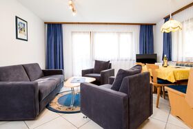 3 Zimmerwohnung (58 m2), 2. Stock, 2 Doppelzimmer, Wohnzimmer mit Wohnküche und Eckbank, Dusche/WC, West- und Südbalkon, CD-Player mit Radio/Telefon/SAT-TV/Wireless.