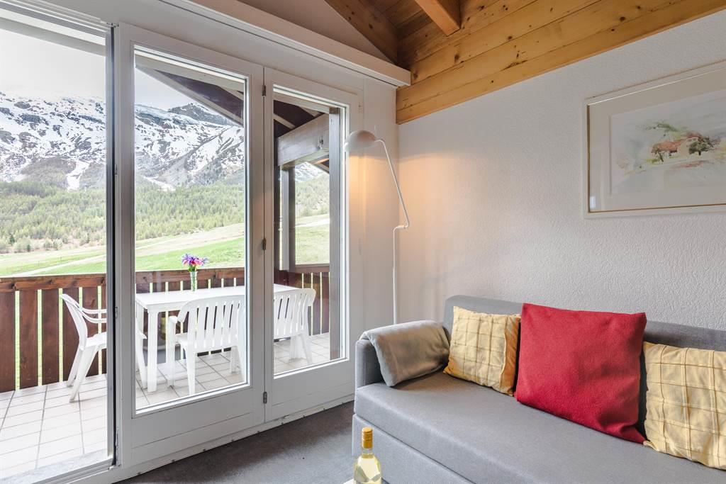 Der freundlich Wohn-/Essbereich mit Flat TV – Kabelfernsehr - Internet Wi-Fi unkostenlos und Ausgang zu grossem Süd-/Westbalkon mit herrlicher Panoramasicht auf die Berge und Skigebiet.