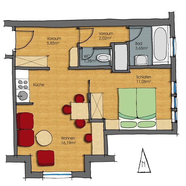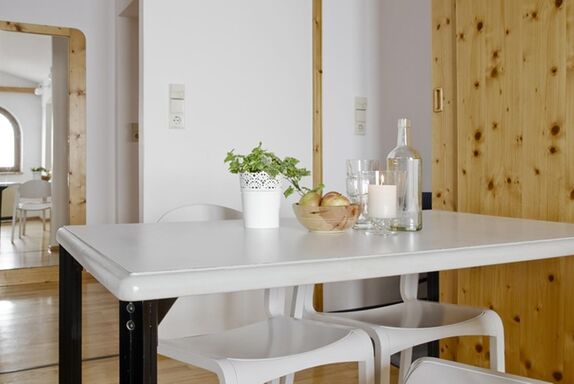 Unser Appartement SEEFELD befindet sich im dritten Stock und bietet Ihnen ein Schlafzimmer mit Doppelbett und einen Wohn-/Schlafraum mit Ausziehcouch für insgesamt 2 bis 4 Personen