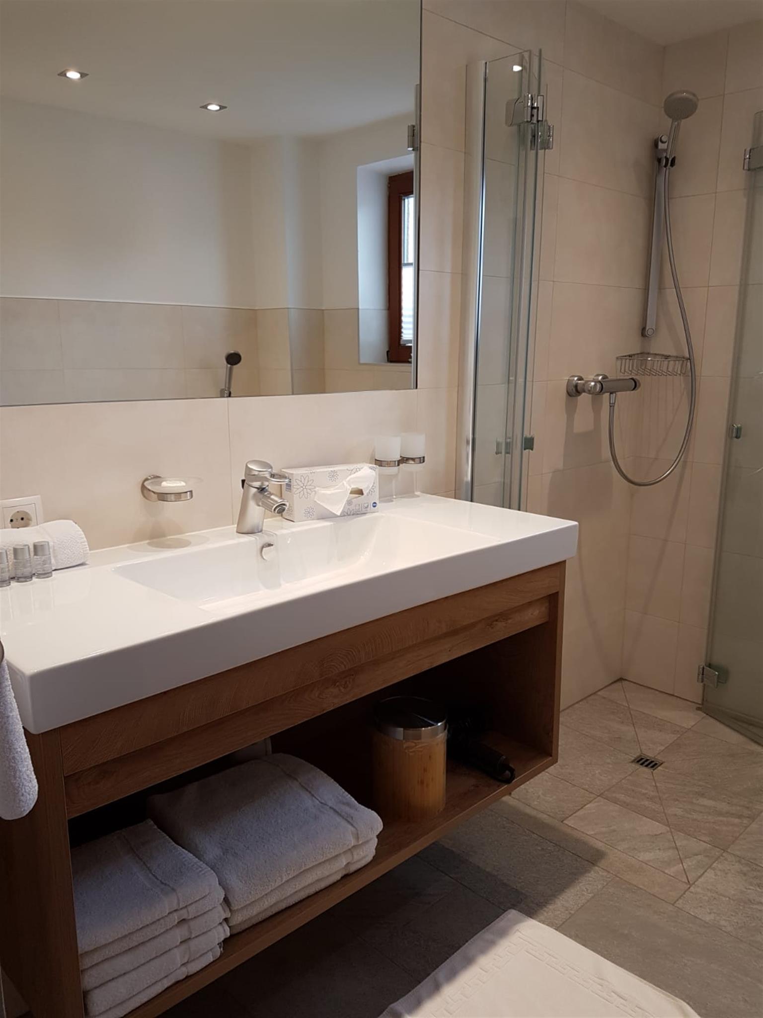 • Bad mit Doppelwaschbecken | Dusche & Badewanne | Fön, Hand- & Duschtücher | Seife & Duschgel | Kosmetikspiegel &-tücher