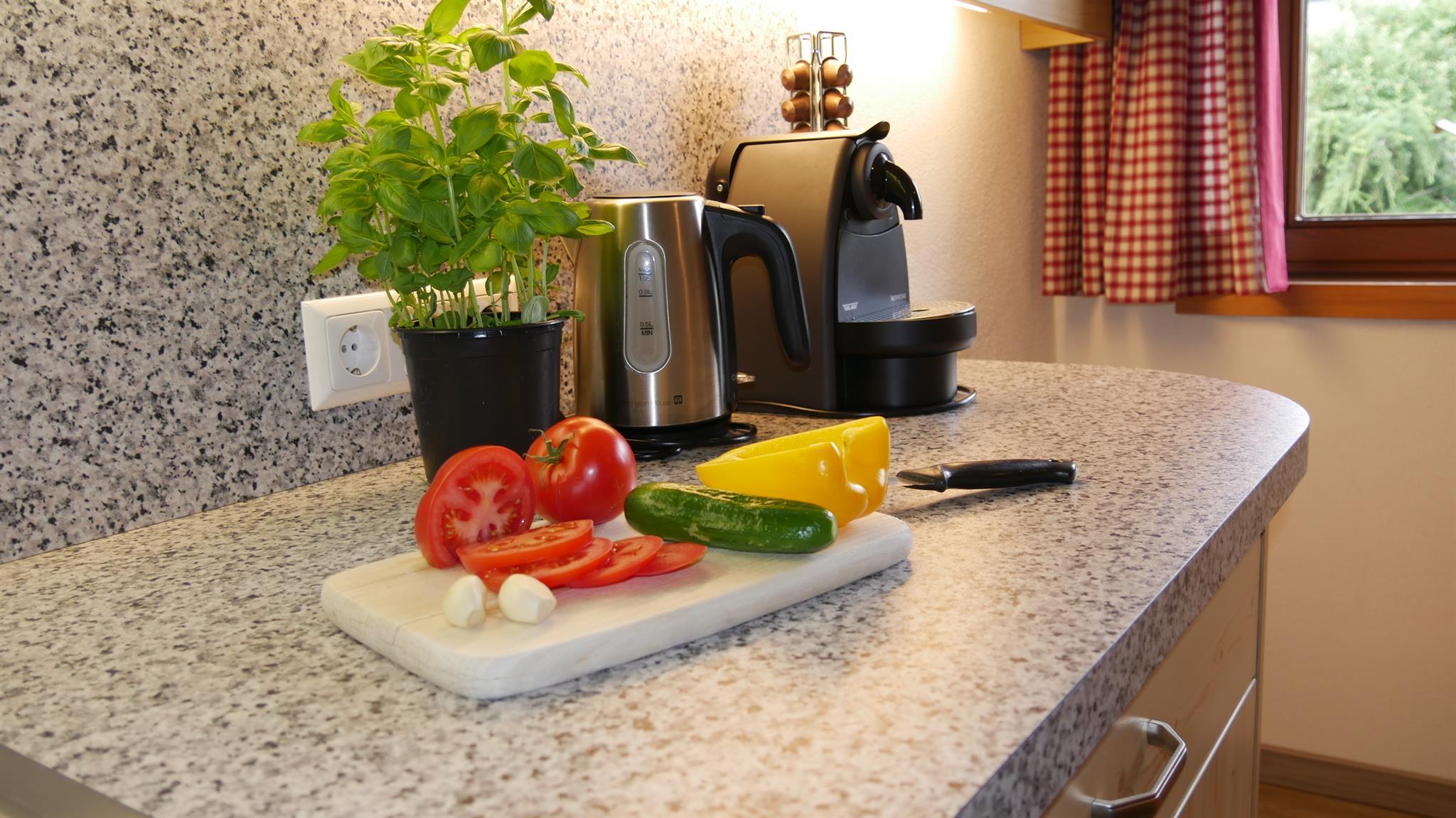 • große Wohnküche mit Herd | Backrohr | Geschirrspül- & Kaffeemaschine | Wasserkocher | Nespresso | Kühlschrank | Gefrierfach | Mikro | Radio | Ess-Sitzecke | Ess- & Kochgeschirr | Tischwäsche | Blick in den Garten
