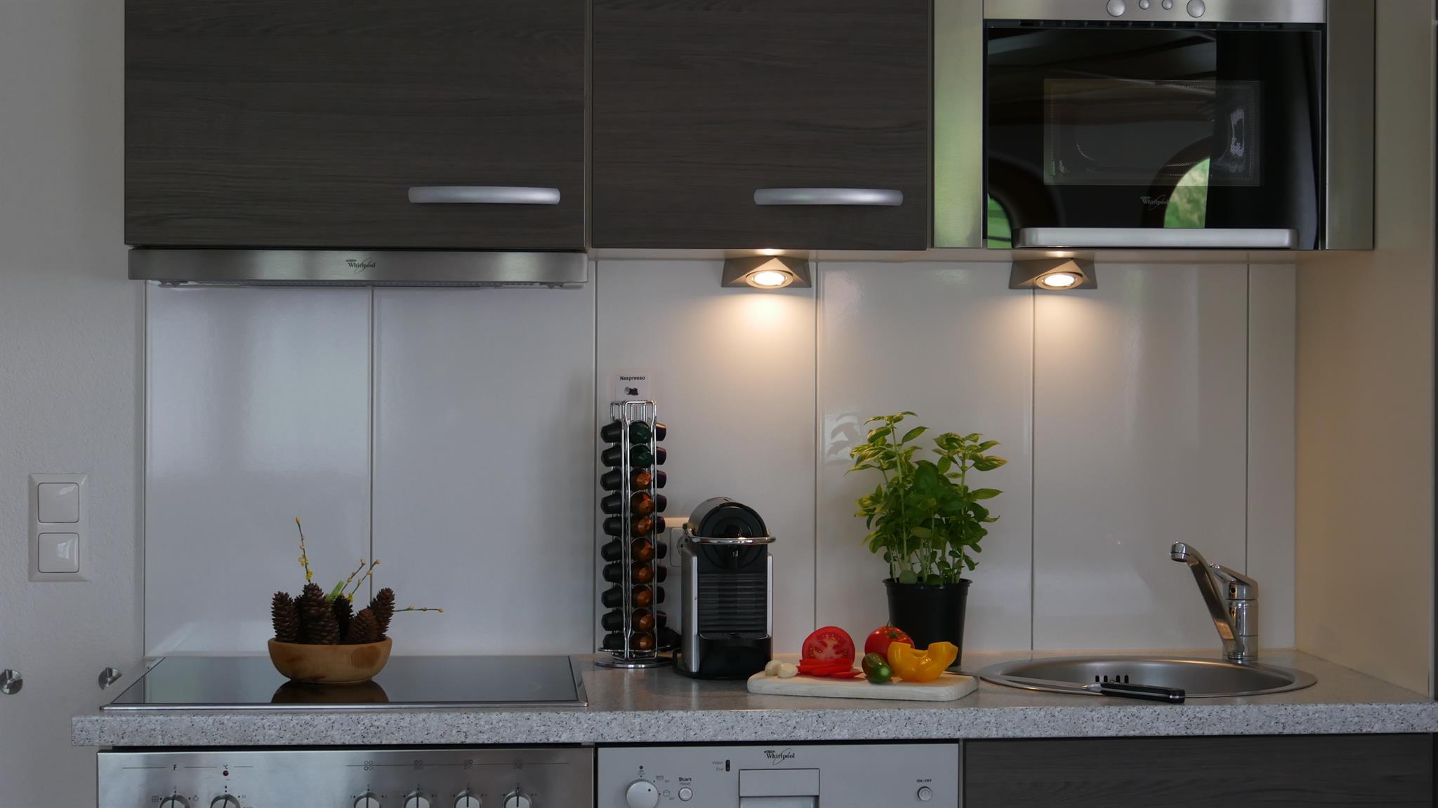 • große Wohnküche mit Herd | Backrohr | Geschirrspül- & Kaffeemaschine | Wasserkocher | Nespresso | Kühlschrank | Gefrierfach | Mikro | Radio | Ess-Sitzecke | Ess- & Kochgeschirr | Tischwäsche | Blick in den Garten | diese geht offen über ins
