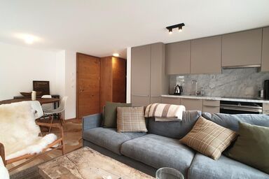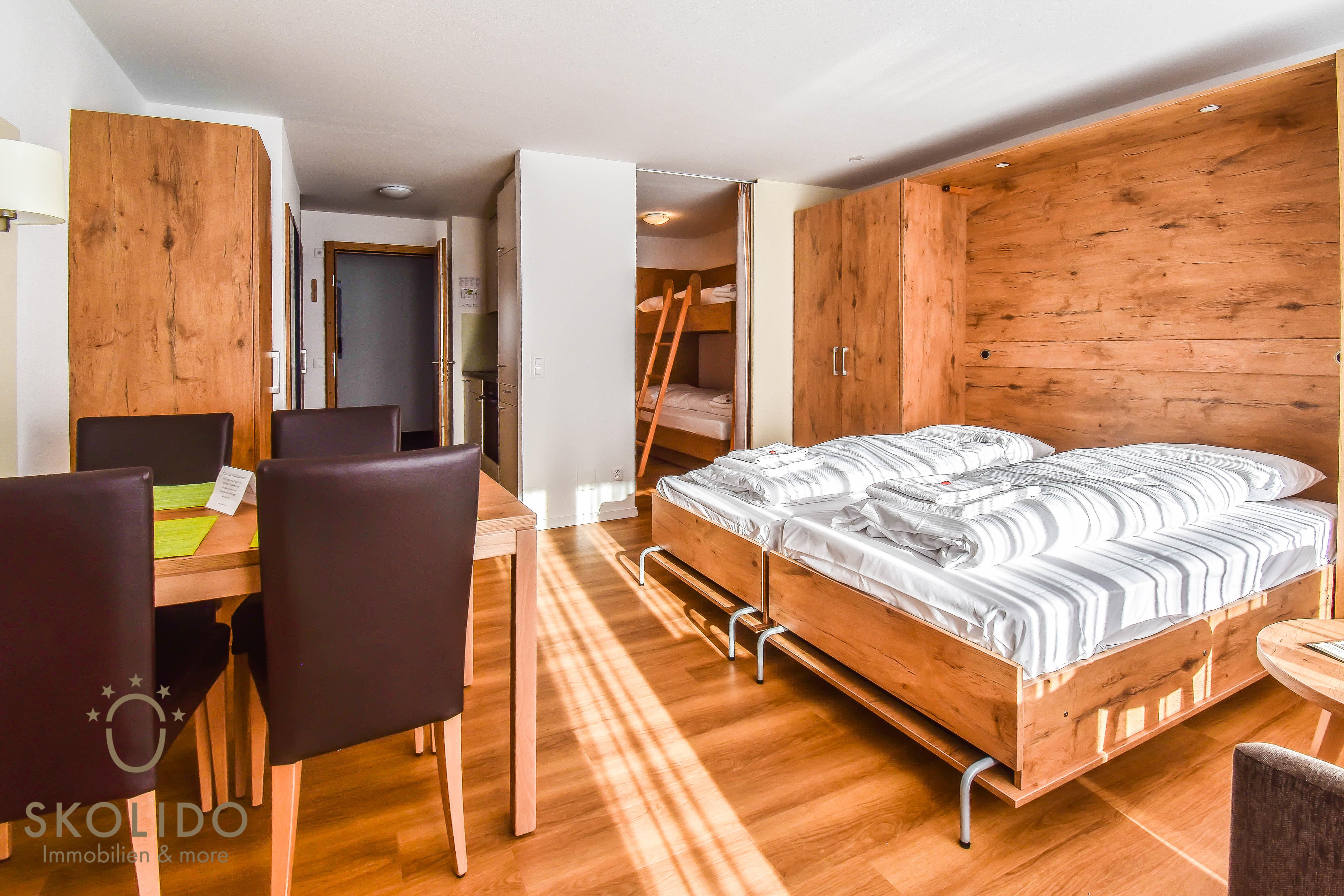Die im Süden des Gebäudes gelegene Wohnung bietet mit ihrem Balkon einen hervorragenden Blick in die Berge. Sie ist dieses Jahr neu renoviert worden und bietet auf 38 m2 Platz für 2-4 Personen. Die Wohnung verfügt über einen Ess- und Wohnraum mit einem Schrankbett/Doppelbett und einem kleinen Raum mit Etagenbett. Dieser Raum ist mit einem Vorhang abgetrennt. Ausserdem bietet die Wohnung eine funktional eingerichtete Kochnische und 1 Dusche/WC-Raum. Ideal ist die Wohnung sowohl für eine Familie mit zwei Kindern als auch nur für zwei Erwachsene.