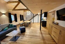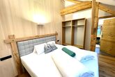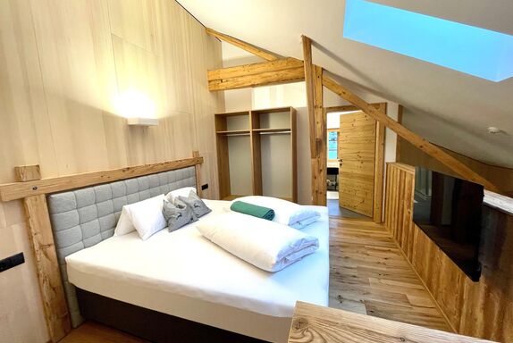 Ein drittes 75 m² großes Appartement für 4 bis 6 Personen im ersten Stock verfügt über zwei Schlafzimmer mit Boxspringbett, eine Schlafcouch, einem offenen Wohn-, Koch-und Essbereich und zwei Badezimmer mit Dusche/Badewanne und WC.