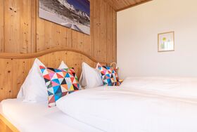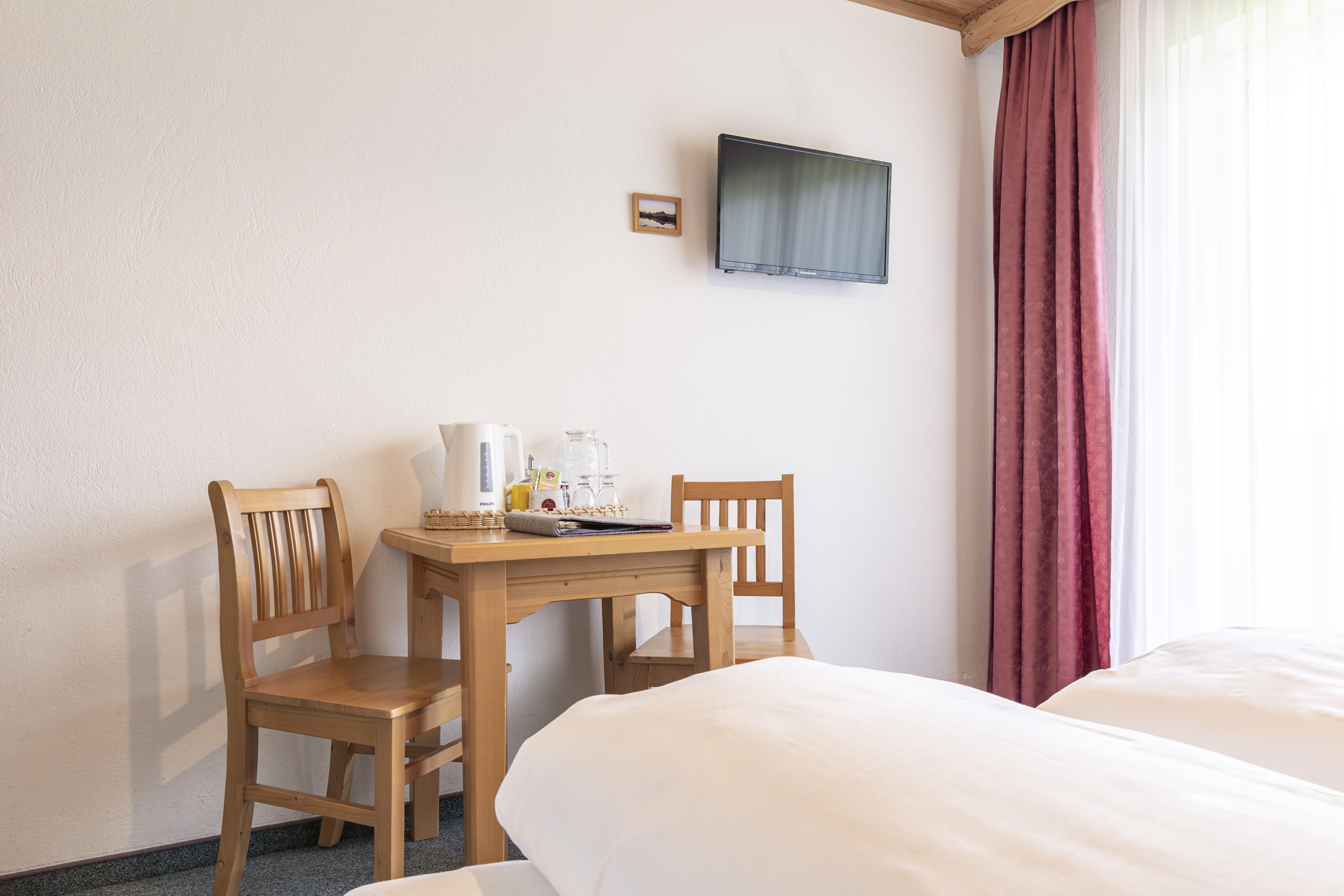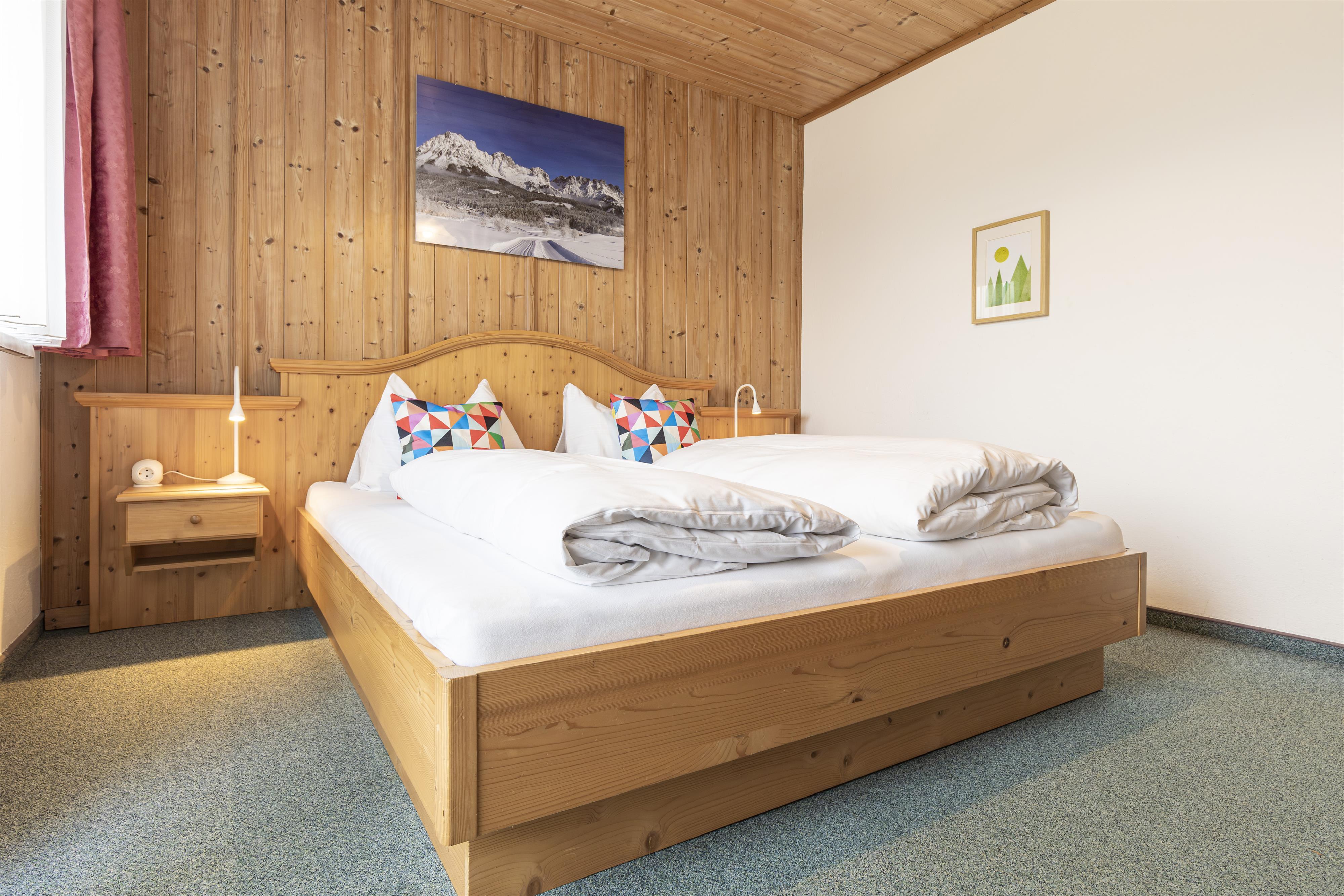 TRADITIONELLE GEMÜTLICHKEIT Damit ihr ausgeruht in das nächste Bergabenteuer starten könnt, ist die Ausstattung unserer Doppelzimmer ein Mix aus traditionellen Vollholzmöbeln und moderner Einfachheit. Die Einrichtung unserer gemütlichen Doppelzimmer beinhaltet Doppelbetten mit Nachttischen inklusive Lampen, sowie einen Kleiderschrank und eine Garderobe. Zudem findet ihr in den größtenteils neu renovierten Badezimmern einen Föhn, Handtücher und regionale BIO Hand- und Duschseife.