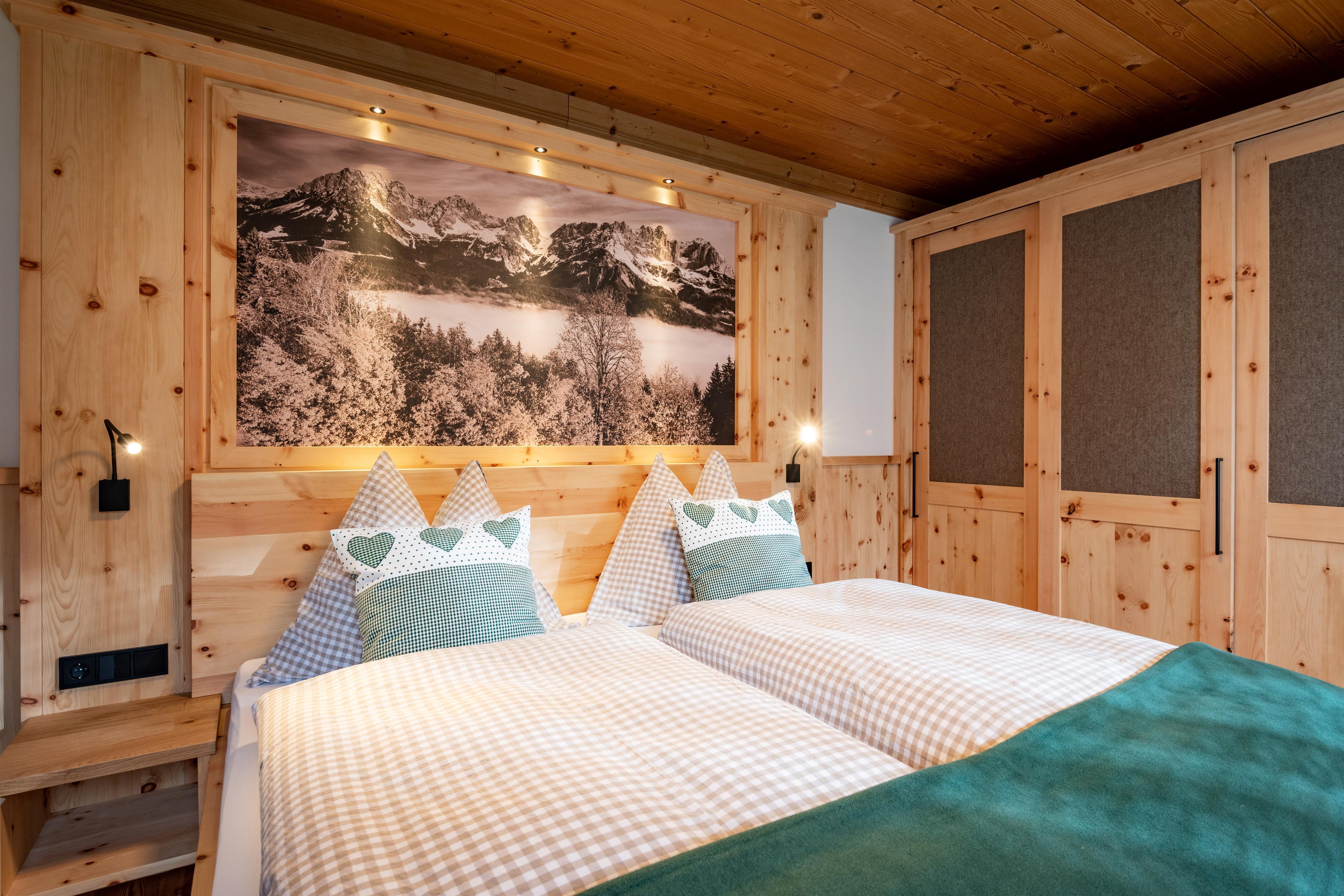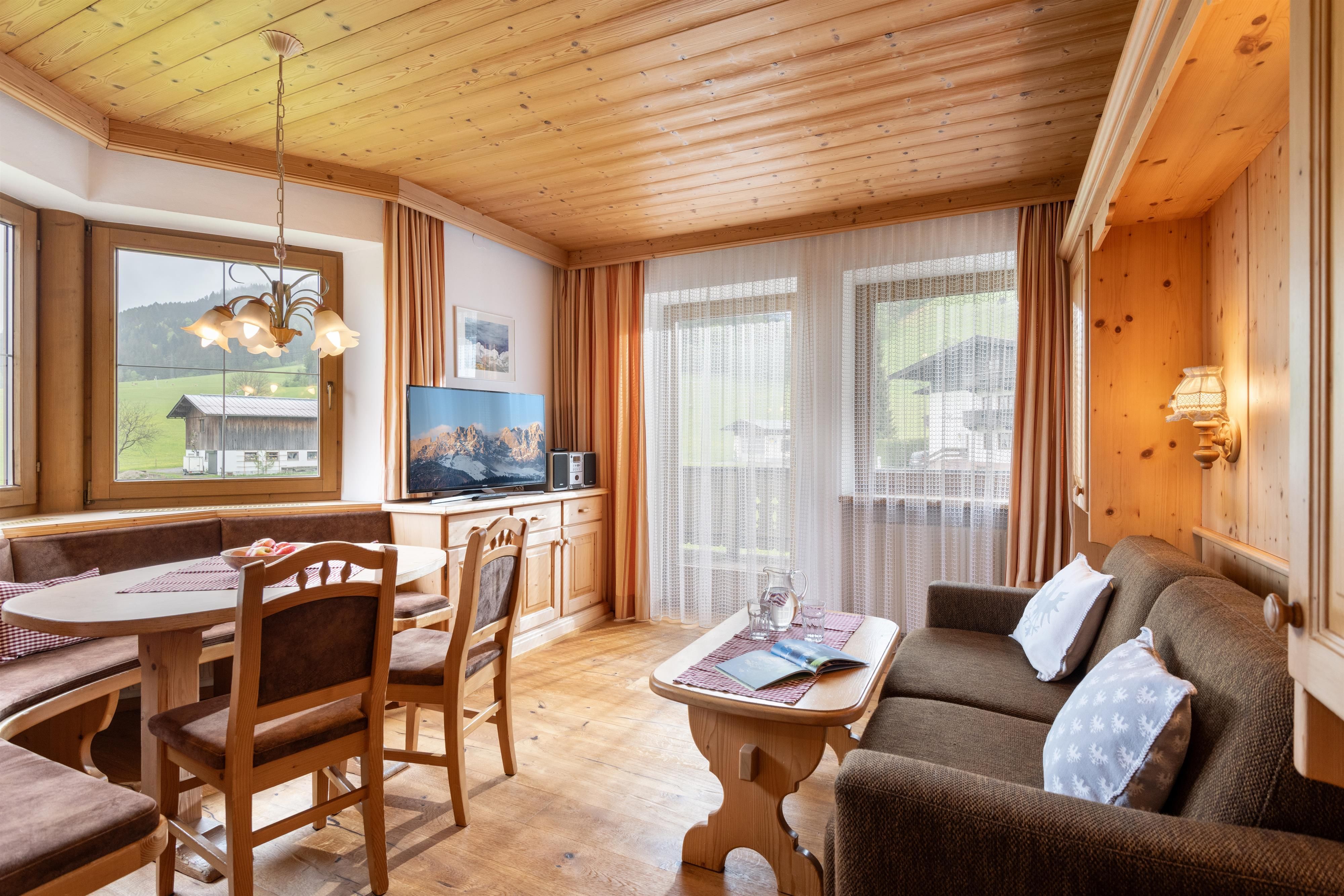 Unsere drei im 1.Stock und im Souterrain gelegenen Nichtraucher-Ferienwohnungen, sind gemütlich im Tiroler Stil komplett und komfortabel eingerichtet. Genießen Sie bei den oberen Appartements die sonnigen Balkone mit Panoramablick zur Kapelle, zum Hartkaiser und zum imposanten Wilden Kaiser; im Winter können Sie die tollen Veranstaltungen auf der Stangl-Leit direkt von Ihrem Balkon aus miterleben.