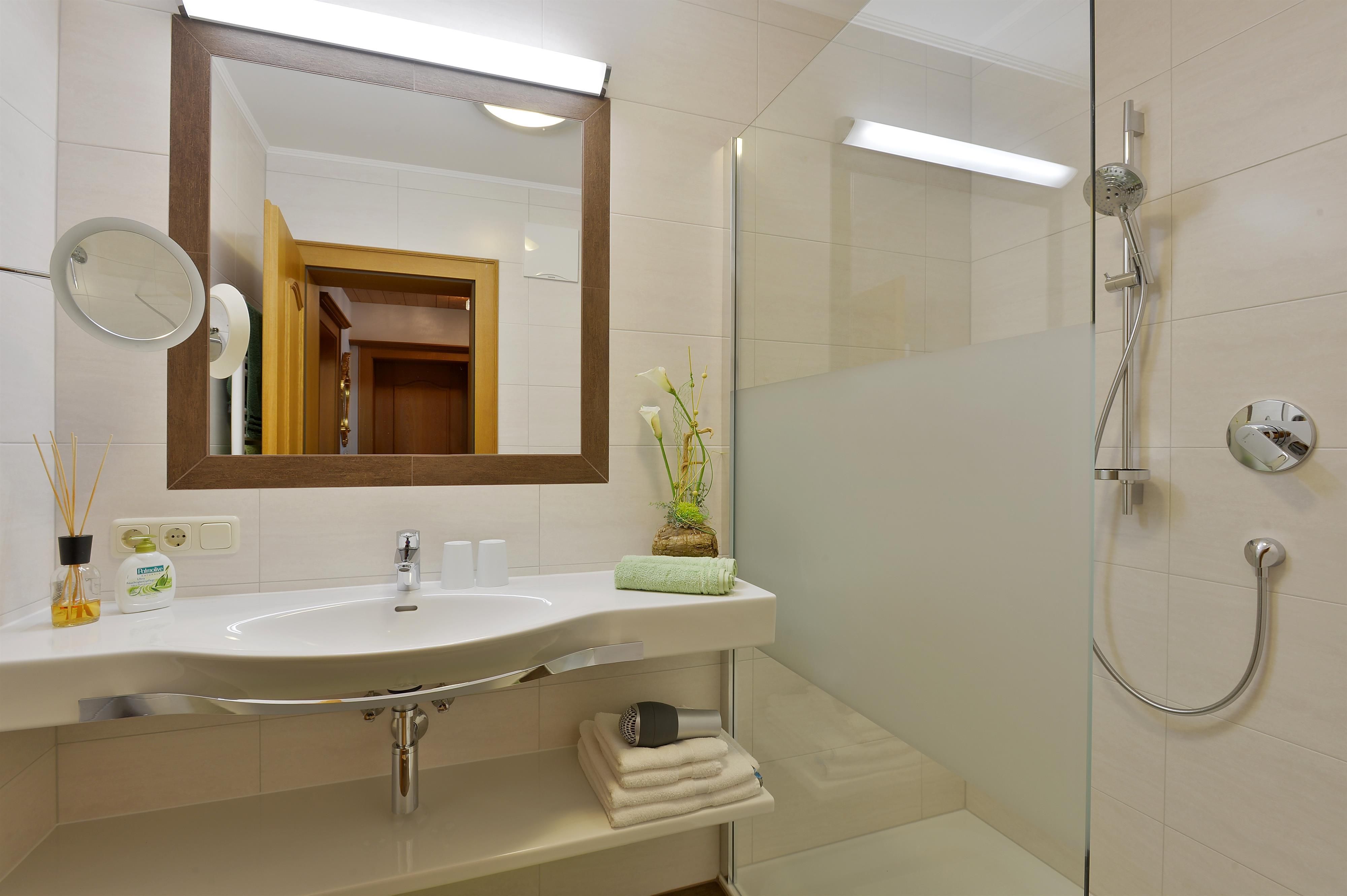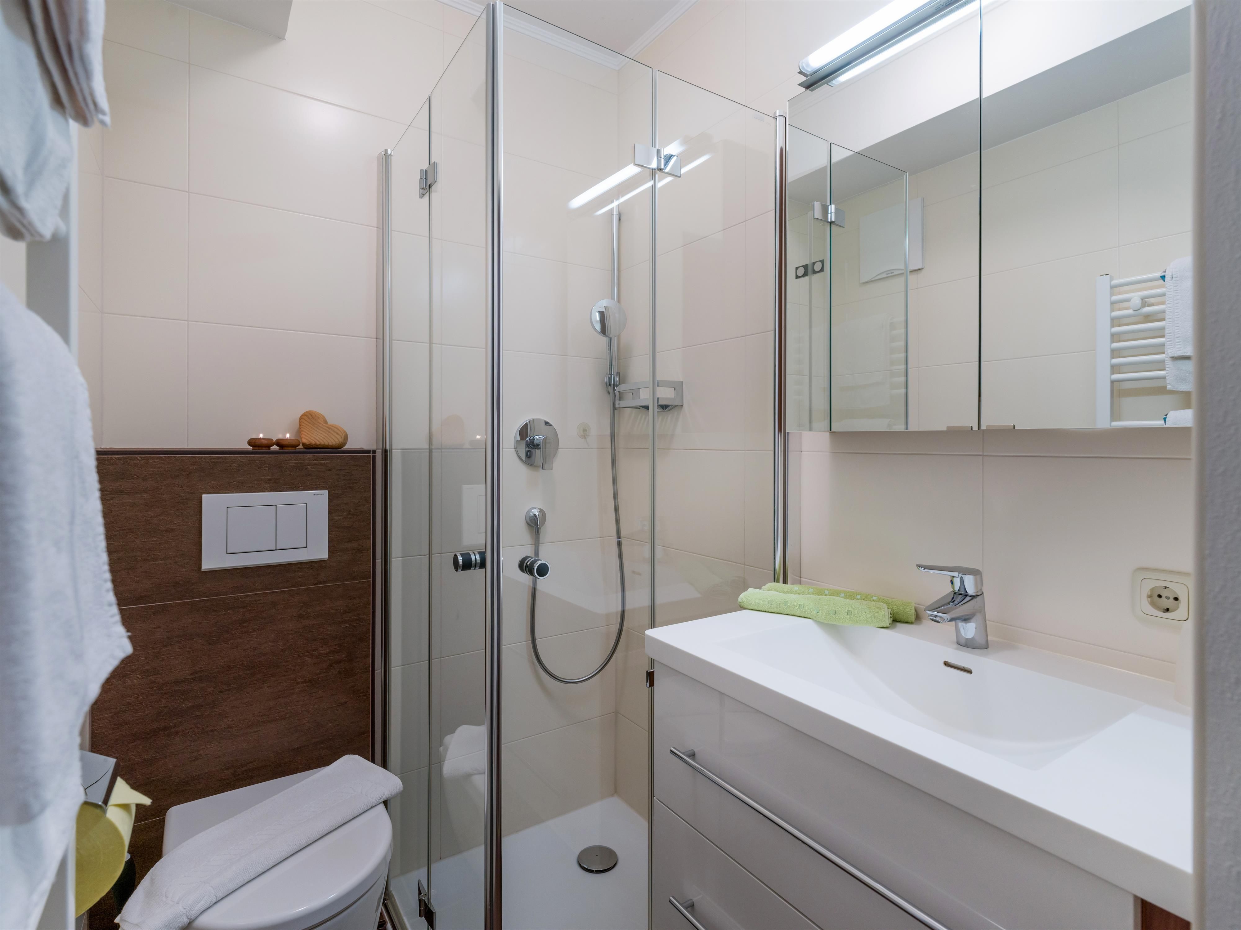 Die Ferienwohnung verfügt über ein separates WC. Der sonnige Balkon mit Blick zum Kapellenpark sowie zum Wahrzeichen von Ellmau, der Maria-Heimsuchungskapelle, lädt zum Verweilen ein.