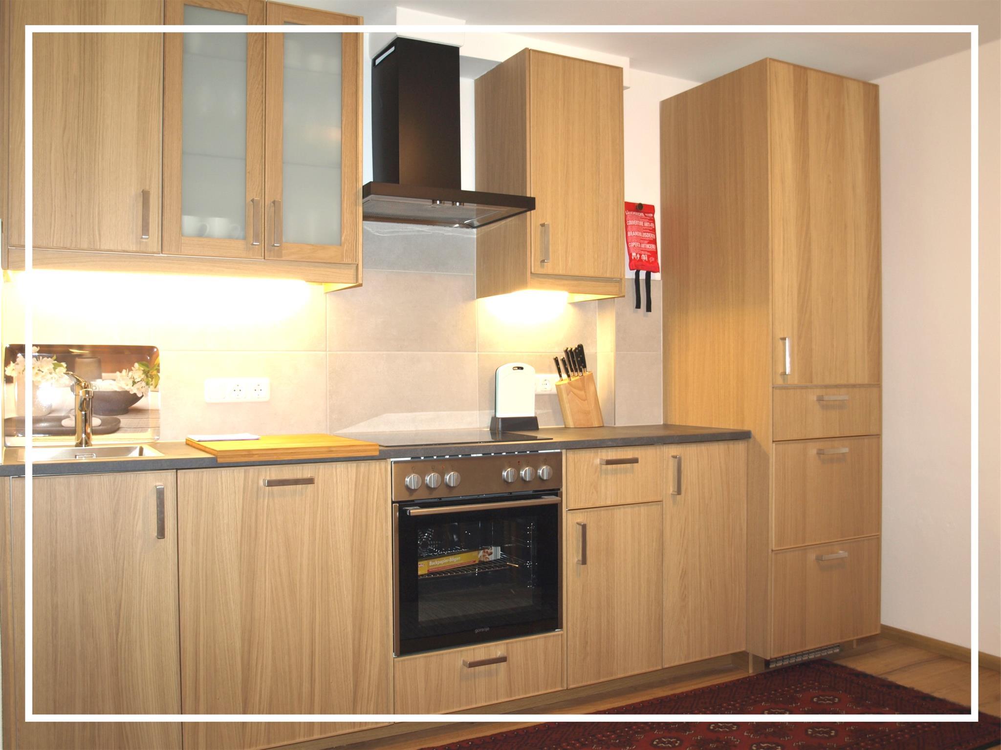 > Ess- und Wohnraum mit Eichenlandhausdielen und ausgestatteter Küche (Spülmaschine/Backrohr vorhanden), Sofa, LED-Digital-Cabel-TV, Essecke;
