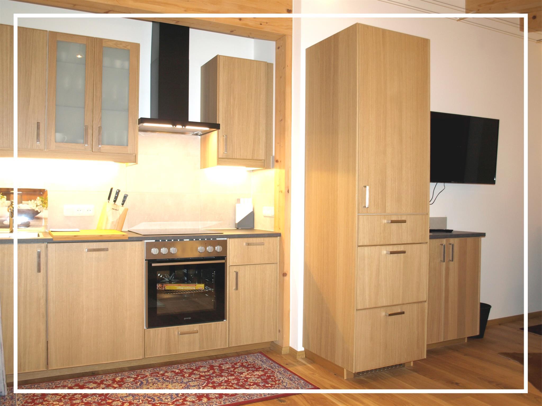 > Ess- und Wohnraum mit Eichenlandhausdielen und ausgestatteter Küche (mit Spülmaschine und Backrohr), Sofa, TV, Essecke und