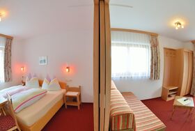 Unsere Familienzimmer, mit 2 getrennten Schlafzimmern, sind für 2-4 Personen geeignet. Außerdem sind die Zimmer mit Dusche ausgestattet. Die Zimmer verfügen über Bad/WC, Balkon, TV, Telefon, Haarfön, Safe, Radio, WC separat, Bademäntel und Slipper und sind mit kleiner Kochnische.