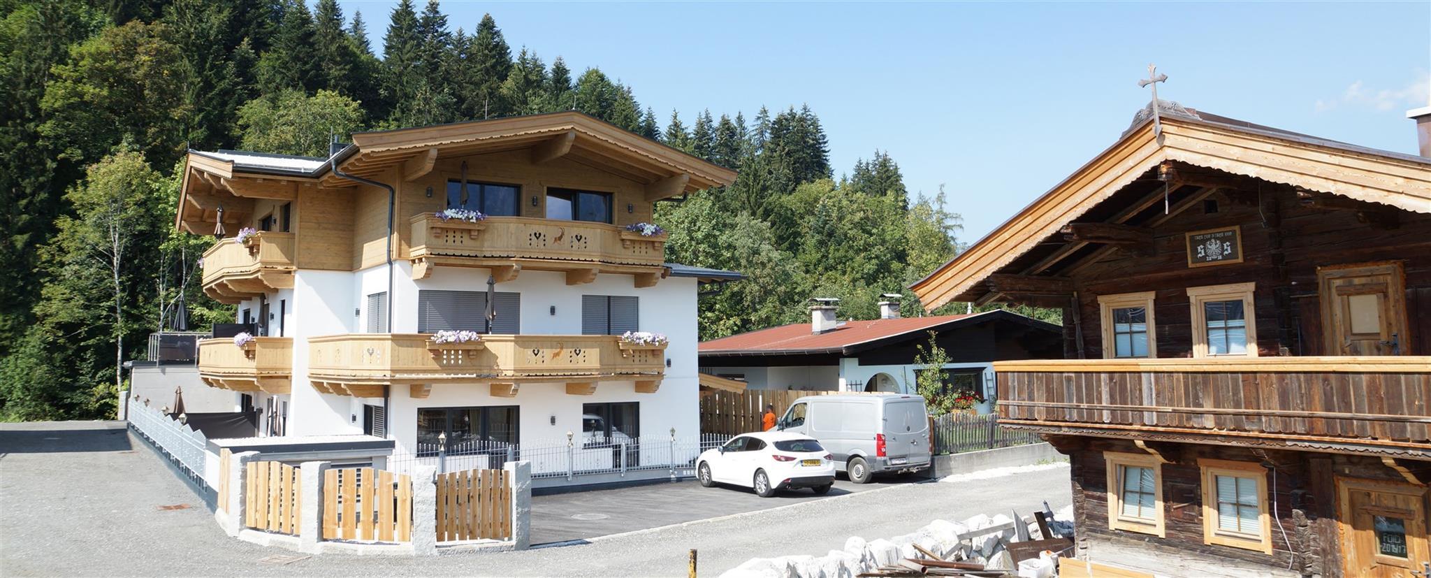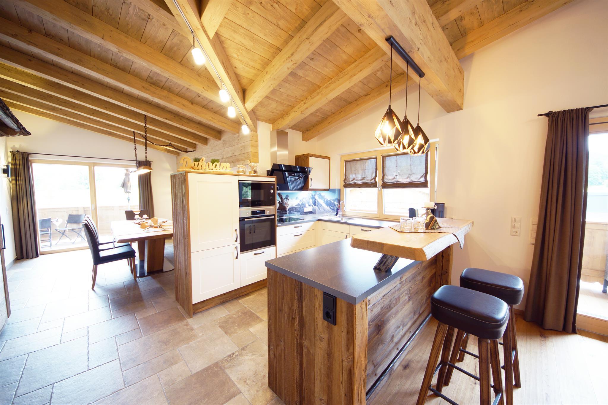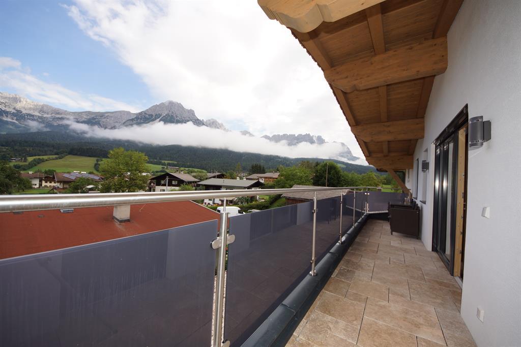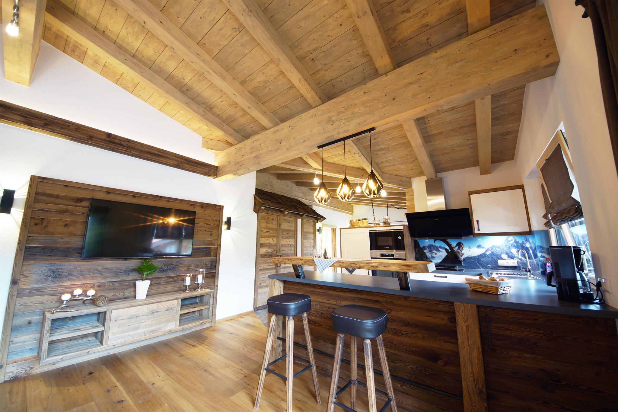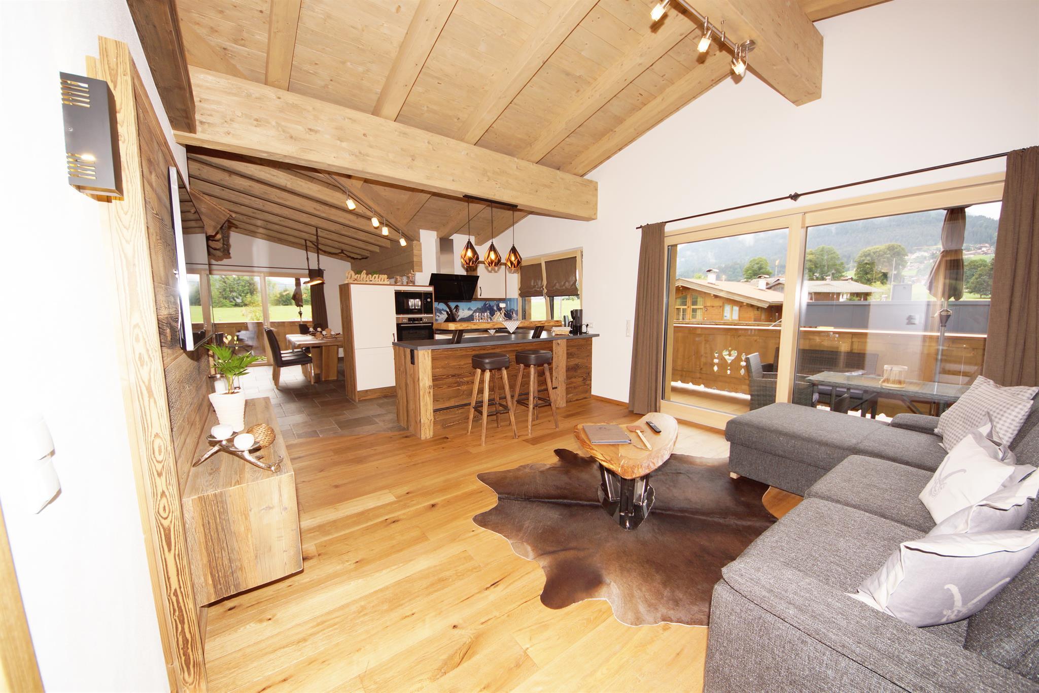 Die Ferienwohnung ist unser ganzer Stolz und lässt keine Wünsche offen. Die Dachgeschosswohnung für 6-8 Personen mit unglaublichen Blick zum Wilden Kaiser, Kitzbüheler Horn und den Hartkaiser, “ begeistert mit einer großzügigen Raumaufteilung.