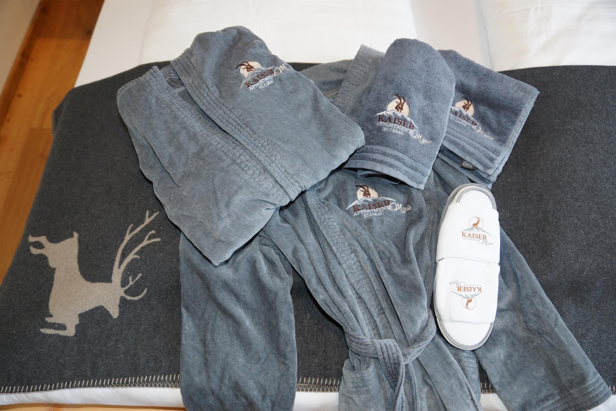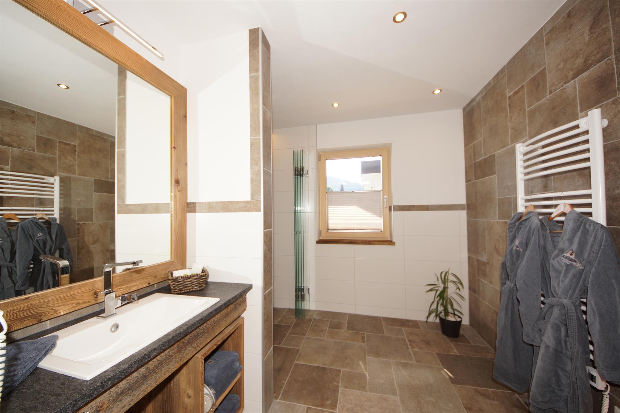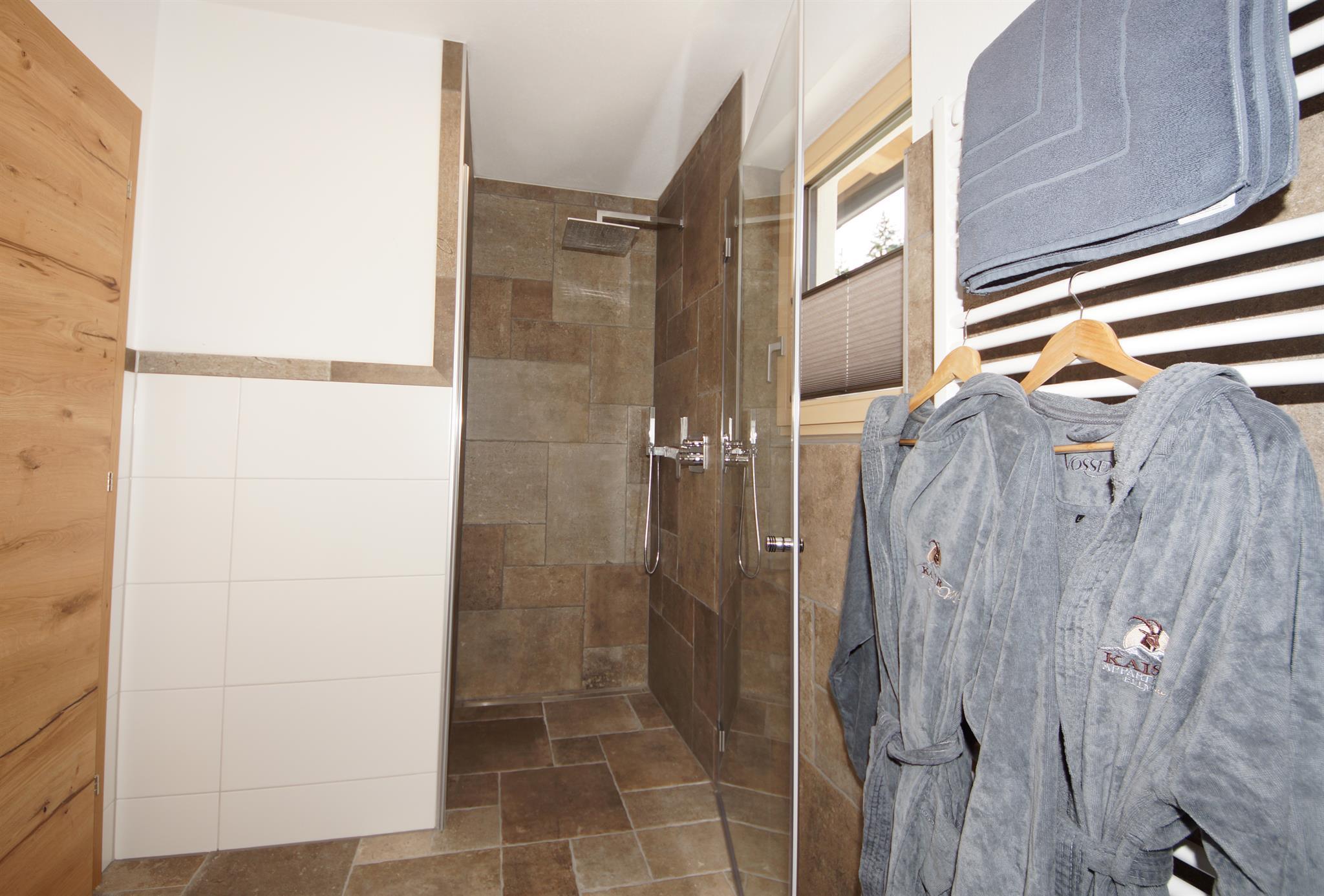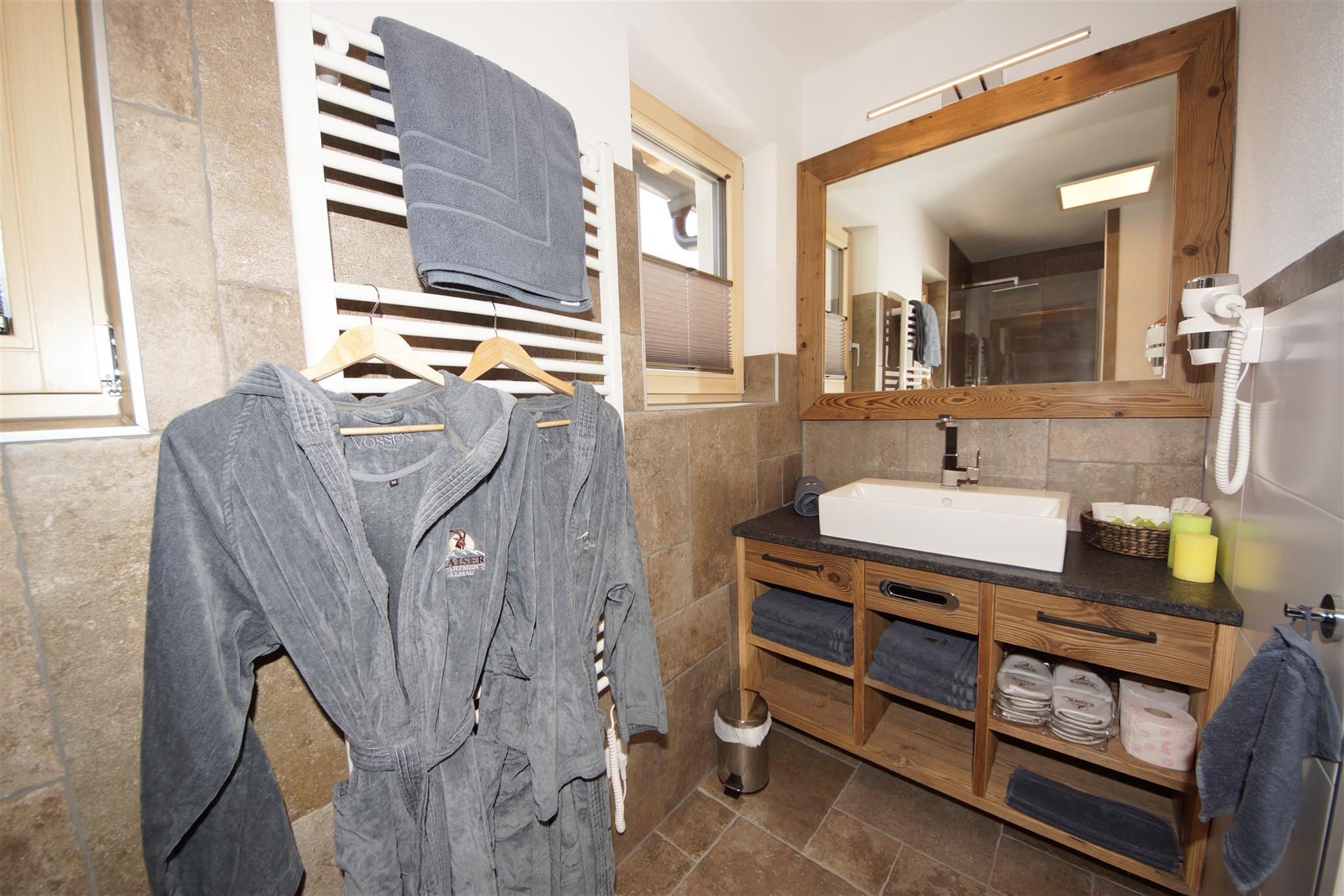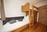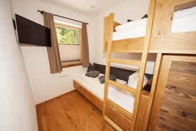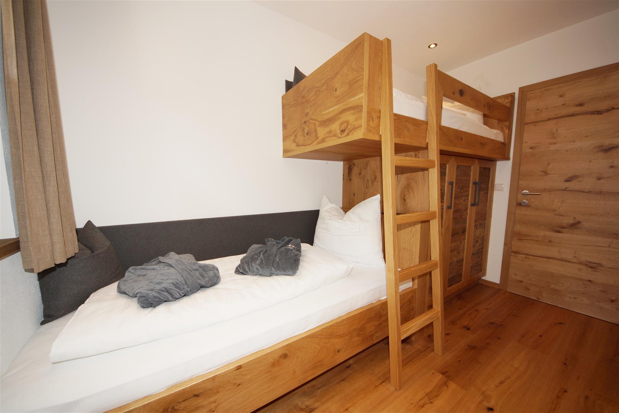 Ein Schlafzimmer mit Blick auf den Wilden Kaiser. Das andere Schlafzimmer hat ein Stockbett, ideal für Kinder. Ein Bad mit Dusche/WC.