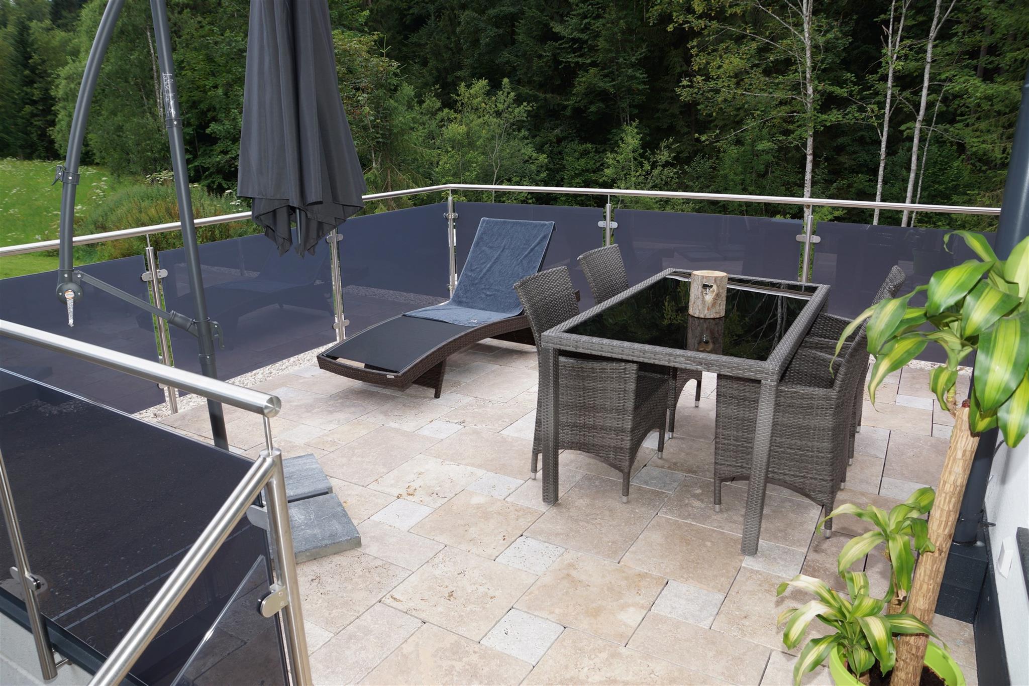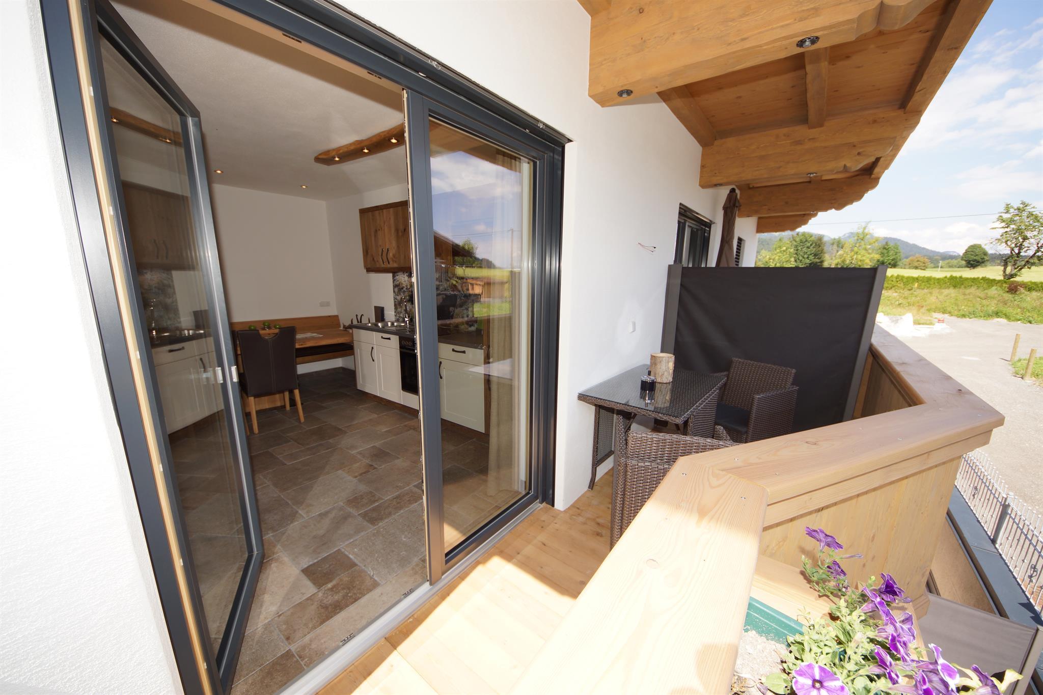 Eine Terrasse mit Blick zum Wilden Kaiser, Kitzbüheler Horn und Hartaiser.